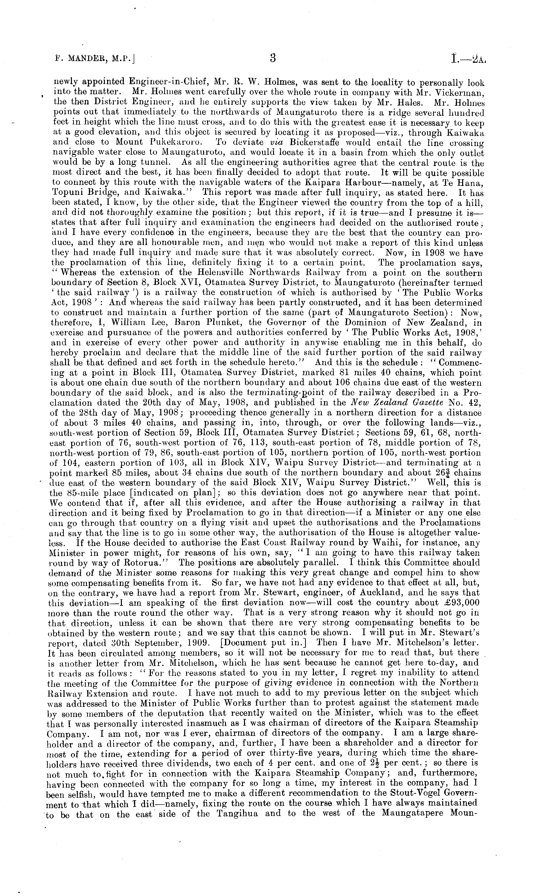 newly appointed Engineer-in-Chief, Mr. li. W. Holmes, was sent to the locality to personally look into the matter. Mr. Holmes went carefully over the whole route in company with Mr. Vickerman, the then District Engineer, and he entirely supports the view taken by Mr. Hales. Mr. Holmes points out that immediately to the northwards of Maungaturoto there is a ridge several hundred feet in height which the line must cross, and to do this with the greatest ease it is necessary to keep at a good elevation, and this object is secured by locating it as proposed—viz., through Kaiwaka and close to Mount Pukekaroro. To deviate via Bickerstaffe would entail the line crossingnavigable water close to Maungaturoto, and would locate it in a basin from which the only outlet would be by a long tunnel. As all the engineering authorities agree that the central route is the most direct and the best, it has been finally decided to adopt that route. It will be quite possible to connect by this route with the navigable waters of the Kaipara Harbour —namely, at Te Hana, Topuni Bridge, and Kaiwaka." This report was made after full inquiry, as stated here. It has been stated, I know, by the other side, that the Engineer viewed the country from the top of a hill, and did not thoroughly examine the position; but this report, if it is true—and I presume it is— states that after full inquiry and examination the engineers had decided on the authorised route, and I have every confidence in the engineers, because they are the best that the country can produce, and they are all honourable men, and men who would not make a report of this kind unless they had made full inquiry and made sure that it was absolutely correct. Now, in 1908 we have the proclamation of this line, definitely fixing it to a certain point. The proclamation says, " Whereas the extension of the Helensville Northwards Railway from a point on the southern boundary of Section 8, Block XVI, Otamatea Survey District, to Maungaturoto (hereinafter termed ' the said railway ') is a railway the construction of which is authorised by ' The Public Works Act, 1908 ' : And whereas the said railway has been partly constructed, and it has been determined to construct and maintain a further portion of the same (part of Maungaturoto Section) : Now, therefore, 1, William Lee, Baron Plnnket, the Governor of the Dominion of New- Zealand, in exercise and pursuance of the powers and authorities conferred by ' The Public Works Act, 1908,' and in exercise of every other power and authority in anywise enabling me in this behalf, do hereby proclaim and declare that the middle line of the said further portion of the said railway shall be that defined and set forth in the schedule hereto." And this is the schedule : " Commencing at a point in Block 111, Otamatea Survey District, marked 81 miles 40 chains, which point is about one chain due south of the northern boundary and about 106 chains due east of the western boundary of the said block, and is also the torininating-Doint of the railway described in a Proclamation dated the 20th day of May, 1908, and published in the New Zealand Gazette No. 42, of the 28th day of May, 1908; proceeding thence generally in a northern direction for a distance of about, 3 miles 40 chains, and passing in, into, through, or over the following lands—viz., south-west portion of Section 59, Block 111, Otamatea Survey District; Sections 59, 61, 68, northeast, portion of 76, south-west portion of 76, 113, south-east portion of 78, middle portion of 78, north-west portion of 79, 86, south-east portion of 105, northern portion of 105, north-west portion of 104, eastern portion of 103, all in Block XIV, Waipu Survey District —and terminating at a point marked 85 miles, about 34 chains due south of the northern boundary and about 26f chains duo east of the western boundary of the said Block XIV, Waipu Survey District." Well, this is the 85-mile place [indicated on plan]; so this deviation does not go anywhere near that point. We contend that if, after all this evidence, and after the House authorising a railway in that direction and it being fixed by Proclamation to go in that direction —if a Minister or any one else can go through that, country on a ftying visit and upset the authorisations and the Proclamations and say that the line is to go in some other way, the authorisation of the House is altogether valueless. If the House decided to authorise the East Coast Railway round by Waihi, for instance, any Minister in power might, for reasons of his own, say, " I am going to have this railway taken round by way of Rotorua." The positions are absolutely parallel. I think this Committee should demand of the Minister some reasons for making this very great change and compel him to show some compensating benefits from it. So far, we have not had any evidence to that effect at all, but, on the contrary, we have had a report from Mr. Stewart, engineer, of Auckland, and he says that this deviation —I am speaking of the first deviation now —will cost the country about £93,000 more than the route round the other way. That is a very strong reason why it should not go in that direction, unless it can be shown that there are very strong compensating benefits to be obtained by the western route; and we say that this cannot be shown. I will put in Mr. Stewart's report, dated 30th September, f909. [Document put in.] Then I have Mr. Mitchelson's letter. It has been circulated among members, so it will not be necessary for me to read that, but there is another letter from Mr. Mitchelson, which he has sent because he cannot get here to-day, and it reads as follows: "For the reasons stated to you in my letter, I regret my inability to attend the meeting of the Committee for the purpose of giving evidence in connection with the Northern Railway Extension and route. I have not much to add to my previous letter on the subject which was addressed to the Ministe