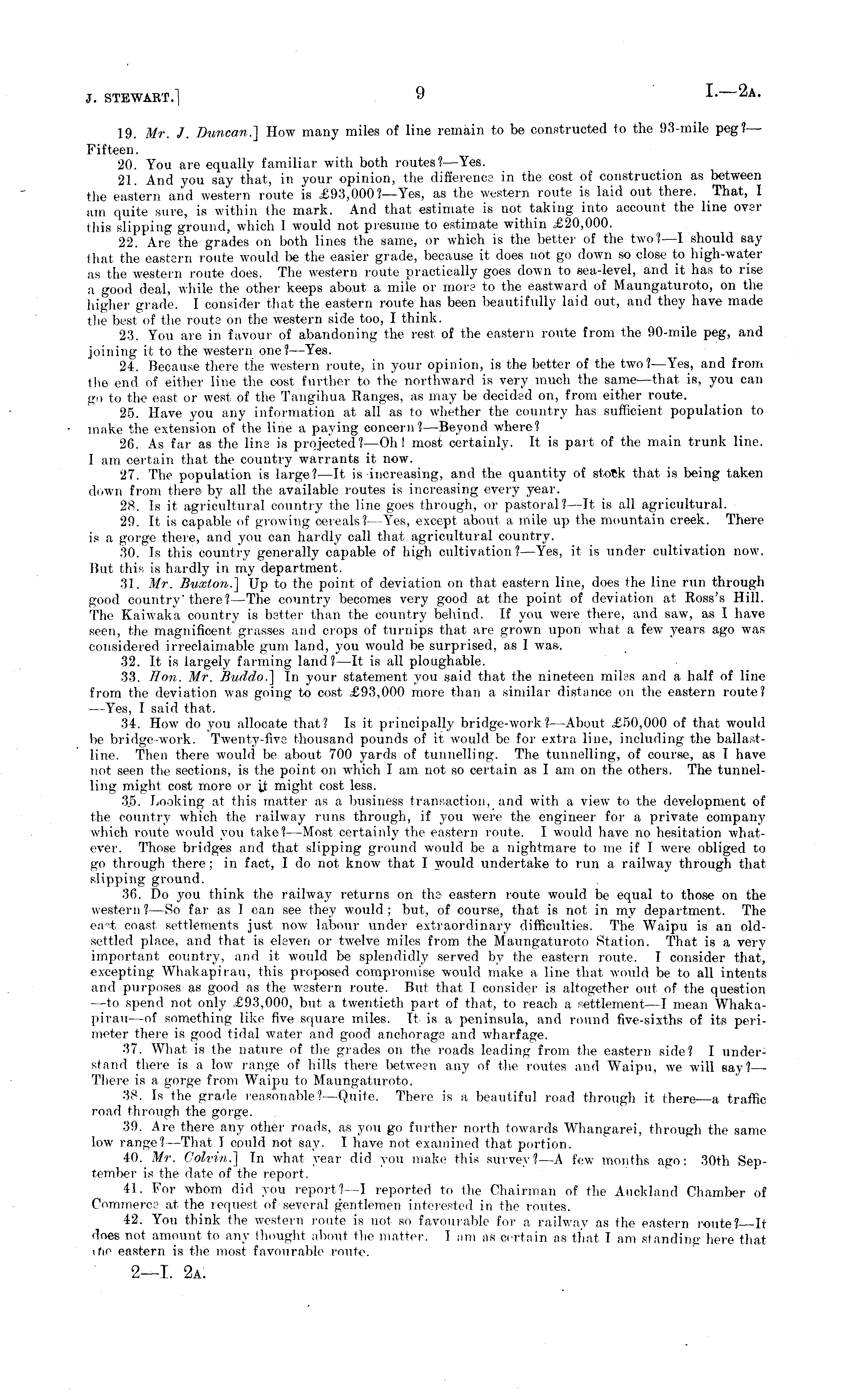 19. Mr. J, Duncan.] How many miles of line remain to be constructed to the 93-mite peg?— Fifteen. 20. You are equally familiar with both routes? —Yes. 21. And you say that, in your opinion, the difference in the cost of construction as between the eastern and western route is £93,000?—Yee, as the western route is laid out there. That, I am quite sure, is within the mark. And that estimate is not taking into account the line over i his slipping ground, which 1 would not presume to estimate within .£20,000. 22. Are the grades on both lines the same, or which is the better of the two?—l should say that the eastern route would lie the easier grade, because it does not go down so close to high-water as the western route does. The western route practically goes down to sea-level, and it has to rise a g 1 deal, while the other keeps about a mile or mora to the eastward of Maungaturoto, on the higher grade. T consider that the eastern route has been beautifully laid out, and they have made the besi of the route on the western side too, I think. 23. You are in favour of abandoning the rest of the eastern route from the 90-mile peg, and joining it to the western one?— Yes. 24. Because there the western route, in your opinion, is the better of the two?— Yes, and from the end of either line the cost further to the northward is very much the same — that is, you can go to the east or west of the Tangihua Ranges, as may be decided on, from either route. 25. Have you any information at all as to whether the country has sufficient population to make the extension of the line a paying concern? —Beyond where? 26. As far as the lino is projected? — Oh I most certainly. It is part of the main trunk line. I am certain that the country warrants it now. 27. The population is large?—lt is increasing, and the quantity of stock that is being taken down from there by all the available routes is increasing every year. 28. Is it agricultural country the line goes through, or pastoral ?—-It is all agricultural. 29. It is capable of growing cereals?- Yes, except about a mile up the mountain creek. There is a gorge there, and you can hardly call that agricultural country. •"SO. Ts this country generally capable of high cultivation?-Yes, it is under cultivation now. But this is hardly in my department. 31. Mr. Btixlon.l Up to the point of deviation on that eastern line, does the line run through good country'there?—The country becomes very good at the point of deviation at Ross's Hill. The Kaiwaka country is batter than the country behind. If you were there, and saw, as I have seen, the magnificent glasses and crops of turnips that arc grown upon what a few years ago was considered irreclaimable gum land, you would be surprised, as I. was. 32. It is largely farming land? —It is all ploughable. 33. linn. Mr. Buddo.] In your statement you said that the nineteen milss and a half of line from the deviation was going to cost £93,000 more than a similar distance on the eastern route? —Yes, I said that. 34. How do you allocate that? Is it principally bridge-work?— About £50,000 of that would lie bridge-work. Twentj'-fivs thousand pounds of it would be fur extra line, including the ballastline. Then there would be about 700 yards of tunnelling. The tunnelling, of course, as I have not seen the sections, is the point on which lam not so certain as I am on the others. The tunnelling might cost more or j,t might cost less. 3/). Looking at this matter as a business transaction, and with a view to the development of the country which the railway runs through, if you were the engineer for a private company which route would you take?--Most certainly the eastern route. I would have no hesitation whatever. Those bridges and that slipping ground would be a nightmare to me if I were obliged to go through there ; in fact, I do not know that I would undertake to run a railway through that slipping ground. 36. Do you think the railway returns on tlra eastern route would be equal to those on the western? —So far as I can see they would; but, of course, that is not in my department. The eat coast settlements just now labour under extraordinary difficulties. The Waipu is an oldsettled place, and that is eleven or twelve miles from the Maungaturoto Station. That is a very important country, and it, would be splendidly served by the eastern route. I consider that, excepting Whakapirau, this proposed compromise would make a line that would be to all intents and purposes as good as the western route. But that I consider is altogether out of the question —to spend not only £93,000, btit a twentieth part of that, io reach a settlement—l mean Whakapirau—of something like five square miles. Tt is a peninsula, and round five-sixths of its perimeter there is good tidal water and good anchorage and wharfage. 37. What is the nature of the grades on the roads leading from the eastern side? I understand there is a low range of hills there between any of the routes and Waipu, we will say?— There is a gorge from Waipu to Maungaturoto. 38. Is the grade reasonable?— Quite! There is a beautiful road through it there —a traffic road through the gorge. 39. Are there any other roads, as you go further north towards Whangarei, through the same low range?— That I could not say. T have not examined that portion. 40. Mr. Colr/ii.] Tn what year did you make this survey?—A few months ago: 30th September is the date of the report. 41. For whom did you report?—l reported to 111< - Chairman of the Auckland Chamber of Commerce at the request of several gentlemen interested in the routes. 42. You think the western route is not so favourable for a railway as the eastern route? It does not amount to any (bought about the matter. Tarn as certain as that lam standing hero that i(io eastern is the most favourable route. 2—l. 2a.