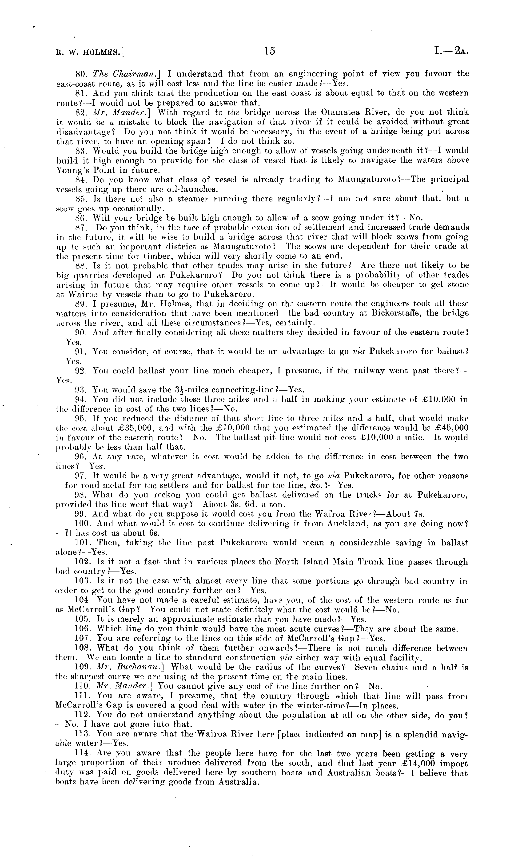 80. The CJiairman.] I understand that from an engineering point of view you favour the east-ooasi route, as it will cost less and the line be easier made? —Yes. 83 . And you think that the production on the east coast is about equal to that on the western route? —I would not be prepared to answer that. 82. Mr. Maiider.] With regard to the bridge across the Otamatea River, do you not think it would be a mistake to block the navigation of that river if it could be avoided without great disadvantage 1 Do you not think it would be necessary, in the event of a bridge being put across that river, to have an opening span?—l do not think so. 83. Would you build the bridge high enough to allow of vessels going underneath it?—l would build it high enough to provide for the class of vessel that is likely to navigate the waters above Young's Point in future. <S4. Do you know what class of vessel is already trading- to Maungaturoto?— The principal vessels going up there are oil-launches. 85. Is there not also a steamer running there regularly? — l am not sure about that, but a scow goes up occasionally. 86. Will your bridge be built high enough to allow of a, scow going under it? —No. (S7. Do you think, in the face of probable extension of settlement and increased trade demands in the future, it will be wise to build a bridge across thai river that will block scows from going up to such an important district as Maungaturoto I — The scows are dependent for their trade at the present time for timber, which will very shortly come to an end. 88. Is it not probable that other trades may arise in the future? Are there not likely to be big quarries developed at Pukekaroro? Do you not think there is a probability of other trades arising in future that may require other vessels, to come up?—lt would be cheaper to get stone at Wairoa by vessels than to go to Pukekaroro. H.). I presume, Mr. Holmes, that in deciding on tha eastern route the engineers took all these matters into consideration that have been mentioned —the bad country at Bickerstaffe, the bridge across the liver, and all these circumstances? —Yes, certainly. !)(). And after finally considering all then' matters they decided in favour of the eastern route? -Yes. 91. You consider, of course, that it would be an advantage to go via Pukekaroro for ballast? - Yes. 92. You could ballast your line much cheaper, I presume, if the railway went past there?— Yes. 93. You would save (he -'U-miles connecting-lino?— Yes. ill. You did not include these three miles and a half in making your estimate of .£lO,OOO in the difference in cost of the two lines? —No. 9."). If you reduced the distance of that short lino to three miles and a half, that would make the co;vt about £35,000, and with the £10,000 that you estimated the difference would !>;■ £45,000 in favour of the eastern route?— No. The ballast-pit line would not cost £10,000 a mile. It would probably be less than half that. 96. At any rate, whatever it cost would be added to the difference in cost between the two lines?- Yes. 97. It would be a very great advantage, would it not, to go via Pukekaroro, for other reasons for road-metal for the settlers and for ballast for the line, &c. ?—Yes. 98. What do you reckon you could get ballast delivered on the trucks for at Pukekaroro, provided the line went that way?— About 3s. 6d. a ton. 99. And what do you suppose it would cost you from the Wairoa River? —About 7s. 1(10. And what would it cost to continue delivering it from Auckland, as you are doing now? —It has cost us about 6s. 101. Then, taking the line past Pukekaroro would mean a considerable saving in ballast alone?— Yes. 102. Is it not a fact that in various places the North Island Main Trunk line passes through bad country? —Yes. 103. Is it not the case with almost every line that some portions go through bad country in order to got to the good country further on?— Yes. 104. You have not made a careful estimate, hava you, of the cost of the western route as far as McCarroll's Gap? You could not state definitely what the cost would be?— No. 105. It is merely an approximate estimate that you have made? —Yes. !()(). Which line do you think would have the most acute curves?—Thay are about the same. 107. You are referring to the lines on this side of McCarroll's Gap?— Yes. 108. What do you think of them further onwards?— There is not much difference lietween them. We can locate a line to standard construction via either way with equal facility. 109. Mr. Buchanan .] What would be the radius of the curves?— Seven chains and a half is the sharpest curve we are using at the present time on the main lines. 110. Mr. Mander.] You cannot give any cost of the line further on? —No. 111. You are aware, I presume, that the country through which that line will pass from McCarroll's Gap is covered a good deal with water in the winter-time?—ln places. 112. You do not understand anything about the population at all on the other side, do you? —No, I have not gone into that. 113. You are aware that theWairoa River here [place indicated on map] is a splendid navigable water?— Yes. 114. Are you aware that the people here have for the last two years been getting a very large proportion of their produce delivered from the south, and that last year £14,000 importduty was paid on goods delivered here by southern boats and Australian boats?—T believe that boats have been delivering goods from Australia.