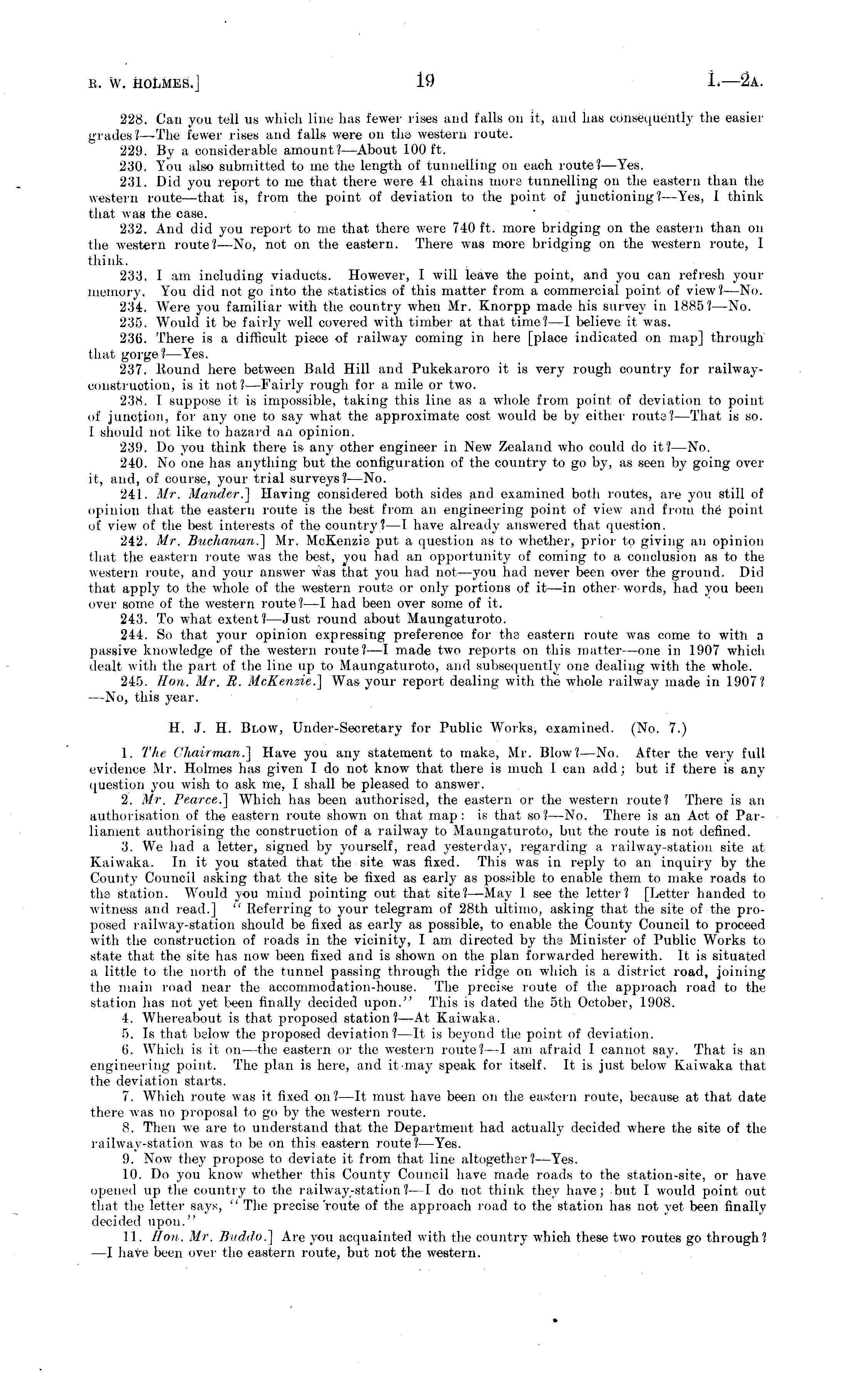 228. Can you toll us which line has fewer rises and falls mi it, ami has consequently the easier grades? The fewer rises and falls were on the western route. 22!). By a considerable amount?— About 100 ft. 230, You also submitted to me the length of tunnelling on each route?— Yes. 231. Did you report to me that there were 41 chains more tunnelling on the eastern than the western route —that is, from the point of deviation to the point of junctioning? —Yes, 1 think that was the case. 2-'S2. And did you report to me that there were 740 ft. more bridging on the eastern than on the western route?—No, not on the eastern. There was more bridging on the western route, 1 think. 238, 1 am including viaducts. However, I will leave the point, and you can refresh your memory. You did not go into the statistics of this matter from a commercial point of view? —No. 2-J4. Were you familiar with the country when Mr. Knorpp made his survey in 1885?— No. 235. Would it be fairly well covered with timber at that time?—l believe it was. -!.')(). There is a difficult piece of railway coming in here [place indicated on map] through that gorge?— Yes. 237. Hound here between Bald Hill and Pukekaroro it is very rough country for railwayconstruction, is it not?— Fairly rough for a mile or two. 238. 1 suppose it is impossible, taking this line as a whole from point of deviation to point of junction, for any one to say what the approximate cost would be by either route?— That is so. I should not like to hazard an opinion. 239. Do you think there is any other engineer in New Zealand who could do it?— No. 240. Xo one has anything but the configuration of the country to go by, as seen by going over it, and, of course, your trial surveys?— No. 241. Mr. Mantler.\ Having considered both sides and examined both routes, are you still of opinion that the eastern route is the best from an engineering point of view and from the point of view of the best interests of the country?—l have already answered that question. 242. Mr. Buchanan.] Mr. McKenzie put a question as to whether, prior to giving an opinion that the eastern route was the best, you had an opportunity of coming to a conclusion as to the western route, and your answer was that you had not —3 r ou had never been over the ground. Did that apply to the whole of the western route or only portions of it—in other- words, had you been over some of the western route?—l had been over some of it. 243. To what extent? —Just round about Maungaturoto. ■ill. So that your opinion expressing preference for the eastern route was come to with a passive knowledge of the western route?—l made two reports on this matter —one in 1907 which dealt with the part of the line up to Maungaturoto, and subsequently one dealing with the whole. 245. lion. Mr. R. McKenzie.] Was your report dealing with the whole railway made in 1907? —No, this year. H. J. H. Blow, Under-Secretary for Public Works, examined. (No. 7.) 1. The <'luurinan.~\ Have you any statement to make, Mr. Blow?— No. After the very full evidence Mr. Holmes has given I do not know that there is much 1 can add; but if there is any question you wish to ask me, I shall be pleased to answer. 2. Mr. Pearce.] Which has been authorised, the eastern or the western route? There is an authorisation of the eastern route shown on that map: is that so?— No. There is an Act of Parliament authorising the construction of a railway to Maungaturoto, but the route is not denned. •'i. We had a letter, signed by yourself, read yesterday, regarding a railway-station site at Kaiwaka. In it you stated that the site was fixed. This was in reply to an inquiry by the County Council asking that the site be fixed as early as possible to enable them to make roads to the station. Would you mind pointing out that site? —May 1 see the letter ? [Letter handed to witness and read.] " Referring to your telegram of 28th ultimo, asking that the site of the proposed railway-station should be fixed as early as possible, to enable the County Council to proceed with the construction of roads in the vicinity, I am directed by the Minister of Public Works to state that the site has now been fixed and is shown on the plan forwarded herewith. It is situated a little to the north of the tunnel passing through the ridge on which is a district road, joining the main road near the accommodation-house. The precise route of the approach road to the station has not yet been finally decided upon." Tins is dated the sth October, 1908. 4. Whereabout is that proposed station? —At Kaiwaka. 5. Is that below the proposed deviation? —It is beyond the point of deviation. (i. Which is it on— the eastern or the western route?—l am afraid I cannot say. That is an engineering point. The plan is here, and it-may speak for itself. It is just below Kaiwaka that the deviation starts. 7. Which route was it fixed on?—lt must have been on the eastern route, because at that date there was no proposal to go by the western route. 8. Then we are to understand that the Department had actually decided where the site of the railway-station was to be on this eastern route?—Y r es. I). Now they propose to deviate it from that line altogether?— Yes. 10. Do you know whether this County Council have made roads to the station-site, or have opened up the country to the railway-station I —l do not think they have; but I would point out that the letter says, " The precise route of the approach road to the station has not yet been finally decided upon." 11. Son. Mr. Buddo."\ Are you acquainted with the country which these two routes go through? —I have been over the eastern route, but not the western.