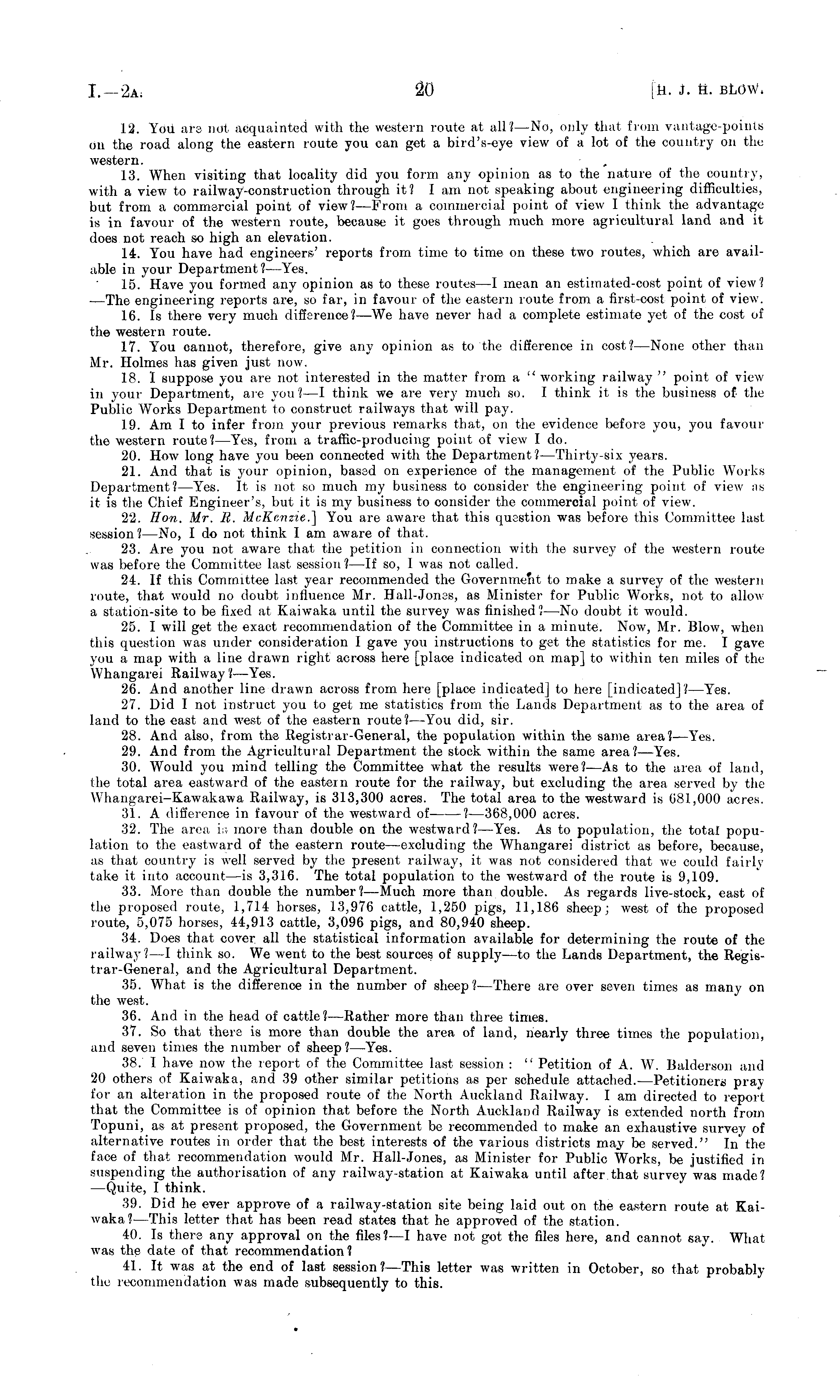 12. Yoit are not acquainted with the western route at all? — No, only that from vantage-points on the road along the eastern route you can get a bird's-eye view of a lot of the country on the western. 13. When visiting that locality did you form any opinion as to the nature of the country, with a view to railway-construction through it? 1 am not speaking about engineering difficulties, but from a commercial point of view? —From a commercial point of view 1 think the advantage is in favour of the western route, because it goes through much more agricultural land and it does not reach so high an elevation. 14. You have had engineers' reports from time to time on these two routes, which are available in your Department?— Yes. 15. Have you formed any opinion as to these routes —1 mean an estiinated-cost point of view? —The engineering reports are, so far, in favour of the eastern route from a first-cost point of view. 16. Is there very much difference? —We have never had a complete estimate yet of the cost of the western route. 17. You cannot, therefore, give any opinion as to the difference in cost?— None other than Mr. Holmes has given just now. 18. I suppose you are not interested in the matter from a " working railway " point of view in }-our Department, are you?—l think we are very much so. I think it is the business of the Public Works Department to construct railways that will pay. 19. Am I to infer from your previous remarks that, on the evidence before you, you favour the western route?— Yes, from a traffic-producing point of view I do. 20. How long have you been connected with the Department?— Thirty-six years. 21. And that is your opinion, basad on experience of the management of the Public Works Department?— Yes. It is not so much my business to consider the engineering point of view en it is the Chief Engineer's, but it is my business to consider the commercial point of view. 22. Hon. Mr. B. McKcnzit.\ You are aware that this question was before this Committee last session? —No, I do not think I am aware of that. 23. Are you not aware that the petition in connection witli the survey of the western route was before the Committee last session? —If so, I was not called. 24. If this Committee last year recommended the Government to make a survey of the western route, that would no doubt influence Mr. Hall-Jonas, as Minister for Public Works, not to allow a station-site to be fixed at Kaiwaka until the survey was finished?—No doubt it would. 25. I will get the exact recommendation of the Committee in a minute. Now, Mr. Blow, when this question was under consideration I gave you instructions to get the statistics for me. I gave you a map with a line drawn right across here [place indicated on map] to within ten miles of the Whangarei Railway?— Yes. 26. And another line drawn across from here [place indicated] to here [indicated]? —Yes. 27. Did I not instruct you to get me statistics from the Lands Department as to the area of land to the east and west of the eastern route? —You did, sir. 28. And also, from the Registrar-General, the population within the same area?— Yes. 29. And from the Agricultural Department the stock within the same area? —Yes. 30. Would you mind telling the Committee what the results were?—As to the area of land, the total area eastward of the eastern route for the railway, but excluding the area served by the Whangarei— Kawakawa Railway, is 313,300 acres. The total area to the westward is 081,000 acres. 31. A difference in favour of the westward of ?—368,000 acres. 32. The area i:; more than double on the westward? —Yes. As to population, the total population to the eastward of the eastern route —excluding the Whangarei district as before, because, as that country is well served by the present railway, it was not considered that we could fairly take it into account —is 3,316. The total population to the westward of the route is 9,109. 33. More than double the number?— Much more than double. As regards live-stock, east of the proposed route, 1,714 horses, 13,976 cattle, 1,250 pigs, 11,186 sheep; west of the proposed route, 5,075 horses, 44,913 cattle, 3,096 pigs, and 80,940 sheep. 34. Does that cover all the statistical information available for determining the route of the railway? —I think so. We went to the best sources of supply—to the Lands Department, the Regis-trar-General, and the Agricultural Department. 35. What is the difference in the number of sheep?— There are over seven times as many on the west. 36. And in the head of cattle? —Rather more than three times. 37. So that there is more than double the area of land, nearly three times the population, and seven times the number of sheep? —Yes. 38. I ha.ye now the report of the Committee last session : " Petition of A. W. Balderson and 20 others of Kaiwaka, and 39 other similar petitions as per schedule attached.—Petitioners pray for an alteration in the proposed route of the North Auckland Railway. I am directed to report that the Committee is of opinion that before the North Auckland Railway is extended north from Topuni, as at present proposed, the Government be recommended to make an exhaustive survey of alternative routes in order that the best interests of the various districts may be served." In the face of that recommendation would Mr. Hall-Jones, as Minister for Public Works, be justified in suspending the authorisation of any railway-station at Kaiwaka until after that survey was made? —Quite, I think. 39. Did he ever approve of a railway-station site being laid out on the eastern route at Kaiwaka?—This letter that has been read states that he approved of the station. 40. Is there any approval on the files? —I have not got the files here, and cannot say. What was the date of that recommendation ? 41. It was at the end of last session?— This letter was written in October, so that probably the recommendation was made subseque