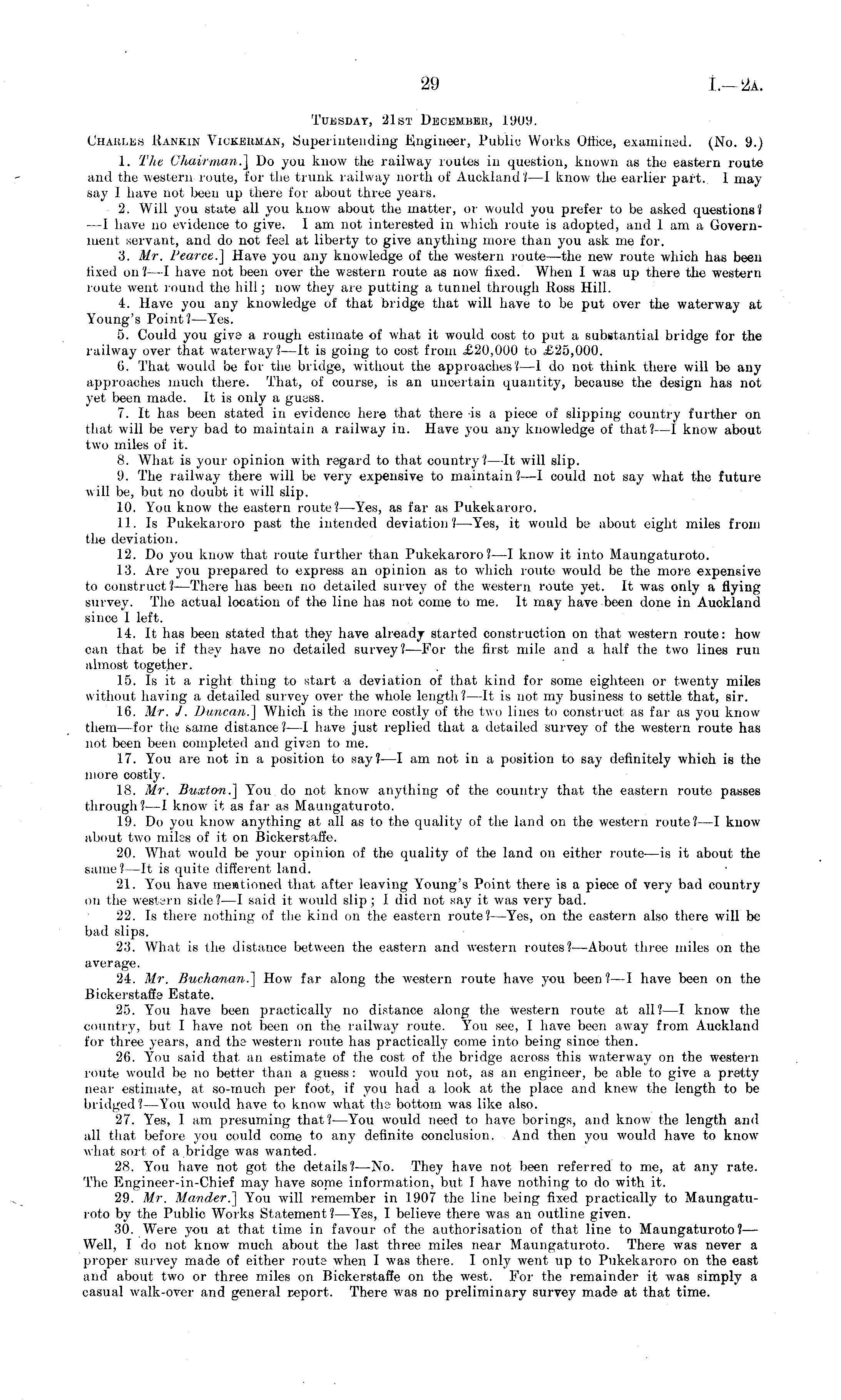 Tuesday, 21st December, 190!). Charles Rankin Vicjkerman, Superintending Engineer, Public Works Ollice, examined. (No. 9.) 1. The Chairman.] Do you know the railway routes in question, known as the eastern route and the western route, for the trunk railway north of Auckland'/ —1 know the earlier part. 1 may say 1 have not been up there for about three years. 2. Will you state all you know about the matter, or would you prefer to be asked questions ? —I have no evidence to give. lam not interested in which route is adopted, and lam a Government servant, and do not feal at liberty to give anything more than you ask me for. 3. Mr. l'earce.\ Have you any knowledge of the western route —the new route which has been fixed on'/ —I have not been over the western route as now fixed. When 1 was up there the western route went round the hill; now they are putting a tunnel through lioss Hill. 4. Have you any knowledge of that bridge that will have to be put over the waterway at Young's Point?— Yes. 5. Could you give a rough estimate of what it would cost to put a substantial bridge for the railway over that waterway?—lt is going to cost from £20,000 to £25,000. 0. That would be for the bridge, without the approaches?—l do not think there will be any approaches much there. That, of course, is an uncertain quantity, because the design has not yet been made. It is only a guess. 7. It has been stated in evidence here that there is a piece of slipping country further on that will be very bad to maintain a railway in. Have you any knowledge of that? —I know about two miles of it. 8. What is your opinion with regard to that country?—lt will slip. 9. The railway there will be very expensive to maintain? —I could not say what the future will be, but no doubt it will slip. 10. You know the eastern route? —Yes, as far as Pukekaroro. 11. Is Pukekaroro past the intended deviation?— Yes, it would be about eight miles from the deviation. 12. Do you know that route further than Pukekaroro?—l know it into Maungaturoto. 13. Are you prepared to express an opinion as to which route would be the more expensive t<> construct?— There has been no detailed survey of the western route yet. It was only a flying survey, The actual location of the line has not come to me. It may have been done in Auckland since I left. 14. It has been stated that they have already started construction on that western route: how oan that be if they have no detailed survey?— For the first mile and a half the two lines run almost together. 15. Is it a right thing to start a deviation of that kind for some eighteen or twenty miles without having a detailed survey over the whole length? —It is not my business to settle that, sir. 16. Mr. I. Duncan.] Which is the more cosily of the two lines to construct as far as you know them —for Hie same distance?—l have just replied that a detailed survey of the western route has not been been completed and given to me. 17. You are not in a position to say?—l am not in a position to say definitely which is the more costly. 18. Mr. Buxt(rn.] You do not know anything of the country that the eastern route passes through?—l know it as far as Maungaturoto. 19. Do you know anything at all as to the quality of the land on the western route? —I know about two mibs of it on Bickerst iffe. 20. What would be your opinion of the quality of the land on either route—is it about the same?—lt is quite different land. 21. You have mentioned that after leaving Y r oung's Point there is a piece of very bad country on the western side? —1 said it would slip ; I did not say it was very bad. 22. Is there nothing of the kind on the eastern route?— Yes, on the eastern also there will be bad slips. 23. What is the distance between the eastern and western routes?— About three miles on the average. 24. Mr. Buchanan.] How far along the western route have you been?—l have been on the Bickerstaffe Estate. 25. You have been practically no distance along the western route at all?—I know the country, but I have not been on the railway route. You see, I have been away from Auckland for three years, and the western route has practically come into being since then. 26. Y 7 ou said that an estimate of the cost of the bridge across this waterway on the western route would be no better than a guess: would you not, as an engineer, be able to give a pretty near estimate, at so-much per foot, if you had a look at the place and knew , the length to be bridged? —You would have to know what the bottom was like also. 27. Yes, I am presuming that? —You would need to have borings, and know the length and all that before you could come to any definite conclusion. And then you would have to know what sort of a bridge was wanted. 28. You have not got the details?— No. They have not been referred to me, at any rate. The Engineer-in-Chief may have some information, but I have nothing to do with it. 29. Mr. Mtinder.] You will remember in 1907 the line being fixed practically to Maungaturoto by the Public Works Statement?— Yes, I believe there was an outline given. 30. Were you at that time in favour of the authorisation of that line to Maungaturoto?— Well, I do not know much about the last three miles near Maungaturoto. There was never a proper survey made of either route when I was there. I only went up to Pukekaroro on the east and about two or three miles on Bickerstaffe on the west. For the remainder it was simply a casual walk-over and general report. There was no preliminary survey made at that time.