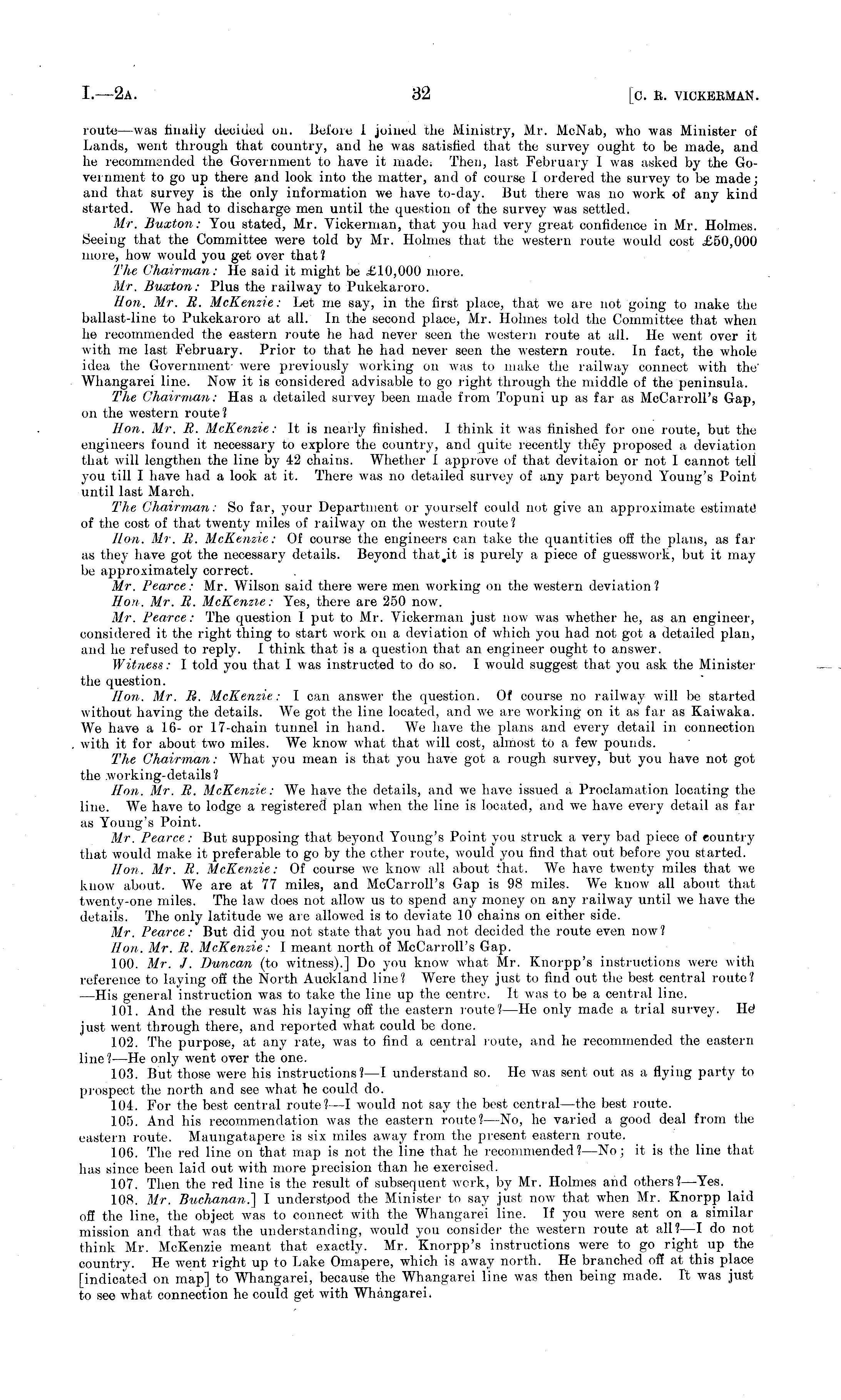 route —was nnaliy decided on. Before 1 joined the Ministry, Mr. MeNab, who was Minister of Lands, went through that country, and he was satisfied that the survey ought to be made, and he recommended the Government to have it made; Then, last February I was asked by the Government to go up there and look into the matter, and of course I ordered the survey to be made; and that survey is the only information we have to-day. But there was no work of any kind started. We had to discharge men until the question of the survey was settled. Mr. Buxton: You stated, Mr. Vickerman, that you had very great confidence in Mr. Holmes. Seeing that the Committee were told by Mr. Holmes that the western route would cost £50,000 more, how would you get over that? The Chairman: He said it might be £10,000 more. Mr. Buxton: Plus the railway to Pukekaroro. Hon. Mr. B. McKenzie: Let me say, in the first place, that wo are not going to make the ballast-line to Pukekaroro at all. In the second place, Mr. Holmes told the Committee that when he recommended the eastern route he had never seen the western route at all. He went over it with me last February. Prior to that he had never seen the western route. In fact, the whole idea the Government were previously working on was to make the railway connect with the' Whangarei line. Now it is considered advisable to go right through the middle of the peninsula. The Chairman: Has a detailed survey been made from Topuni up as far as McCarroll's Gap, on the western route? Hon. Mr. B. McKenzie: It is nearly finished. 1 think it was finished for one route, but the engineers found it necessary to explore the country, and cjuite recently they proposed a deviation that will lengthen the line by 42 chains. Whether 1 approve of that devitaion or not I cannot tell you till 1 have had a look at it. There was no detailed survey of any part beyond Young's Point until last March. The Chairman: So far, your Department or yourself could not give an approximate estimate , of the cost of that twenty miles of railway on the western route? Hon. Mr. It. McKenzie: Of course the engineers can take the quantities off the plans, as far as they have got the necessary details. Beyond that.it is purely a, piece of guesswork, but it may be approximately correct. Mr. Pearce: Mr. Wilson said there were men working on the western deviation? Hon. Mr. B. McKenzie: Yes, there are 250 now. Mr. Pearce: The question 1 put to Mr. Vickerman just now was whether he, as an engineer, considered it the right thing to start work on a deviation of which you had not got a detailed plan, and he refused to reply. I think that is a question that an engineer ought to answer. Witness: I told you that I was instructed to do so. I would suggest that you ask the Minister the question. Hon. Mr. B. McKenzie: I can answer the question. Of course no railway will be started without having the details. We got the line located, and we are working on it as far as Kaiwaka. We have a 16- or 17-chain tunnel in hand. We have the plans and every detail in connection with it for about two miles. We know what that will cost, almost to a few pounds. The Chairman: What you mean is that you have got a rough survey, but you have not got the .working-details? Hon. Mr. B. McKenzie: We have the details, and we have issued a Proclamation locating the line. We have to lodge a registered plan when the line is located, and we have evevy detail as far as Young's Point. Mr. Pearce: But supposing that beyond Young's Point you struck a very bad piece of country that would make it preferable to go by the ether route, would you find that out before you started. Hon. Mr. B. McKenzie: Of course we know all about that. We have twenty miles that we know about. We are at 77 miles, and McCarroll's Gap is 98 miles. We know all about that twenty-one miles. The law does not allow us to spend any money on any railway until we have the details. The only latitude we are allowed is to deviate 10 chains on either side. Mr. Pearce: But did you not state that you had not decided the route even now? Hon. Mr. B. McKenzie: I meant north of McCarroll's Gap. 100. Mr. J. Duncan (to witness).] Do you know what Mr. Knorpp's instructions were with reference to laying off the North Auckland line? Were they just to find out the best central route? —His general instruction was to take the line up the centre. It was to be a central line. 101. And the result was his laying off the eastern route? —He only made a trial survey. He , just went through there, and reported what could be done. 102. The purpose, at any rate, was to find a central route, and he recommended the eastern line ?—He only went over the one. 103. But those were his instructions? —I understand so. He was sent out as a flying party to prospect the north and see what he could do. 104. For the best central route? —I would not say the best central —the best route. 105. And his recommendation was the eastern route? —No, he varied a good deal from the eastern route. Maungatapere is six miles away from the present eastern route. 106. The red line on that map is not the line that he recommended? —No; it is the line that has since been laid out with more precision than he exercised. 107. Then the red line is the result of subsequent work, by Mr. Holmes and others?— Yes. 108. Mr. Buchanan.'] I understood the Minister to say just now that when Mr. Knorpp laid off the line, the object was to connect with the Whangarei line. If you were sent on a similar mission and that was the understanding, w r ould you consider the western route at all? —I do not think Mr. McKenzie meant that exactly. Mr. Knorpp's instructions were to go right up the country. He went right up to Lake Omapere, which is away north. Ho branched off at this place [indicated on map] to Whangarei, because the Whangarei line was then being made. Tt was just to see what connection he could get with Whangarei.