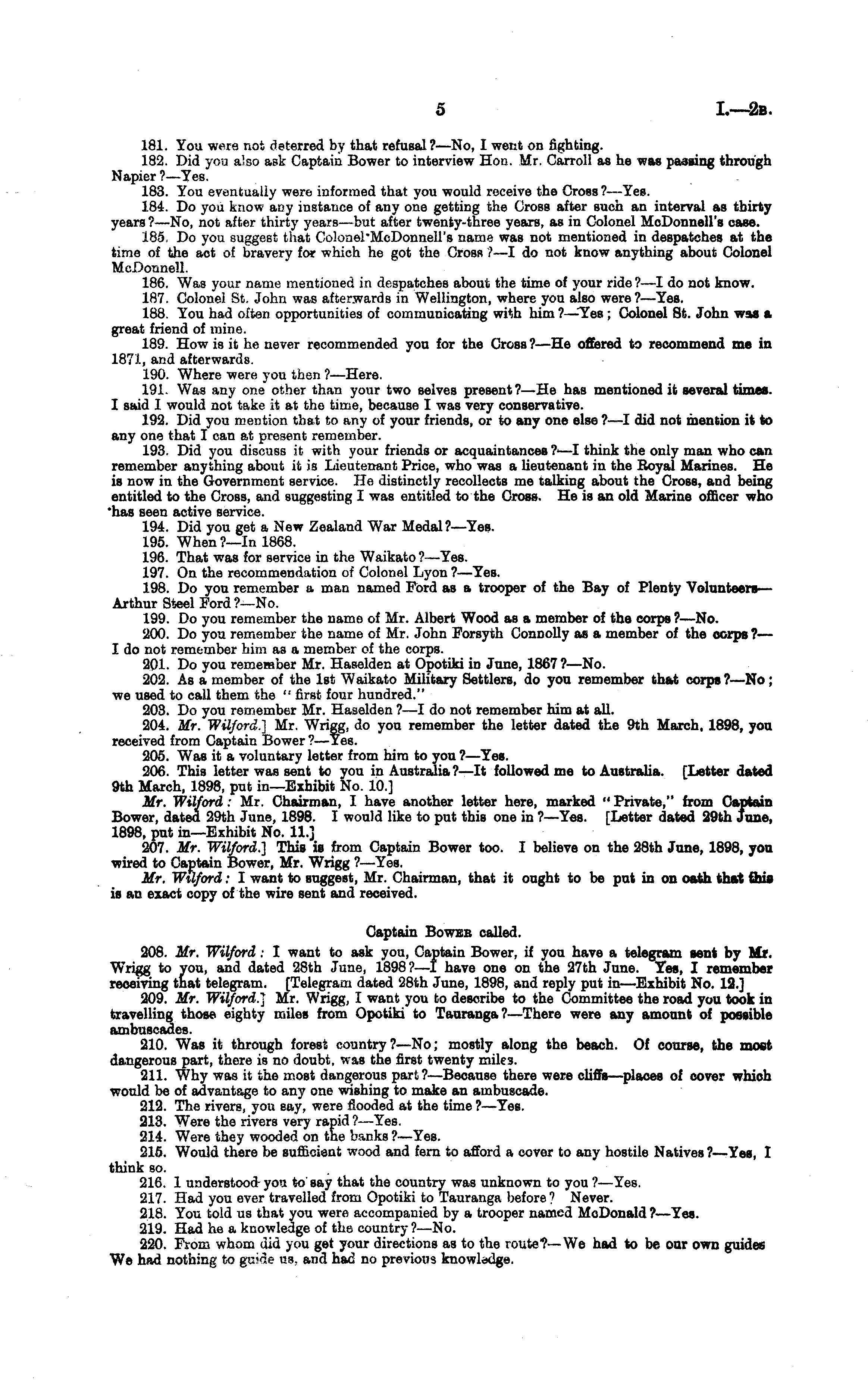 181. You were not deterred by that refusal?—No, I went on fighting. 182. Did you also ask Captain Bower to interview Hon. Mr. Carroll as he was passing through Napier ?—Yes. 183. You eventually were informed that you would receive the Cross ?—Yee. 184. Do you know any instance of any one getting the Cross after such an interval as thirty years ?—No, not after thirty years—but after twenty-three years, as in Colonel McDonnell's case. 185. Do you suggest that Colonel'McDonnell's name was not mentioned in despatches at the time of the act of bravery for which he got the Cross ?—I do not know anything about Colonel McDonnell. 186. Was your name mentioned in despatches about the time of your ride ?—I do not know. 187. Colonel St. John was afterwards in Wellington, where you also were?— Yes. 188. You had often opportunities of communicating with him I— Tee ; Colonel St. John was a great friend of mine. 189. How is it he never recommended you for the Cross ?—He offered to recommend me in 1871, and afterwards. 190. Where were you then ?—Here. 191. Was any one other than your two selves present?—He has mentioned it several times. I said I would not take it at the time, because I was very conservative. 192. Did you mention that to any of your friends, or to any one else ?—I did not mention it to any one that I can at present remember. 193. Did you discuss it with your friends or acquaintances ?< —l think the only man who can remember anything about it is Lieutenant Price, who was a lieutenant in the Royal Marines. He is now in the Government service. He distinctly recollects me talking about the Cross, and being entitled to the Cross, and suggesting I was entitled to the Cross. He is an old Marine officer who 'has Been active service. 194. Did you get a New Zealand War Medal ?—Yes. 195. When?—ln 1868. 196. That was for service in the Waikato ?—Yes. 197. On the recommendation of Colonel Lyon ?—Yes. 198. Do you remember a man named Ford as a trooper of the Bay of Plenty Volunteers— Arthur Steel Ford ?—No. 199. Do you remember the name of Mr. Albert Wood as a member of the corps ?—No. 200. Do you remember the name of Mr. John Forsyth Connolly as a member of the corps ?— I do not remember him as a member of the corps. 201. Do you remember Mr. Haselden at Opotiki in June, 1867 ?—No. 202. As a member of the Ist Waikato Military Settlers, do you remember that corps?—No; we used to call them the " first four hundred." 203. Do you remember Mr. Haselden ?—I do not remember him at all. 204. Mr. Wilford.] Mr. Wrigg, do you remember the letter dated the 9th March, 1898, you received from Captain Bower ?—Yes. 205. Was it a voluntary letter from him to you ?—Yes. 206. This letter was sent to you in Australia?—lt followed me to Australia. [Letter dated 9th March, 1898, put in—Exhibit No. 10.] Mr. Wilford: Mr. Chairman, I have another letter here, marked " Private," from Captain Bower, dated 29th June, 1898. I would like to put this one in ?—Yes. [Letter dated 29th June, 1898, put in—Exhibit No. 11.] 207. Mr. Wilford.] This ie from Captain Bower too. I believe on the 28th Jane, 1898, you wired to Captain Bower, Mr. Wrigg ?—Yes. Mr. Wilford: I want to suggest, Mr. Chairman, that it ought to be put in on oath that Sue is at? exact copy of the wire sent and received. Captain Boweb called. 208. Air. Wilford: I want to ask you, Captain Bower, if you have a telegram sent by Mr. Wrigg to you, and dated 28th June, 1898?— I have one on the 27th June. Yes, I remember receiving that telegram. [Telegram dated 28th June, 1898, and reply put in—Exhibit No. 12.] 209. Mr. Wilford.] Mr. Wrigg, I want you to describe to the Committee the road you took in travelling those eighty miles from Opctiki to Tauranga?—There were any amount of possible ambuscades. 210. Was it through forest country?—No; mostly along the beach. Of course, the most dangerous part, there is no doubt, was the first twenty mile 3. 211. Why was it the most dangerous part?— Because there were cliffs—places of cover which would be of advantage to any one wishing to make an ambuscade. 212. The rivers, yon say, were flooded at the time ?—Yes. 213. "Were the rivers very rapid?— Yes. 214. Were they wooded on the banks ?—Yes. 215. Would there be sufficient wood and fern to afford a cover to any hostile Natives ?—Yes, I think so. 216. 1 understood- you to say that the country was unknown to you ?—Yes. 217. Had you ever travelled from Opotiki to Tauranga before? Never. 218. You told us that you were accompanied by a trooper named McDonald ?—Yes. 219. Had he a knowledge of the country?— No. 220. From whom did you get your directions as to the route , ?—We had to be our own guides We had nothing to guide us, and had no previous knowledge.