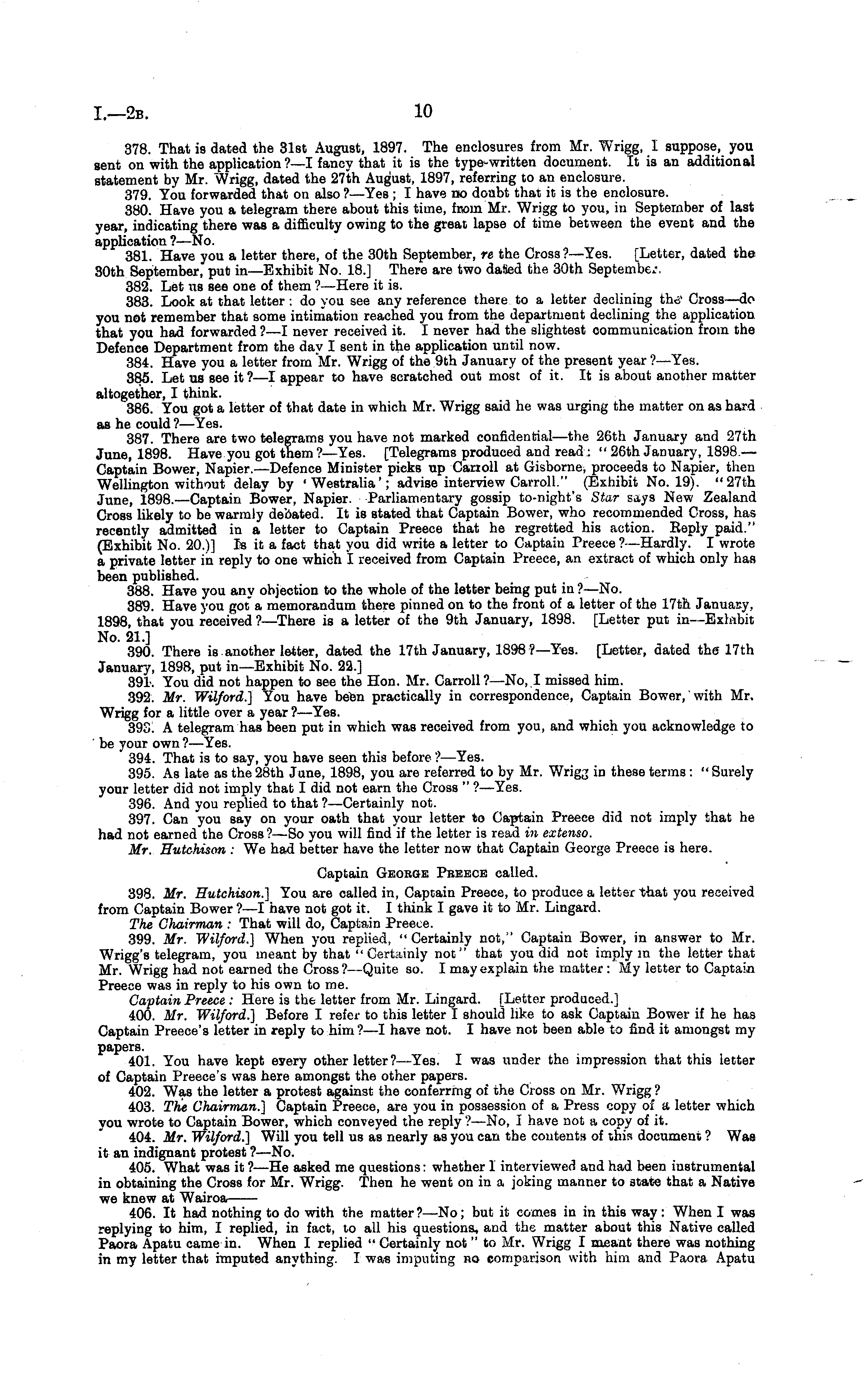 378. That is dated the 31st August, 1897. The enclosures from Mr. Wrigg, 1 suppose, you sent on with the application?—l fancy that it is the type-written document. It is an additional statement by Mr. Wrigg, dated the 27th August, 1897, referring to an enclosure. 379. You forwarded that on also ?—Yes ; I have no doubt that it is the enclosure. 380. Have you a telegram there about this time, fcom Mr. Wrigg to you, in September of last year, indicating there was a difficulty owing to the great lapse of time between the event and the application ?—No. 381. Have you a letter there, of the 30th September, re the Crose ?—Yes. [Letter, dated the 30th September, put in—Exhibit No. 18.] There are two dated the 30th September. 382. Let us see one of them ?—Here it is. 383. Look at that letter : do you see any reference there to a letter declining the . Cross—do you not remember that some intimation reached you from the department declining the application that you had forwarded ?—I never received it. I never had the slightest communication from the Defence Department from the day I sent in the application until now. 384. Have you a letter from Mr. Wrigg of the 9th January of the present year ?—Yes. 385. Let us see it?—l appear to have scratched out most of it. It is about another matter altogether, I think. 386. You got a letter of that date in which Mr. Wrigg said he was urging the matter on as hard as he could ?—Yes. 387. There are two telegrams you have not marked confidential—the 26th January and 27th June, 1898. Have you got them ?—Yes. [Telegrams produced and read: " 26th January, 1898.— Captain Bower, Napier.—Defence Minister picks up Carioll at Gisborne, proceeds to Napier, then Wellington without delay by 'Westralia'; advise interview Carroll." (Exhibit No. 19). "27th June, 1898.—Captain Bower, Napier. Parliamentary gossip to-night's Star says New Zealand Cross likely to be warmly debated. It is stated that Captain Bower, who recommended Cross, has recently admitted in a letter to Captain Preece that he regretted his action. Keply paid." (Exhibit No. 20.)] Is it a fact that you did write a letter to Captain Preece ?—Hardly. I wrote a private letter in reply to one which I received from Captain Preece, an extract of which only has been published. 388. Have you any objection to the whole of the letter being put in ?—No. 389. Have you got" a memorandum there pinned on to the front of a letter of the 17tn January, 1898, that you received ?—There is a letter of the 9th January, 1898. [Letter put in—Exhibit No. 21.] 390. There is another letter, dated the 17th January, 1898 ?—Yes. [Letter, dated the 17th January, 1898, put in—Exhibit No. 22.] 391. You did not happen to see the Hon. Mr. Carroll? —No, I missed him. 392. Mr. Wilford.] You have been practically in correspondence, Captain Bower, with Mr. Wrigg for a little over a year ?—Yes. 393. A telegram has been put in which was received from you, and which you acknowledge to be your own ?—Yes. 394. That is to say, you have seen this before ? —Yes. 395. As late as the 28th June, 1898, you are referred to by Mr. Wrigj in these terms : " Surely your letter did not imply that I did not earn the Cross " ?—Yes. 396. And you replied to that ?—Certainly not. 397. Can you say on your oath that your letter to Captain Preece did not imply that he had not earned the Cross?—So you will find if the letter is read in extenso. Mr. Hutchison : We had better have the letter now that Captain George Preece is here. Captain George Preece called. 398. Mr. Hutchison.] You are called in, Captain Preece, to produce a letter that you received from Captain Bower ?—I have not got it. I think I gave it to Mr. Lingard. The Chairman : That will do, Captain Preece. 399. Mr. Wilford.] When you replied, "Certainly not," Captain Bower, in answer to Mr. Wrigg's telegram, you meant by that "Certainly not" that you did not imply in the letter that Mr. Wrigg had not earned the Cross ?—Quite so. I may explain the matter : My letter to Captain Preece was in reply to his own to me. Captain Preece : Here is the letter from Mr. Lingard. [Letter produced.] 400. Mr. Wilford.] Before I refer to this letter I should like to ask Captain Bower if he has Captain Preece's letter in reply to him ?—I have not. I have not been able to find it amongst my papers. 401. You have kept every other letter? —Yes. I was under the impression that this letter of Captain Preece's was here amongst the other papers. 402. Was the letter a protest against the conferring of the Cross on Mr. Wrigg ? 403. The Chairman.] Captain Preece, are you in possession of a Press copy of & letter which you wrote to Captain Bower, which conveyed the reply ?—No, I have not a copy of it. 404. Mr. Wilford.] Will you tell us as nearly as you can the contents of this document ? Was it an indignant protest ?—No. 405. What was it ?—He asked me questions: whether 1 interviewed and had. been iastrumental in obtaining the Cross for Mr. Wrigg. Then he went on in a joking manner to state that a Native we knew at Wairoa 406. It had nothing to do with the matter?—No; but it comes in in this way: When I was replying to him, I replied, in fact, to all his questions, and the matter about thie Native called Paora Apatu came in. When I replied " Certainly not "to Mr. Wrigg I meant there was nothing in my letter that imputed anything. I was imputing no comparison with him and Paora Apatu