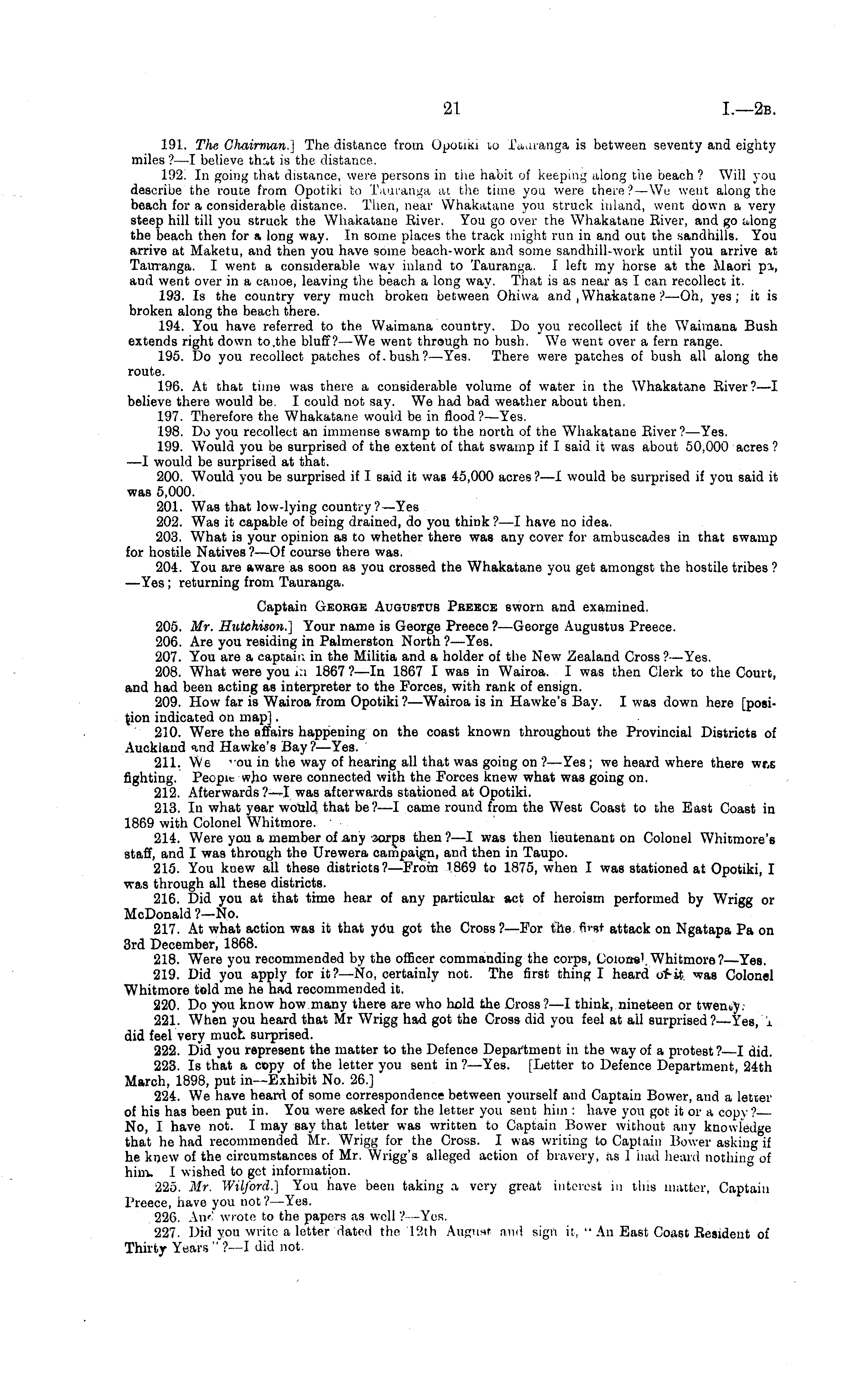 191. The Chairman.] The distance from Opouki 10 IVaanga is between seventy and eighty miles ?—I believe thit is the distance. 192! In going that distance, were persons in tiie habit of keeping along the beach ? Will you describe the route from Opotiki to Tauranga at the time you were there?—We went along the beach for a considerable distance. Then, near Whakatane you struck inland, went down a very steep hill till you struck the Whakatane Eiver. You go over the Whakatane River, and go lilong the beach then for a long way. In some places the track might run in and out the sandhills. You arrive at Maketu, and then you have some beach-work and some sandhill-work until you arrive at Tauranga. I went a considerable way inland to Tauranga. I left my horse at the Maori pa, and went over in a canoe, leaving the beach a long way. That is as near as I can recollect it. 193. Is the country very much broken between Ohiwa and , Whakatane ? —Oh, yes; it is broken along the beach there. 194. You have referred to the Waimana country. Do you recollect if the Waimana Bush extends right down to .the bluff?—We went through no bush. We went over a fern range. 195. Do you recollect patches of.bush?— Yes. There were patches of bush all along the route. 196. At that time was there a considerable volume of water in the Whakatane Eiver?—l believe there would be. I could not say. We had bad weather about then. 197. Therefore the Whakatane would be in flood?— Yes. 198. Do you recollect an immense swamp to the north of the Whakataue Biver?—Yes. 199. Would you be surprised of the extent of that swamp if I said it was about 50,000 acres ? —1 would be surprised at that. 200. Would you be surprised if I said it was 45,000 acres ?—I would be surprised if you said it was 5,000. 201. Was that low-lying country?— Yes 202. Was it capable of being drained, do you thiDk ?—I have no idea. 203. What is your opinion as to whether there was any cover for ambuscades in that swamp for hostile Natives ?—Of course there was. 204. You are aware as soon as you crossed the Whakatane you get amongst the hostile tribes ? —Yes; returning from Tauranga. Captain Geokqe Augustus Preece sworn and examined. 205. Mr. Hutchison.} Your name is George Preece ?—George Augustus Preece. 206. Are you residing in Palmerston North ? —Yes. 207. You are a captain in the Militia and a holder of the New Zealand Cross ?—Yes. 208. What were you in 1867 ?—ln 1867 I was in Wairoa. I was then Cierk to the Court, and had been acting as interpreter to the Forces, with rank of ensign. 209. How far is Wairoa from Opotiki ?—Wairoa is in Hawke's Bay. I was down here [position indicated on map]. 210. Were the affairs happening on the coast known throughout the Provincial Districts of Auckland and Hawke's Bay?— Yes. 211. We 'ou in the way of hearing all that was going on ?—Yes; we heard where there wr,s fighting. People who were connected with the Forces knew what was going on. 212. Afterwards ?—-I was afterwards stationed at Opotiki. 213. In what year woiild that be?—l came round from the West Coast to the Bast Coast in 1869 with Colonel Whitmore. 214. Were you a member of any -aarrjs then ? —I was then lieutenant on Colonel Whitmore'e staff, and I was through the Drewera campaign, and then in Taupo. 215. You knew all these districts?— From T869 to 1875, when I was stationed at Opotiki, I was through all these districts. 216. Did you at that time hear of any particular act of heroism performed by Wrigg or McDonald ?—No. 217. At what action was it that ybu got the Cross?— For the attack on Ngatapa Pa on 3rd December, 1868. 218. Were you recommended by the officer commanding the corps, Coioae 1 , Whitmore?—Yes. 219. Did you apply for it?—No, certainly not. The first thing I heard ot-it was Colonel Whitmore told me he had recommended it. 220. Do you know how many there are who hold the Cross?—l think, nineteen or twenuy. 221. When you heard that Mr Wrigg had got the Cross did you feel at ail surprised?— Yes, 1 did feel very much surprised. 222. Did you represent the matter to the Defence Department in the way of a protest?—l did. 223. Iβ that a copy of the letter you sent in ?—Yes. [Letter to Defence Department, 24th March, 1898, put in—Exhibit No. 26.] 224. We have heard of some correspondence between yourself and Captain Bower, and a letter of his has been put in. You were asked for the letter you sent him : have you got it or a copy ? No, I have not. I may say that letter was written to Captain Bower without any knowledge that he had recommended Mr. Wrigg for the Cross. I was writing to Captain Bower he knew of the circumstances of Mr. Wrigg's alleged action of bravery, as I had heard nothing of him. I wished to get information. 225. Mr. Wilford.] You have been taking a very great interest in tins matter, Captain Preece, have you not ?—Yes. 226. Aw' wrote to the papers as well ?—Yes. 227. Did you write a letter dated the 19th Augiwt and sign it, "An East Coast Eesident of Thirty Years " ?—I did not.