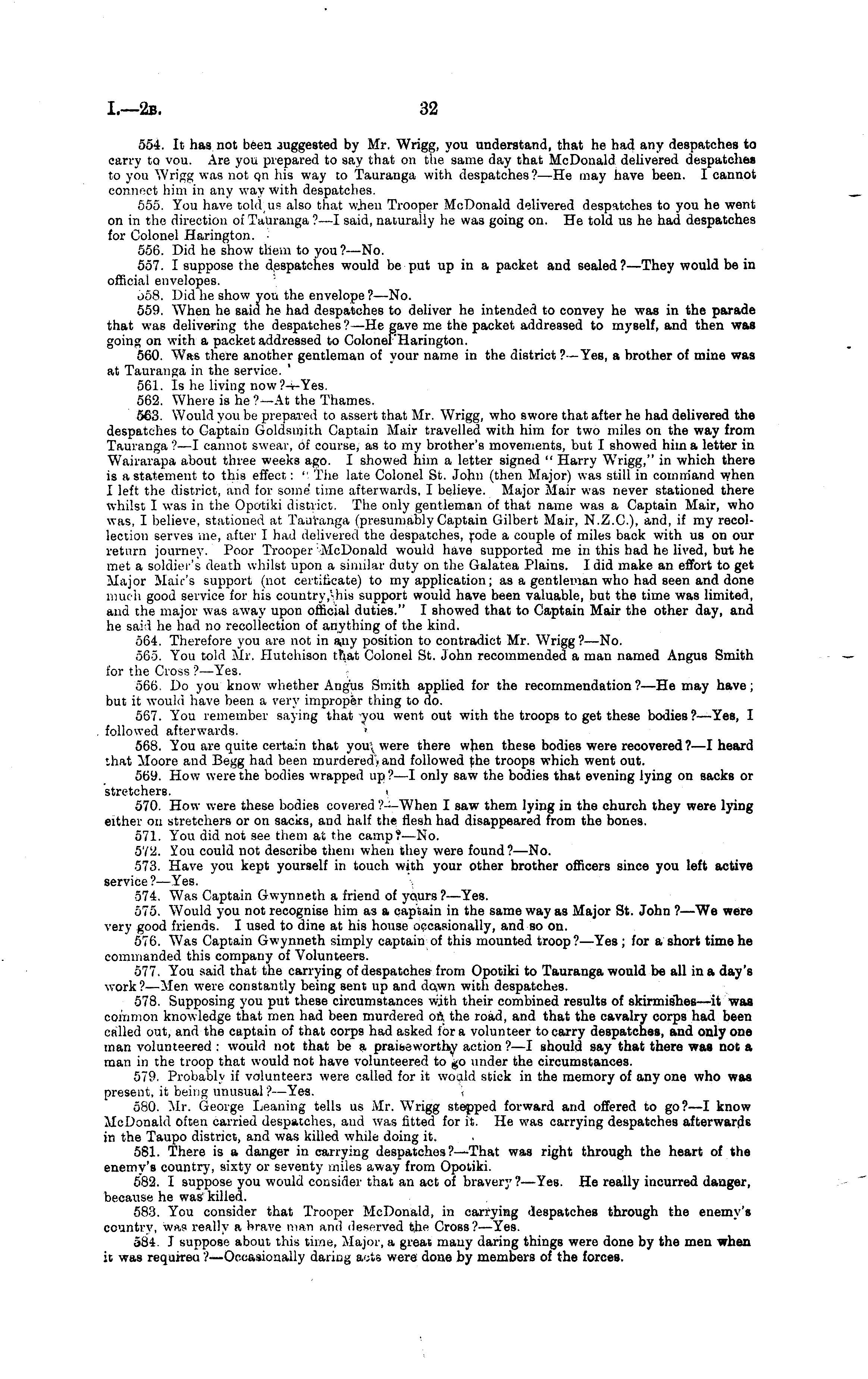 554. It has not been 3uggested by Mr. Wrigg, you understand, that he had any despatches to carry to you. Are you prepared to say that on the same day that McDonald delivered despatches to you Wrigg was not o,n his way to Tauranga with despatches?—He may have been. I cannot connect him in any way with despatches. 555. You have told us also that wiien Trooper McDonald delivered despatches to you he went on in the direction of TaUranga ?—I said, naturally he was going on. He told us he had despatches for Colonel Harington. ■ 556. Did he show them to you?— No. 557. I suppose the despatches would be put up in a packet and sealed?— They would be in official envelopes. i>sB. Did he show you the envelope ?—No. 559. When he said he had despatches to deliver he intended to convey he was in the parade that was delivering the despatches?—He gave me the packet addressed to myself, and then was going on with a packet addressed to ColoneF'Harington. 560. Was there another gentleman of your name in the district ?— Yes, a brother of mine was at Tauranga in the service. 561. Is he living now ?-t-Yes. 562. Where is he ?—At the Thames. 563. Would you be prepared to assert that Mr. Wrigg, who swore that after he had delivered the despatches to Captain Goldsmith Captain Mair travelled with him for two miles on the way from Tauranga ?—I cannot swear, of course, as to my brother's movements, but I showed him a letter in Wairarapa about three weeks ago. I showed him a letter signed " Harry Wrigg," in which there is a statement to this effect: " The late Colonel St. John (then Major) was still in command when I left the district, and for some time afterwards, I belieye. Major Mair was never stationed there whilst I was in the Opotiki district. The only gentleman of that name was a Captain Mair, who was, I believe, stationed at Tauranga (presumably Captain Gilbert Mair, N.Z.C.), and, if my recollection serves me, after I had delivered the despatches, rode a couple of miles back with us on our return journey. Poor Trooper McDonald would have supported me in this had he lived, but he met a soldier's death whilst upon a similar duty on the Galatea Plains. I did make an effort to get Major Mair's support (not certificate) to my application; as a gentleman who had seen and done much good service for his country,-his support would have been valuable, but the time was limited, and the major was away upon official duties." I showed that to Captain Mair the other day, and he said he had no recollection of anything of the kind. 564. Therefore you are not in a.ny position to contradict Mr. Wrigg?—No. 565. You told Mr. Hutchison t?iat Colonel St. John recommended a man named Angus Smith for the Cross ?—Yes. j 566. Do you know whether Angus Smith applied for the recommendation?—He may have; but it would have been a very improper thing to do. 567. You remember saying that you went out with the troops to get these bodies?— Yes, I followed afterwards. ' 568. You are quite certain that were there when these bodies were recovered?—l heard that Moore and Begg had been murdered", and followed £he troops which went out. 569. How were the bodies wrapped up ?—I only saw the bodies that evening lying on sacks or stretchers. i 570. How were these bodies covered ?—When I saw them lying in the church they were lying either ou stretchers or on sacks, and half the flesh had disappeared from the bones. 571. You did not see them at the camp? —No. 5Y2. You could not describe them when they were found?— No. 573. Have you kept yourself in touch with your other brother officers since you left active service? —Yes. . 574. Was Captain Gwynneth a friend of yours ?—Yes. 575. Would you not recognise him as & capsain in the same way as Major St. John ?—Wβ were very good friends. I used to dine at his house occasionally, and so on. 576. Was Captain Gwynneth simply captain of this mounted troop?— Yes ; for a short time he commanded this company of Volunteers. 577. You said that the carrying of despatches from Opotiki to Tauranga would be all in a day's work?— Men were constantly being sent up and do,wn with despatches. 578. Supposing you put these circumstances with their combined results of skirmishes—it waa common knowledge that men had been murdered oft the road, and that the cavalry corps had been called out, and the captain of that corps had asked fora volunteer to carry despatches, and only one man volunteered : would not that be a praiseworthy action ?—I should say that there was not a man in the troop that would not have volunteered to go under the circumstances. 579. Probably if volunteers were called for it would stick in the memory of any one who was present, it being unusual ?—Yes. i 580. Mr. George Leaning tells us Mr. Wrigg stepped forward and offered to go?—I know McDonald often carried despatches, aud was fitted for it. He was carrying despatches afterwards in the Taupo district, and was killed while doing it. 581. There is a danger in currying despatches?— That was right through the heart of the enemy's country, sixty or seventy miles away from Opotiki. 582. I suppose you would consider that an act of bravery ?—Yes. He really incurred danger, because he was'killed. 583. You consider that Trooper McDonald, in carryiag despatches through the enemy's country, was really a brave man and deserved the Cross?— Yes. 584. J suppose about this time, Major, a great many daring things were done by the men when it was requkeu ?—Occasionally daring aots were done by members of the forces.