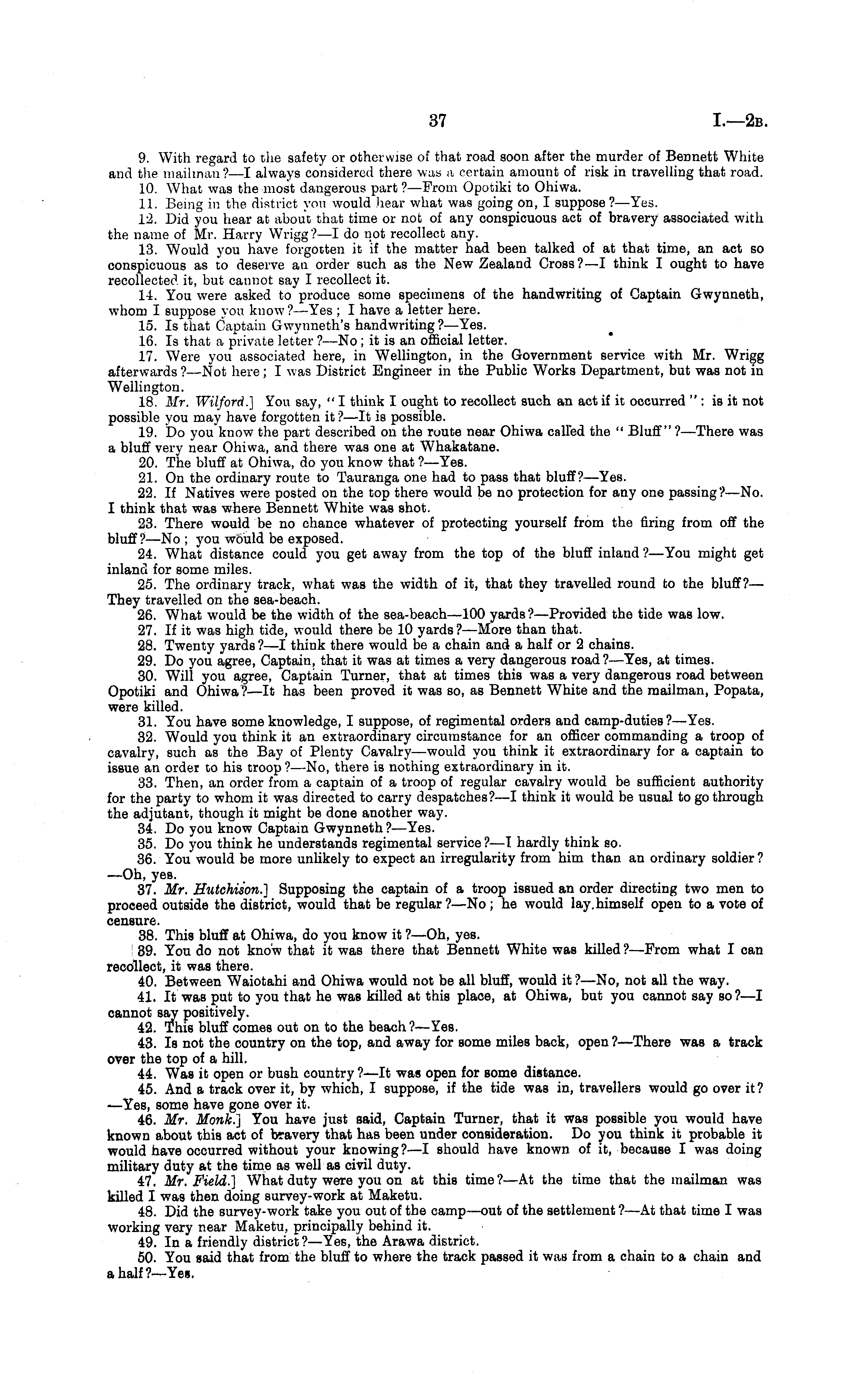 9. With regard to the safety or otherwise of that road soon after the murder of Bermetfc White and the maihnau ?—I always considered there was a certain amount of risk in travelling that road. 10. What was the most dangerous part ?—From Opotiki to Ohiwa. 11. Being in the district you would hear what was going on, I suppose? —Yes. 12. Did you hear at about that time or not of any conspicuous act of bravery associated with the name of Mr. Harry Wrigg? —I do not recollect any. 13. Would you have forgotten it if the matter had been talked of at that time, an act so conspicuous as to deserve an order such as the New Zealand Cross?—l think I ought to have recollected it, but cannot say I recollect it. 14. You were asked to produce some specimens of the handwriting of Captain Gwynneth, whom I suppose you know ?—Yes ; I have a letter here. 15. Is that Captain Gwynneth's handwriting ?—Yes. 16. Is that a private letter ?—No; it is an official letter. 17. Were you associated here, in Wellington, in the Government service with Mr. Wrigg afterwards ?—Not here; I was District Engineer in the Public Works Department, but was not in Wellington. 18. Mr. Wilford.] You say, " I think I ought to recollect such an act if it occurred ":is it not possible you may have forgotten it ?—lt is possible. 19. Do you know the part described on the route near Ohiwa called the " Bluff" ?—There was a bluff very near Ohiwa, and there was one at Whakatane. 20. The bluff at Ohiwa, do you know that ?—Yes. 21. On the ordinary route to Tauranga one had to pass that bluff?— Yes. 22. If Natives were posted on the top there would be no protection for any one passing?— No. I think that was where Bennett White was shot. 23. There would be no chance whatever of protecting yourself from the firing from off the bluff?—No; you would be exposed. 24. What distance could you get away from the top of the bluff inland ?—You might get inland for some miles. 25. The ordinary track, what was the width of it, that they travelled round to the bluff?— They travelled on the sea-beach. 26. What would be the width of the sea-beach—loo yards ?—Provided the tide was low. 27. If it was high tide, would there be 10 yards ?—More than that. 28. Twenty yards ?—I think there would be a chain and a half or 2 chains. 29. Do you agree, Captain, that it was at times a very dangerous road?— Yes, at times. 30. Will you agree, Captain Turner, that at times this was a very dangerous road between Opotiki and Ohiwa? —It has been proved it was so, as Bennett White and the mailman, Popata, were killed. 31. You have some knowledge, I suppose, of regimental orders and camp-duties?— Yes. 32. Would you think it an extraordinary circumstance for an officer commanding a troop of cavalry, such as the Bay of Plenty Cavalry—would you think it extraordinary for a captain to issue an order to his troop ?—No, there is nothing extraordinary in it. 33. Then, an order from a captain of a troop of regular cavalry would be sufficient authority for the party to whom it was directed to carry despatches?—l think it would be usual to go through the adjutant, though it might be done another way. 34. Do you know Captain Gwynneth ? —Yes. 35. Do you think he understands regimental service ?—I hardly think so. 36. You would be more unlikely to expect an irregularity from him than an ordinary soldier ? —Oh, yes. 37. Mr. Hutchison.] Supposing the captain of a troop issued an order directing two men to proceed outside the district, would that be regular?—No ; he would lay.himself open to a vote of censure. 38. This bluff at Ohiwa, do you know it ?—Oh, yes. 39. You do not know that it was there that Bennett White was killed ?—From what I can recollect, it was there. 40. Between Waiotahi and Ohiwa would not be all bluff, would it ?—No, not all the way. 41. It was put to you that he was killed at this place, at Ohiwa, but you cannot say so?—I cannot say positively. 42. This bluff comes out on to the beach ?—Yes. 43. Is not the country on the top, and away for some miles back, open ?—There was a track over the top of a hill. 44. Was it open or bush country ?—lt was open for some distance. 45. And a track over it, by which, I suppose, if the tide was in, travellers would go over it? —Yes, some have gone over it. 46. Mr. Monk.] You have just said, Captain Turner, that it was possible you would have known about this act of bravery that has been under consideration. Do you think it probable it would have occurred without your knowing?—l should have known of it, because I was doing military duty at the time as well as civil duty. 47. Mr. Field.] What duty were you on at this time?—At the time that the mailman was killed I was then doing survey-work at Maketu. 48. Did the survey-work take you out of the camp—out of the settlement ?—At that time I was working very near Maketu, principally behind it. 49. In a friendly district?— Yes, the Arawa district. 50. You said that from the bluff to where the track passed it was from a chain to a chain and a half?— Yes.