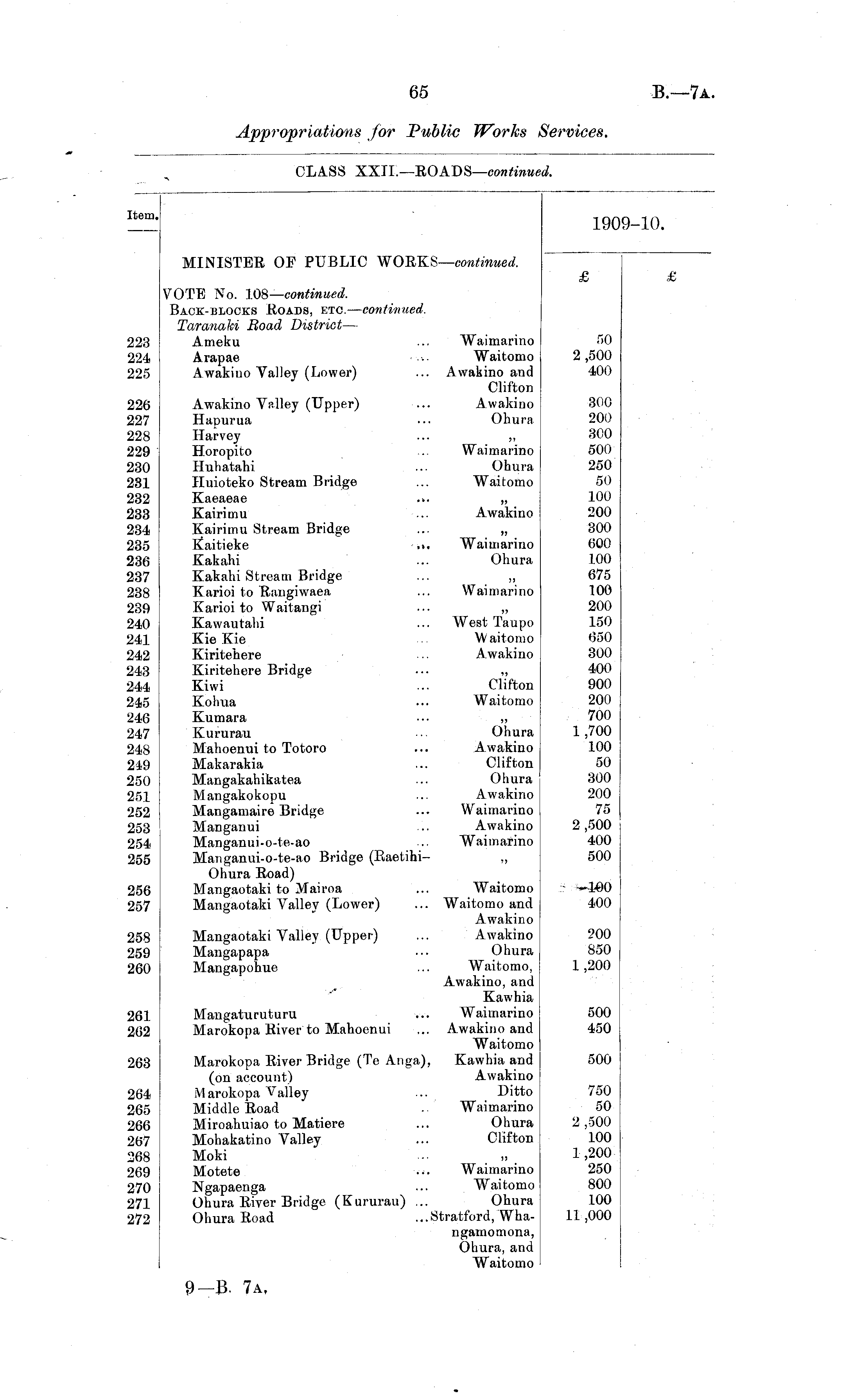 Item. 1909-10. MINISTER OF PUBLIC WORKS— continued. VOTE No. 108— continued. Back-blocks Roads, etc. — continued. Taranaki Road District — Ameku ... Waimarino Arapae •■■•■ Waitomo Awakino Valley (Lower) ... Awakino and Clifton Awakino Valley (Upper) ... Awakino Hapurua ... Ohura Harvey ... ,, Horopito . Waimarino Hubatahi ... Ohura Huioteko Stream Bridge ... Waitomo Kaeaeae ... „ Kairimu ... Awakino Kairimu Stream Bridge ... „ Kaitieke ... Waimarino Kakahi ... Ohura Kakahi Stream Bridge ... ,, Karioi to Rangiwaea ... Waimarino Karioi to Waitangi ... „ Kawautahi ... West Taupo Kie Kie Waitomo Kiritehere .. Awakino Kiritehere Bridge ... „ Kiwi ... Clifton Kohua ... Waitomo Kumara ... ,, Kururau ... Ohura Mahoenui to Totoro ... Awakino Makarakia ... Clifton Mangakahikatea ... Ohura Mangakokopu ... Awakino Mangamaire Bridge ... Waimarino Manganui ... Awakino Manganui-o-te-ao ... Waimarino Manganui-o-te-ao Bridge (Raetihi- „ Ohura Road) Mangaotaki to Mairoa ... Waitomo Mangaotaki Valley (Lower) ... Waitomo and Awakino Mangaotaki Valley (Upper) ... Awakino Mangapapa ■•• Ohura Mangapohue ... Waitomo, Awakino, and Kawhia Maugaturuturu ... Waimarino Marokopa River to Mahoenui ... Awakino and Waitomo Marokopa River Bridge (Te Anga), Kawhia and (on account) Awakino Marokopa Valley ... Ditto Middle Road .. Waimarino Miroahuiao to Matiere ... Ohura Mohakatino Valley ... Clifton Moki ... „ Motete •" Waimarino Ngapaenga ... Waitomo Ohura River Bridge (Kururau) ... Ohura Ohura Road ...Stratford, Whangamomona, Ohura, and Waitomo £ 50 2,500 400 £ 223 224 225 226 227 228 229 230 231 232 233 234 235 236 237 238 239 240 241 242 243 244 245 246 247 248 249 250 251 252 253 254 255 300 200 300 500 250 50 100 200 300 600 100 675 100 200 150 650 300 400 900 200 700 1,700 100 50 300 200 75 2 ,500 400 500 256 257 100 400 258 259 260 200 850 1,200 261 262 500 450 263 500 264 265 266 267 268 269 270 271 272 750 50 2 ,500 100 1,200 250 800 100 11 ,000