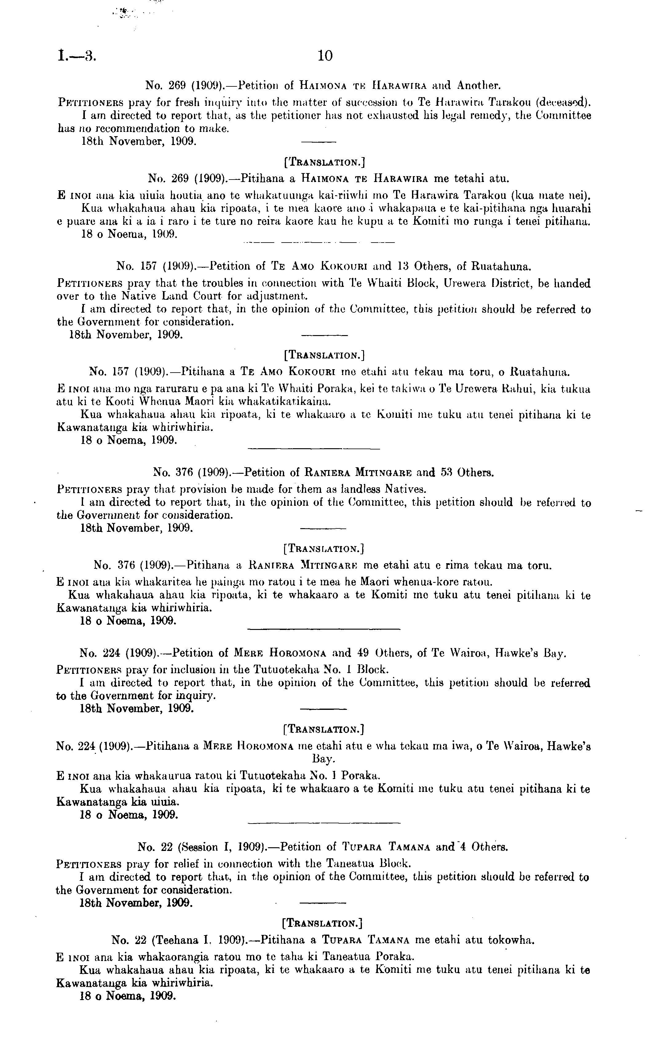 No. 269 (1909). —Petition of Haimona te Harawira and Another. Petitioners pray for fresh inquiry into the matter of succession to Te Harawira Tarakou (deceased). I am directed to report that, as the petitioner has not exhausted his legal remedy, the Committee has no recommendation to make. 18th November, 1909. [Translation.] No. 269 (1909). —Pitihana a Haimona te Harawira me tetahi atu. E inoi ana kia uiuia houtia ano te whakatuunga kai-riiwhi mo Te Harawira Tarakou (kua mate nei). Kua whakahaua ahau kia ripoata,, i te mea kaore ano -i whakapaua c te kai-pitihana nga huarahi c puare ana ki a ia i raro i te ture no reira kaore kau he kupu a te Komiti mo runga i tenei pitihana. 18 o Noema, 1909. No. 157 (1909). —Petition of Te Amo Kokouri and 13 Others, of Ruatahuna. Petitioners pray that the troubles in connection with Te Whaiti Block, Urewera District, be handed over to the Native Land Court for adjustment. I am directed to report that, in the opinion of the Committee, this petition should lie referred to the Government for consideration. 18th November, 1909. [Translation.] No. 157 (1909). —Pitihana a Te Amo Kokouri me etahi atu tekau ma toru, o Ruatahuna. E inoi ana mo nga raruraru c pa ana ki Te Whaiti Poraka, kei te takiwa o Te Urewera Rahui, kia tukua atu kite Kooti Whenua Maori kia whakatikatikaina. Kua whakahaua ahau kia ripoata, kite whakaaro a te Komiti me tuku atu tenei pitihana kite Kawanatanga kia whiriwhiria. 18 o Noema, 1909. No. 376 (1909).—Petition of Raniera Mttingare and 53 Others. Petitioners pray that provision be made for them as landless Natives. 1 am directed to report that, in the opinion of the Committee, this petition should be referred to the Government for consideration. 18th November, 1909. [Translation.] No. 376 (1909). —Pitihana a Raniera Mittngare me etahi atu c rima tekau ma toru. E inoi ana kia whakaritea he painga mo ratou i te mea he Maori whenua-kore ratou. Kua whakahaua ahau kia ripoata, kite whakaaro a te Komiti me tuku atu tenei pitihana kite Kawanatanga kia whiriwhiria. 18 o Noema, 1909. No. 224 (1909).—Petition of Mere Horomona and 49 Others, of Te Wairoa, Hawke's Bay. Petitioners pray for inclusion in the Tutuotekaha No. 1 Block. 1 am directed to report that, in the opinion of the Committee, this petition should be referred to the Government for inquiry. 18th November, 1909. [Translation.] No. 224 (1909). —Pitihana a Mere Horomona me etahi atu c wha tekau ma iwa, o Te Wairoa, Hawke's Bay. E inoi ana kia whakaurua ratou ki Tutuotekaha No. 1 Poraka. Kua whakahaua ahau kia ripoata, kite whakaaro a te Komiti mo tuku atu tenei pitihana kite Kawanatanga kia uiuia. 18 o Noema, 1909. No. 22 (Session I, 1909). —Petition of Tupara Tamana and "4 Others. Petitioners pray for relief in connection with the Taneatua Block. 1 am directed to report that, in the opinion of the Committee, this petition should be referred to the Government for consideration. 18th November, 1909. [Translation.] No. 22 (Teehana I, 1909). —Pitihana a Tupara Tamana me etahi atu tokowha. E inoi ana kia whakaorangia ratou mo te taha ki Taneatua Poraka. Kua whakahaua ahau kia ripoata, kite whakaaro a te Komiti me tuku atu tenei pitihana kite Kawanatanga kia whiriwhiria. 18 o Noema, 1909.