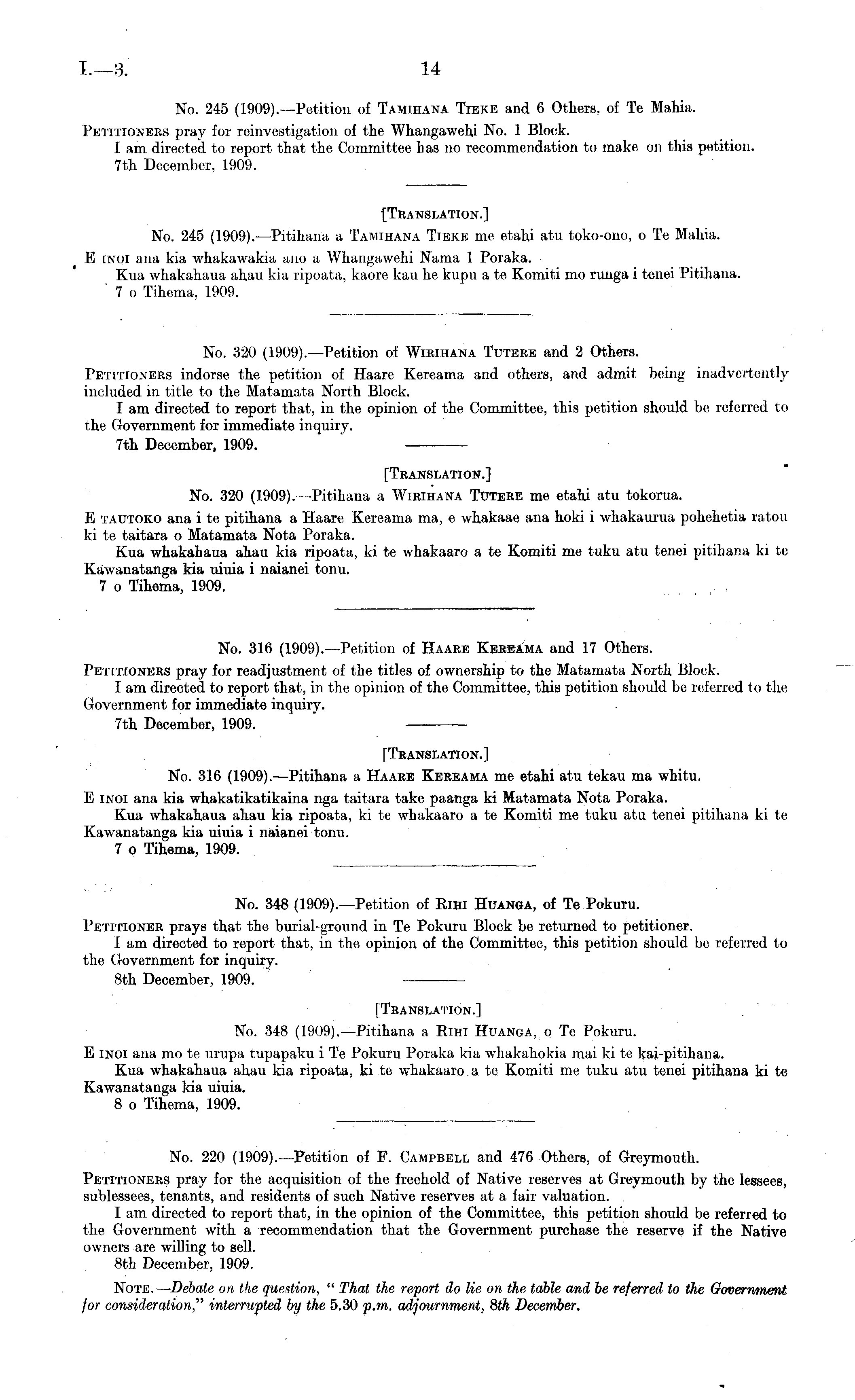 No. 245 (1909).—Petition of Tamihana Tieke and 6 Others, of Te Mahia. Petitioners pray for reinvestigation of the Whangawehi No. 1 Block. I am directed to report that the Committee has no recommendation to make on this petition. 7th December, 1909. [Translation.] No. 245 (1909). —Pitihana a Tamihana Tieke me etahi atu toko-ono, o Te Mahia. E inoi ana kia whakawakia ano a Whangawehi Nama 1 Poraka. Kua whakahaua ahau kia ripoata. kaore kau he kupu a te Komiti mo runga i tenei Pitihana. ' 7 o Tihema. 1909. No. 320 (1909).—Petition of Wirihana Tutere and 2 Others. Petitioners indorse the petition of Haare Kereama and others, and admit being inadvertently included in title to the Matamata North Block. I am directed to report that, in the opinion of the Committee, this petition should be referred to the Government for immediate inquiry. 7th December, 1909. — [Translation.] No. 320 (1909). —Pitihana a Wirihana Tutere me etahi atu tokorua. E tautoko ana i te pitihana a Haare Kereama ma, c whakaae ana hoki i whakaurua pohehetia ratou kite taitara o Matamata Nota Poraka. Kua whakahaua ahau kia ripoata, kite whakaaro a te Komiti me tuku atu tenei pitihana kite Kawanatanga kia uiuia i naianei tonu. 7 o Tihema, 1909. No. 316 (1909).—Petition of Haare Kereama and 17 Others. Petitionees pray for readjustment of the titles of ownership to the Matamata North Block. I am directed, to report that, in the opinion of the Committee, this petition should be referred to the Government for immediate inquiry. 7th December, 1909. [Translation.] No. 316 (1909). —Pitihana a Haare Kereama me etahi atu tekau ma whitu. E inoi ana kia whakatikatikaina nga taitara take paanga ki Matamata Nota Poraka. Kua whakahaua ahau kia ripoata, kite whakaaro a te Komiti me tuku atu tenei pitihana kite Kawanatanga kia uiuia i naianei tonu. 7 o Tihema, 1909. No. 348 (1909).—Petition of Rihi Huanga, of Te Pokuru. Petitioner prays that the burial-ground in Te Pokuru Block be returned to petitioner. I am directed to report that, in the opinion of the Committee, this petition should be referred to the Government for inquiry. Bth December, 1909. [Translation.] No. 348 (1909).—Pitihana a Rihi Huanga, o Te Pokuru. E inoi ana mo te urupa tupapaku i Te Pokuru Poraka kia whakahokia mai kite kai-pitihana. Kua whakahaua ahau kia ripoata, kite whakaaro a te Komiti me tuku atu tenei pitihana kite Kawanatanga kia uiuia. 8 o Tihema, 1909. No. 220 (1909).—Petition of F. Campbell and 476 Others, of Greymouth. Petitioners pray for the acquisition of the freehold of Native reserves at Greymouth by the lessees, sublessees, tenants, and residents of such Native reserves at a fair valuation. I am directed to report that, in the opinion of the Committee, this petition should be referred to the Government with a recommendation that the Government purchase the reserve if the Native owners are willing to sell. Bth December, 1909. Note. — Debate on the question, " That the report do lie on the table and be referred to the Government for consideration," interrupted by the 5.30 p.m. adjournment, Bth December.