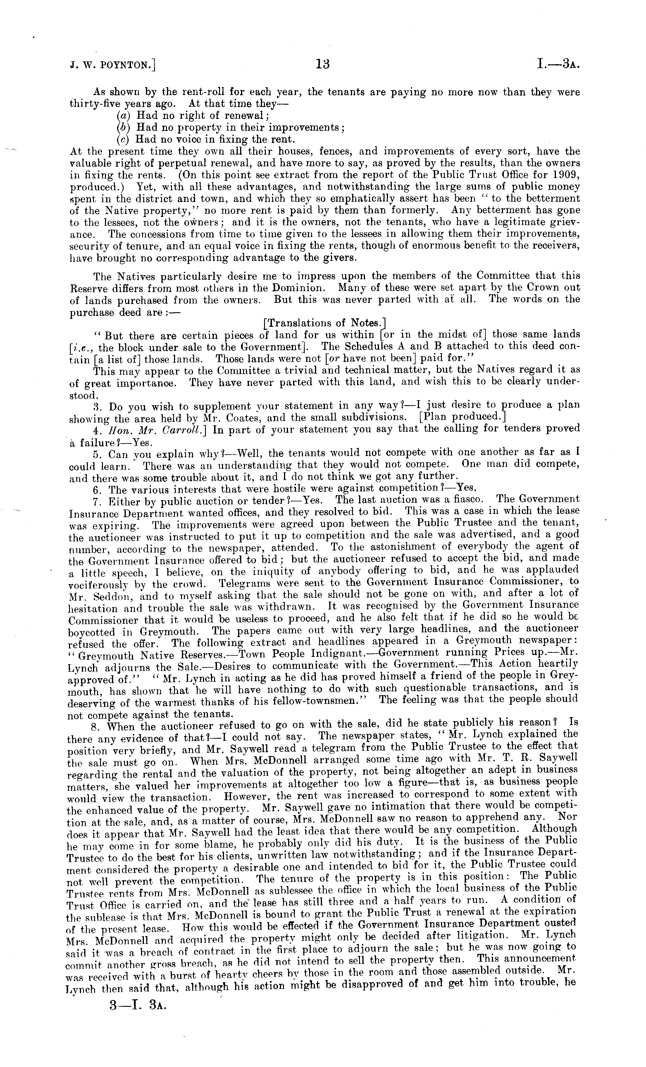 As shown by the rent-roll for each year, the tenants are paying no more now than they were thirty-five years ago. At that time they — (a) Had no right of renewal; (6) Had no property in their improvements; (c) Had no voice in fixing the rent. At the present time they own all their houses, fences, and improvements of every sort, have the valuable right of perpetual renewal, and have more to say, as proved by the results, than the owners in fixing the rents. (On this point see extract from the report of the Public Trust Office for 1909, produced.) Yet, with all these advantages, and notwithstanding the large sums of public money spent in the district and town, and which they so emphatically assert has been " to the betterment of the Native property," no more rent is paid by them than formerly. Any betterment has gone to the lessees, not the owners; and it is the owners, not the tenants, who have a legitimate grievance. The concessions from time to time given to the lessees in allowing them their improvements, security of tenure, and an equal voice in fixing the rents, though of enormous benefit to the receivers, have brought no corresponding advantage to the givers. The Natives particularly desire me to impress upon the members of the Committee that this Reserve differs from most others in the Dominion. Many of these were set apart by the Crown out of lands purchased from the owners. But this was never parted with at all. The words on the purchase deed are : — [Translations of Notes.] " But there are certain pieces of land for us within [or in the midst of] those same lands [i.e., the block under sale to the Government]. The Schedules A and B attached to this deed contain [a list of] those lands. Those lands were not [or have not been] paid for." This may appear to the Committee a trivial and technical matter, but the Natives regard it as of great importance. They have never parted with this land, and wish this to be clearly understood. 3. Do you wish to supplement your statement in any way?—l just desire to produce a plan showing the area held by Mr. Coates, and the small subdivisions. [Plan produced.] 4. Hon. Mr. Carroll.] In part of your statement you say that the calling for tenders proved a failure? —Yes. 5. Can you explain why? —Well, the tenants would not compete with one another as far as I could learn. There was an understanding that they would not compete. One man did compete, and there was some trouble about it, and I do not think we got any further. 6. The various interests that were hostile were against competition? —Yes. 7. Either by public auction or tender ?—Yes. The last auction was a fiasco. The Government Insurance Department wanted offices, and they resolved to bid. This was a case in which the lease was expiring. The improvements were agreed upon between the Public Trustee and the tenant, the auctioneer was instructed to put it up to competition and the sale was advertised, and a good number, according to the newspaper, attended. To the astonishment of everybody the agent of the Government Insurance offered to bid; but the auctioneer refused to accept the bid, and made a little speech, I believe, on the iniquity of anybody offering to bid, and he was applauded vociferously by the crowd. Telegrams we're sent to the Government Insurance Commissioner, to Mr Seddon, and to myself asking that the sale should not be gone on with, and after a lot of hesitation and trouble the sale was withdrawn. It was recognised by the Government Insurance Commissioner that it would be useless to proceed, and he also felt that if he did so he would be boycotted in Greymouth. The papers came out with very large headlines, and the auctioneer refused the offer. The following extract and headlines appeared in a Greymouth newspaper: "Greymouth Native Reserves.—Town People Indignant.—Government running Prices up.—Mr. Lynch adjourns the Sale.—Desires to communicate with the Government.—This Action heartily approved of." " Mr. Lynch in acting as he did has proved himself a friend of the people in Greymouth has shown that he will have nothing to do with such questionable transactions, and is deserving of the warmest thanks of his fellow-townsmen." The feeling was that the people should not compete against the tenants. ~.,,. „ T 8 When the auctioneer refused to go on with the sale, did he state publicly his reason 1 Is there any evidence of that?—l could not say. The newspaper states, "Mr. Lynch explained the position very briefly, and Mr. Saywell read a telegram from the Public Trustee to the effect that the sale must go on. When Mrs. McDonnell arranged some time ago with Mr. T. R. Saywell regarding the rental and the valuation of the property, not being altogether an adept m business matters she valued her improvements at altogether too low a figure—that is, as business people would view the transaction. However, the rent was increased to correspond to some extent with the enhanced value of the property. Mr. Savwell gave no intimation that there would be competition at the sale, and, as a matter of course, Mrs. McDonnell saw no reason to apprehend any Nor does it appear that Mr. Saywell had the least idea that there would be any competition Although he may come in for some blame, he probably only did his duty. It is the business of the Public Trustee to do the best for his clients, unwritten law notwithstanding; and if the Insurance Department considered the property a desirable one and intended to bid for it the Public Trustee could not well prevent the competition. The tenure of the property is in this position: The Pubic Trustee rents from Mrs. McDonnell as sublessee the office in which the local business of the Public Trust Office is carried on, and the lease has still three and a half years to run. A condition of the sublease is that Mrs. McDonnell is bound to grant the Public Trust a renewal at the expiration of the present lease How this would be effected if the 