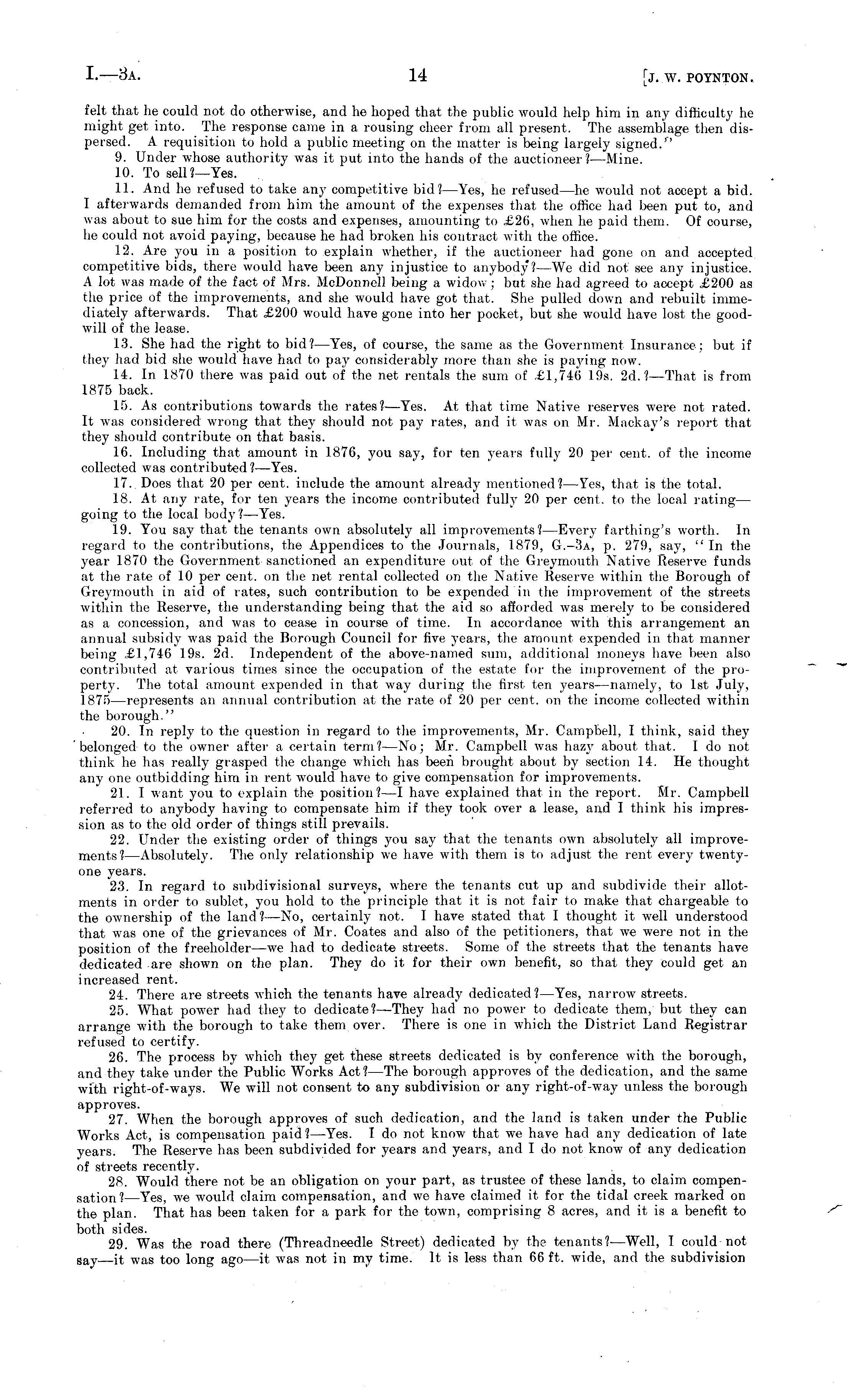 felt that he could not do otherwise, and he hoped that the public would help him in any difficulty he might get into. The response came in a rousing cheer from all present. The assemblage then dispersed. A requisition to hold a public meeting on the matter is being largely signed." 9. Under whose authority was it put into the hands of the auctioneer? —Mine. 10. To sell?— Yes. 11. And he refused to take any competitive bid?— Yes, he refused—he would not accept a bid. I afterwards demanded from him the amount of the expenses thai the office had been put to, and was about to sue him for the costs and expenses, amounting to £26, when he paid them. Of course, he could not avoid paying, because he had broken his contract with the office. 12. Are you in a position to explain whether, if the auctioneer had gone on and accepted competitive bids, there would have been any injustice to anybody*?—We did not see any injustice. A lot was made of the fact of Mrs. McDonnell being a widow ; but she had agreed to accept £200 as the price of the improvements, and she would have got that. She pulled down and rebuilt immediately afterwards. That £200 would have gone into her pocket, but she would have lost the goodwill of the lease. 13. She had the right to bid? —Yes, of course, the same as the Government Insurance; but if they had bid she would have had to pay considerably more than she is paving now. 14. In 1870 there was paid out of the net rentals the sum of £1,746 19s. 2d.?—That is from 1875 back. 15. As contributions towards the rates?— Yes. At that time Native reserves were not rated. It was considered wrong that they should not pay rates, and it was on Mr. Mackay's report that they should contribute on that basis. 16. Including that amount in 1876, you say, for ten years fully 20 per cent, of the income collected was contributed ? —Yes. 17. Does that 20 per cent, include the amount already mentioned?— Yes, that is the total. 18. At any rate, for ten years the income contributed fully 20 per cent, to the local rating— going to the local body? —Yes. 19. You say that the tenants own absolutely all improvements?— Every farthing's worth. In regard to the contributions, the Appendices to the Journals, 11579, G.—3a, p. 279, say, "In the year 1870 the Government sanctioned an expenditure out of the Greymouth Native Reserve funds at the rate of 10 per cent, on the net rental collected on the Native Reserve within the Borough of Greymouth in aid of rates, such contribution to be expended in the improvement of the streets within the Reserve, the understanding being that the aid so afforded was merely to lie considered as a concession, and was to cease in course of time. In accordance with this arrangement an annual subsidy was paid the Borough Council for five years, the amount expended in that manner being £1,746 19s. 2d. Independent of the above-named sum, additional moneys have been also contributed at various times since the occupation of the estate for the improvement of the property. The total amount expended in that way during the first ten years —namely, to Ist July, LB7s—represents an annual contribution at the rate of 20 per cent, on the income collected within the borough." 20. In reply to the question in regard to the improvements, Mr. Campbell, 1 think, said they belonged to the owner after a certain term?—No; Mr. Campbell was hazy about that. 1 do not think he has really grasped the change which has been brought about by section 14. He thought any one outbidding him in rent would have to give compensation for improvements. 21. I want you to explain the position?—l have explained that in the report. Mr. Campbell referred to anybody having to compensate him if they took over a lease, and I think his impression as to the old order of things still prevails. 22. Under the existing order of things you say that the tenants own absolutely all improve-ments?--Absolutely. The only relationship we have with them is to adjust the rent every twentyone years. 23. In regard to subdivisional surveys, where the tenants cut up and subdivide their allotments in order to sublet, you hold to the principle that it is not fair to make that chargeable to the ownership of the land ?—No, certainly not. I have stated that I thought it well understood that was one of the grievances of Mr. Coates and also of the petitioners, that we were not in the position of the freeholder —we had to dedicate streets. Some of the streets that the tenants have dedicated are shown on the plan. They do it for their own benefit, so that they could get an increased rent. 24. There are streets which the tenants have already dedicated?— Yes, narrow streets. 25. What power had they to dedicate? —They had no power to dedicate them, but they can arrange with the borough to take them over. There is one in which the District Land Registrar refused to certify. 26. The process by which they get these streets dedicated is by conference with the borough, and they take under the Public Works Act? —The borough approves of the dedication, and the same with right-of-ways. We will not consent to any subdivision or any right-of-way unless the borough approves. 27. When the borough approves of such dedication, and the land is taken under the Public Works Act, is compensation paid? —Yes. I do not know that we have had any dedication of late years. The Reserve has been subdivided for years and years, and Ido not know of any dedication of streets recently. 28. Would there not be an obligation on your part, as trustee of these lands, to claim compensation? —Yes, we would claim compensation, and we have claimed it for the tidal creek marked on the plan. That has been taken for a park for the town, comprising 8 acres, and it is a benefit to both sides. 29. Was the road there (Threadneedle Street) dedicated by the tenants?— Well, I could not ga y—it was too long ago —it was not in my time. It is less than 66 f