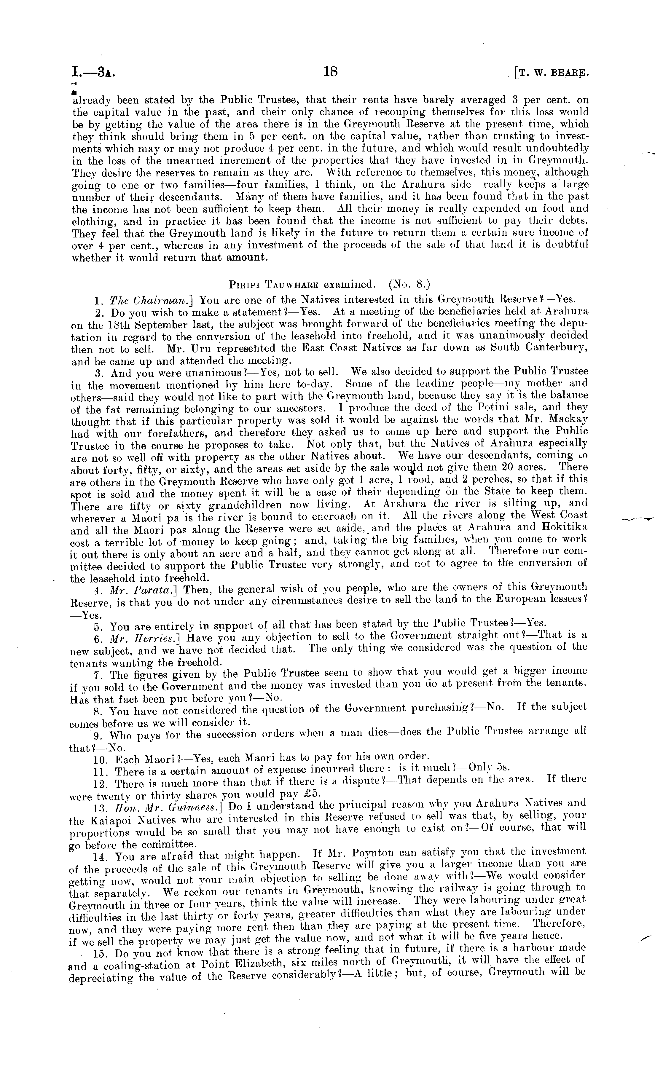 -2» already been stated by the Public Trustee, that their rents have barely averaged 3 per cent, on the capital value in the past, and their only chance of recouping themselves for this loss would be by getting the value of the area there is in the Greymouth Reserve at the present time, which they think should bring them in 5 per cent, on the capital value, rather than trusting to investments which may or may not produce 4 per cent, in the future, and which would result undoubtedly in the loss of the unearned increment of the properties that they have invested in in Greymouth. They desire the reserves to remain as they are. With reference to themselves, this money, although going to one or two families —four families, I think, on the Arahura side —really keeps a large number of their descendants. Many of them have families, and it has been found that in the past the income has not been sufficient to keep them. All their money is really expended on food and clothing, and in practice it has been found that the income is not sufficient to pay their debts. They feel that the Greymouth land is likely in the future to return them a certain sure income of over 4 per cent., whereas in any investment of the proceeds of the sale of that land it is doubtful whether it would return that amount. Piripi Tauwhare examined. (No. 8.) 1. The Chairman.] You are one of the Natives interested in this Greymouth Reserve?— Yes. 2. Do you wish to make a statement? —Yes. At a meeting of the beneficiaries held at Arahura on the 18th September last, the subject was brought forward of the beneficiaries meeting the deputation in regard to the conversion of the leasehold into freehold, and it was unanimously decided then not to sell. Mr. Uru represented the East Coast Natives as far down as South Canterbury, and he came up and attended the meeting. 3. And you were unanimous? —Yes, not to sell. We also decided to support the Public Trustee in the movement mentioned by him here to-day. Some of the leading people —my mother and others—said they would not like to part with the Greymouth land, because they say it is the balance of the fat remaining belonging to our ancestors. I produce the deed of the Potini sale, and they thought that if this particular property was sold it would be against the words that Mr. Mackay had with our forefathers, and therefore they asked us to come up here and support the Public Trustee in the course he proposes to take. Not only that, but the Natives of Arahura especially are not so well off with property as the other Natives about. We have our descendants, coming lo about forty, fifty, or sixty, and'the areas set aside by the sale would not give them 20 acres. There are others in the Greymouth Reserve who have only got 1 acre, 1 rood, and 2 perches, so that if this spot is sold and the money spent it will be a case of their depending on the State to keep them. There are fifty or sixty grandchildren now living. At Arahura the river is silting up, and wherever a Maori pa is "the river is bound to encroach on it. All the rivers along the West Coast and all the Maori pas along the Reserve were set aside,, and the places at Arahura and Hokitika cost a terrible lot of money to keep going; and, taking'the big families, when you come to work it out there is only about an acre and a half, and they cannot get along at all. Therefore our committee decided to support the Public Trustee very strongly, and not to agree to the conversion of the leasehold into freehold. . 4. Mr. Parata.] Then, the general wish of you people, who are the owners of this Greymouth Reserve, is that you do not under any circumstances desire to sell the land to the European lessees ? Yes. 5. You are entirely in support of all that has been stated by the Public Trustee?— Yes. 6. Mr. Herries.] Have you any objection to sell to the Government straight out?— That is a new subject, and we have not decided tliat. The only thing we considered was the question of the tenants wanting the freehold. 7. The figures given by the Public Trustee seem to show that you would get a bigger income if you sold to the Government and the money was invested than you do at present from the tenants. Has that fact been put before you?— No. _ . 8. Y r ou have not considered the question of the Government purchasing (—No. it the subject conies before us we will consider it. , 9. Who pays for the succession orders when a man dies—does the Public trustee arrange all that?— No. 10. Each Maori? —Yes, each Maori lias to pay for his own order. 11 There is a certain amount of expense incurred there : is it much?— Only ss. 12. There is much more than that if there is a dispute I— That depends on the area. If there were twenty or thirty shares you would pay £5. . 13 Hon Mr Guinness.] Do I understand the principal reason why you Arahura Natives and the Kaiapoi Natives who arc interested in this Reserve refused to sell was that, by selling, your proportions would be so small that you may not have enough to exist on?—Oi course, that will go before the committee. . 14 You are afraid that might happen. If Mr. Poynton can satisfy you that the investment of the proceeds of the sale of this Greymouth Reserve will give you a larger income than you are crettino now, would not your main objection to selling be done away with?—We would consider that separately We reckon our tenants in Greymouth, knowing the railway is going through to Grevmouth inVhree or four years, think the value will increase. They were labouring under great difficulties in the last thirty'or forty years, greater difficulties than what they are labouring under now and they were paving more rent then than they are paying at the present time. Therefore, if we sell the property we may just get the value now, and not what it will be five years hence. 15 Do you not know that there is a strong feeling that in future, if there is a harbour made and a coaling-station at Point El