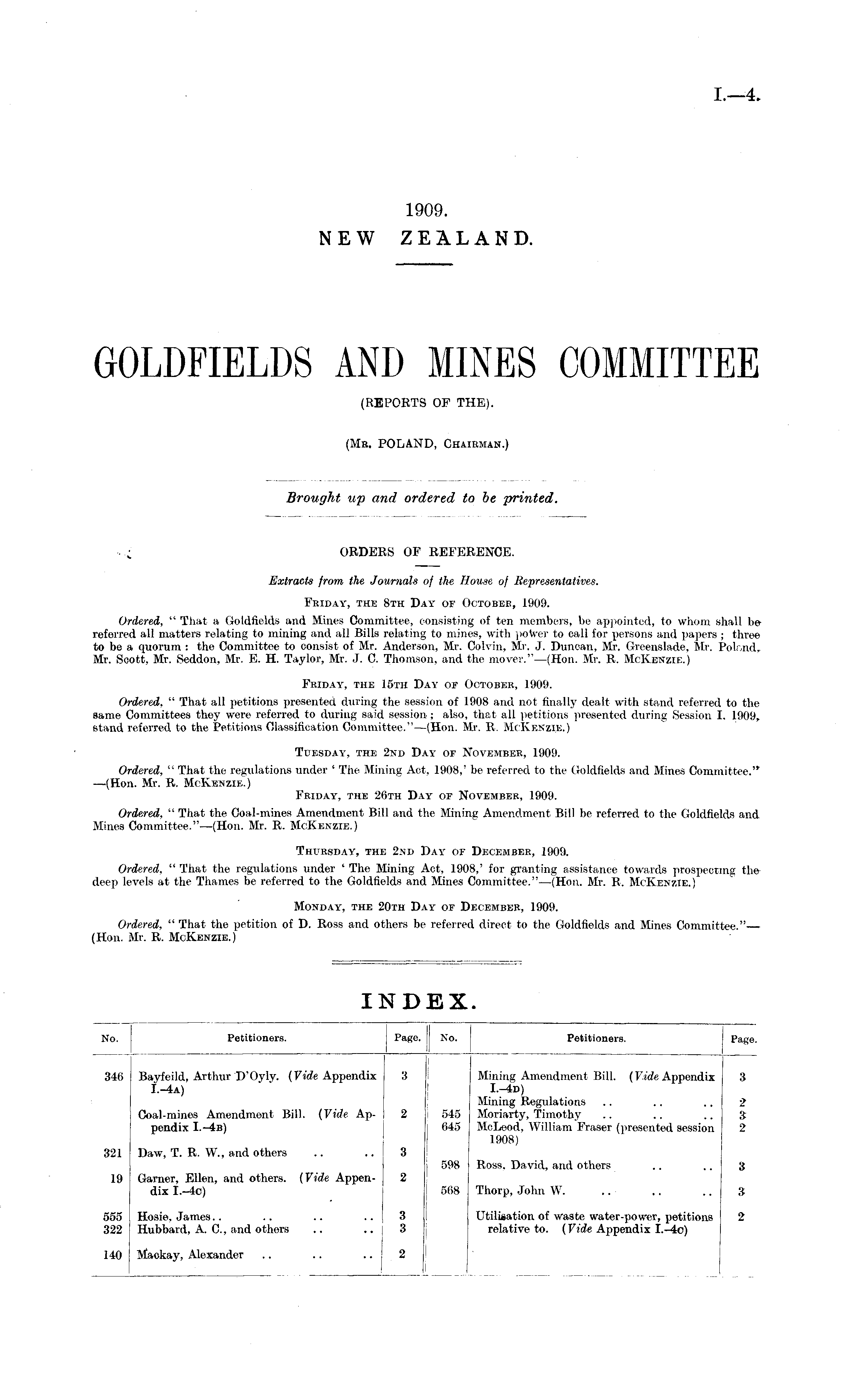 .; ORDERS OF REFERENCE. Extracts from the Journals of the House of Representatives. Friday, the Bth Day of October, 1909. Ordered, " That a Goldfields and Mines Committee, consisting of ten members, be appointed, to whom shall be referred all matters relating to mining and all Bills relating to mines, with power to call for persons and papers ; three to be a quorum : the Committee to consist of Mr. Anderson, Mr. Colvin, Mr. J. Duncan, Mr. Greenslade, Mr. Poland. Mr. Scott, Mr. Seddon, Mr. E. H. Taylor, Mr. J. C. Thomson, and the mover."—(Hon. Mr. R. McKenzie.) Friday, the 15th Day of October, 1909. Ordered, " That all petitions presented during the session of 1908 and not finally dealt with stand referred to the same Committees they were referred to during said session ; also, that all petitions presented during Session I. 1909, stand referred to the Petitions Classification Committee."—(Hon. Mr. R. McKenzie.) Tuesday-, the 2nd Day or November, 1909. Ordered, " That the regulations under ' The Mining Act, 1908,' be referred to the Goldfields and Mines Committee." —(Hon. Mr. R. McKenzie.) Friday, the 26th Day of November, 1909. Ordered, " That the Coal-mines Amendment Bill and the Mining Amendment Bill be referred to the Goldfields and Mines Committee." —(Hon. Mr. R. McKenzie.) Thursday, the 2nd Day of December, 1909. Ordered, " That the regulations under ' The Mining Act, 1908,' for granting assistance towards prospecting the deep levels at the Thames be referred to the Goldfields and Mines Committee."—(Hon. Mr. R. McKenzie.) Monday, the 20th Day of December, 1909. Ordered, " That the petition of D. Ross and others be referred direct to the Goldfields and Mines Committee."— (Hon. Mr. R. McKenzie.)