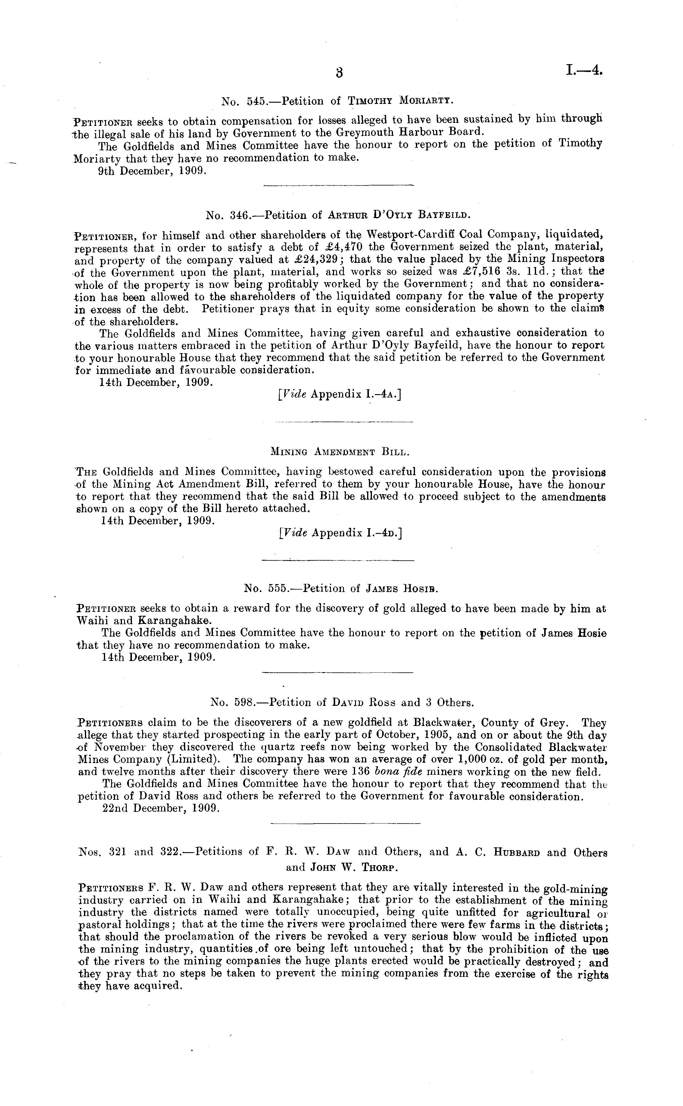 No. 545.—Petition of Timothy Mori arty. Petitioner seeks to obtain compensation for losses alleged to have been sustained by him through the illegal sale of his land by Government to the Greymouth Harbour Board. The Goldfields and Mines Committee have the honour to report on the petition of Timothy Moriarty that they have no recommendation to make. 9th December, 1909. No. 346. —Petition of Arthur DOyly Bayfeild. Petitioner, for himself and other shareholders of the Westport-Cardiff Coal Company, liquidated, represents that in order to satisfy a debt of £4,470 the Government seized the plant, material, and property of the company valued at £24,329; that the value placed by the Mining Inspectors of the Government upon the plant, material, and works so seized was £7,516 3s. lid.; that the whole of the property is now being profitably worked by the Government; and that no consideration has been allowed to the shareholders of the liquidated company for the value of the property in excess of the debt. Petitioner prays that in equity some consideration be shown to the claims of the shareholders. The Goldfields and Mines Committee, having given careful and exhaustive consideration to the various matters embraced in the petition of Arthur DOyly Bayfeild, have the honour to report to your honourable House that they recommend that the said petition be referred to the Government for immediate and favourable consideration. 14th December, 1909. [Vide Appendix 1.-4 a.] Mining Amendment Bill. The Goldfields and Mines Committee, having bestowed careful consideration upon the provisions ■of the Mining Act Amendment Bill, referred to them by your honourable House, have the honour to report that they recommend that the said Bill be allowed to proceed subject to the amendments shown on a copy of the Bill hereto attached. 14th December, 1909. [Vide Appendix 1.-4 d.] No. 555.—Petition of James Hosih. Petitioner seeks to obtain a reward for the discovery of gold alleged to have been made by him at Waihi and Karangahake. The Goldfields and Mines Committee have the honour to report on the petition of James Hosie that they have no recommendation to make. 14th December, 1909. No. 598.—Petition of David Boss and 3 Others. Petitioners claim to be the discoverers of a new goldfield at Blackwater, County of Grey. They allege that they started prospecting in the early part of October, 1905, and on or about the 9th day ■of November they discovered the quartz reefs now being worked by the Consolidated Blackwater Mines Company (Limited). The company has won an average of over 1,000 oz. of gold per month, and twelve months after their discovery there were 136 bona fide miners working on the new field. The Goldfields and Mines Committee have the honour to report that they recommend that the petition of David Ross and others be referred to the Government for favourable consideration. 22nd December, 1909. Nos. 321 and 322.—Petitions of F. R. W. Daw and Others, and A. C. Hubbard and Others and John W. Thorp. Petitioners F. R. W. Daw and others represent that they are vitally interested in the gold-mining industry carried on in Waihi and Karangahake; that prior to the establishment of the mining industry the districts named were totally unoccupied, being quite unfitted for agricultural or pastoral holdings; that at the time the rivers were proclaimed there were few farms in the districts; that should the proclamation of the rivers be revoked a very serious blow would be inflicted upon the mining industry, quantities .of ore being left untouched; that by the prohibition of the use •of the rivers to the mining companies the huge plants erected would be practically destroyed; and they pray that no steps be taken to prevent the mining companies from the exercise of the rights they have acquired.