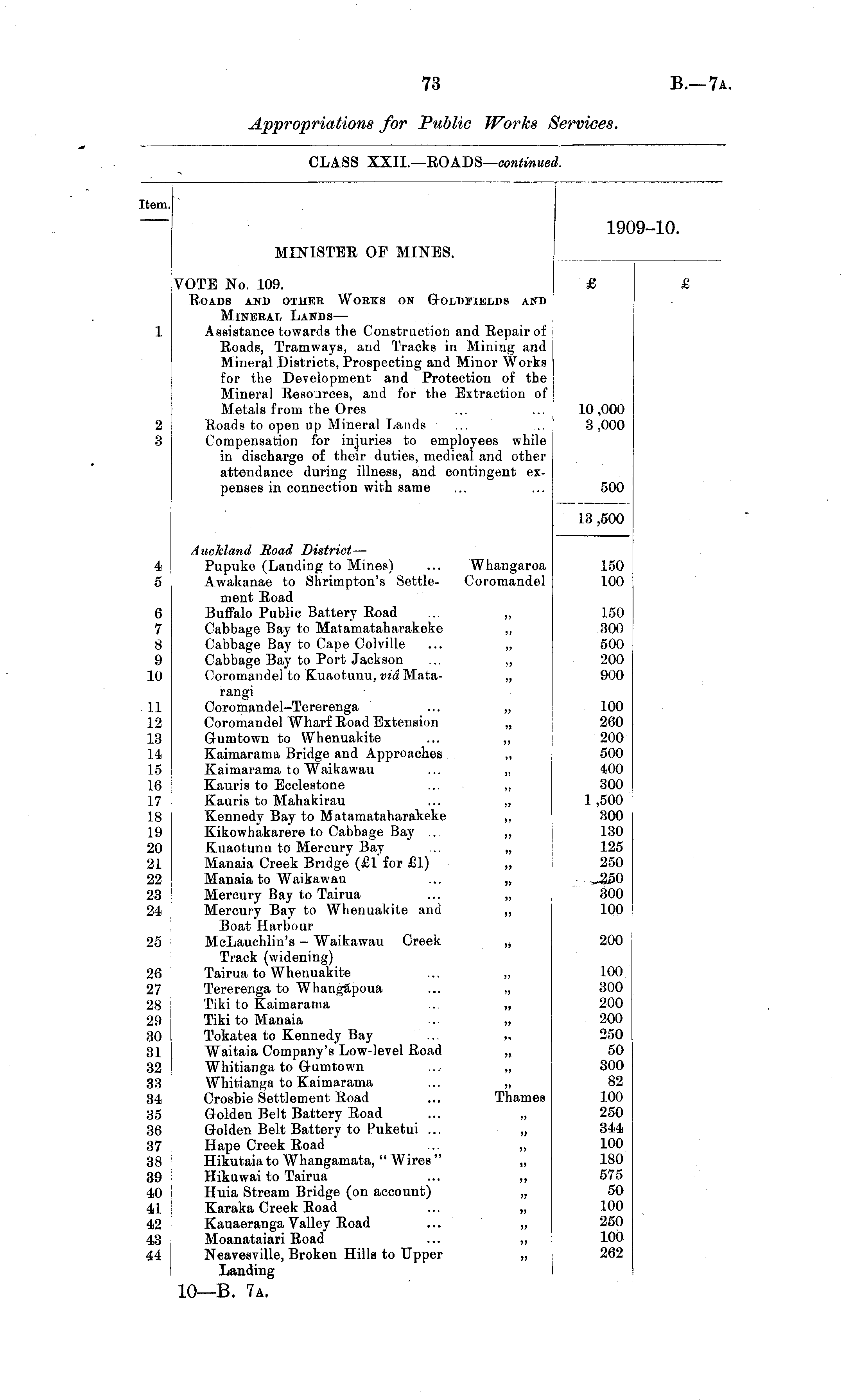 Item. 19 »9-10. MINISTER OF MINES. VOTE No. 109. Roads and othee Wobks on Goldfields and Mineeal Lands— Assistance towards the Construction and Repair of Roads, Tramways, and Tracks in Mining and Mineral Districts, Prospecting and Minor Works for the Development and Protection of the Mineral Resources, and for the Extraction of Metals from the Ores Roads to open up Mineral Lands Compensation for injuries to employees while in discharge of their duties, medical and other attendance during illness, and contingent expenses in connection with same 2 3 10 ,000 3,000 500 13 ,500 4 5 6 7 8 9 10 11 12 13 14 15 16 17 18 19 20 21 22 23 24 Auckland Road District — Pupuke (Landing to Mines) ... Whangaroa Awakanae to Shrimpton's Settle- Coromandel ment Road Buffalo Public Battery Road ... ,, Cabbage Bay to Matamataharakeke ,, Cabbage Bay to Cape Colville ... „ Cabbage Bay to Port Jackson ... „ Coromandel to Kuaotunu, via Mata- „ rangi Coromandel-Tererenga ... „ Coromandel Wharf Road Extension „ Gumtown to Whenuakite ... „ Kaimarama Bridge and Approaches ,, Kaimarama to Waikawau ... „ Kauris to Ecclestone ... ,, Kauris to Mahakirau ... „ Kennedy Bay to Matamataharakeke ,, Kikowhakarere to Cabbage Bay ... ,, Kuaotunu to Mercury Bay ... „ Manaia Creek Bridge (£1 for £1) ,, Manaia to Waikawau ... „ Mercury Bay to Tairua ... „ Mercury Bay to Whenuakite and ,, Boat Harbour McLauchlin's - Waikawau Creek „ Track (widening) Tairua to Whenuakite ... ,, Tererenga to Whang&poua ... „ Tiki to Kaimarama ... „ Tiki to Manaia ... ,, Tokatea to Kennedy Bay ... „ Waitaia Company's Low-level Road „ Whitianga to Gumtown ... ,, Whitianga to Kaimarama ... „ Crosbie Settlement Road ... Thames Golden Belt Battery Road ... „ Golden Belt Battery to Puketui ... „ Hape Creek Road ... ,, Hikutaia to Whangamata, " Wires " „ Hikuwai to Tairua ... ,, Huia Stream Bridge (on account) „ Karaka Creek Road ... „ Kauaeranga Valley Road ... „ Moanataiari Road ... „ Neavesville, Broken Hills to Upper „ Landing 150 100 150 300 500 200 900 100 260 200 500 400 300 1 ,500 300 130 125 250 250 300 100 25 200 26 27 28 29 30 31 32 33 34 35 36 37 38 39 40 41 42 43 44 100 300 200 200 250 50 300 82 100 250 344 100 180 575 50 100 250 100 262