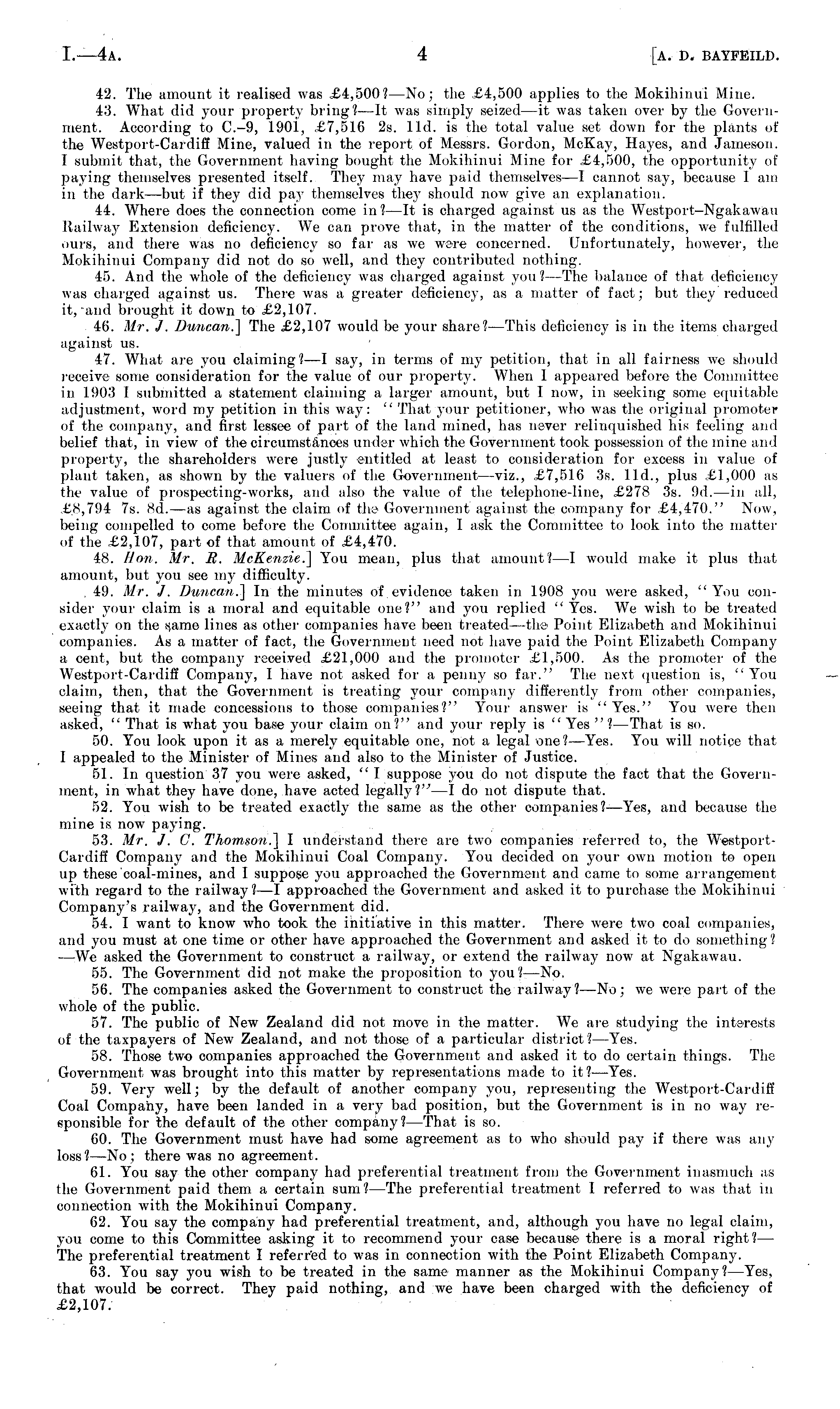 42. The amount it realised was £4,500? —No; the £4,500 applies to the Mokihinui Mine. 43. What did your property bring? —It was simply seized —it was taken over by the Government, According to C.-9, 1901, £7,516 2s. lid. is the total value set down for the plants of the Westport-Cardiff Mine, valued in the report of Messrs. Gordon, McKay, Hayes, and Jameson. I submit that, the Government having bought the Mokihinui Mine for £4,500, the opportunity of paying themselves presented itself. They may have paid themselves—l cannot say, because I am in the dark—but if they did pay themselves the}' should now give an explanation. 44. Where does the connection come in? —It is charged against us as the Westport—Ngakiiwau Railway Extension deficiency. We can prove that, in the matter of the conditions, we fulfilled ours, and there was no deficiency so far as we ware concerned. Unfortunately, however, the Mokihinui Company did not do so well, and they contributed nothing. 45. And the whole of the deficiency was charged against you?— The balance of that deficiency was charged against us. There was a greater deficiency, as a matter of fact; but they reduced it, and brought it down to £2,107. 46. Mr. J. Duncan.] The £2,107 would be your share? —This deficiency is in the items charged against us. 47. What are you claiming? —I say, in terms of my petition, that in all fairness we should receive some consideration for the value of our property. When 1 appeared before the Committee in 1903 I submitted a statement claiming a larger amount, but I now, in seeking some equitable adjustment, word my petition in this way: " That your petitioner, who was the original promoter of the company, and first lessee of part of the land mined, has never relinquished his feeling and belief that, in view of the circumstances under which the Government took possession of the mine and property, the shareholders were justly entitled at least to consideration for excess in value of plant taken, as shown by the valuers of the Government —viz., £7,516 3s. lid., plus £1,000 as the value of prospecting-works, and also the value of the telephone-line, £278 3s. 9d.—in all, £8,794 7s. Bd.—as against the claim of the Government against the company for £4,470." Now, being compelled to come before the Committee again, I ask the Committee to look into the matter of the £2,107, part of that amount of £4,470. 48. Hon. Mr. B. McKenzie.] You mean, plus that amount?—l would make it plus that amount, but you see my difficulty. 49. Mr. J. Duncan.] In the minutes of evidence taken in 1908 you were asked, " You consider your claim is a moral and equitable one?" and you replied "Yes. We wish to be treated exactly on the s,ame lines as other companies have been treated —the Point Elizabeth and Mokihinui companies. As a matter of fact, the Government need not have paid the Point Elizabeth Company a cent, but the company received £21,000 and the promoter £1,500. As the promoter of the Westport-Cardiff Company, I have not asked for a penny so far." The next question is, " You claim, then, that the Government is treating your company differently from other companies, seeing that it made concessions to those companies?" Your answer is " Yes." You were then asked, " That is w r hat you base your claim on?" and your reply is " Yes " ?—That is so. 50. You look upon it as a merely equitable one, not a legal one? —Yes. You will notice that I appealed to the Minister of Mines and also to the Minister of Justice. 51. In question 37 you were asked, " I suppose you do not dispute the fact that the Government, in what they have done, have acted legally?"—I do not dispute that. 52. You wish to be treated exactly the same as the other companies?— Yes, and because the mine is now paying. 53. Mr. J. U. Thomson.] I understand there are two companies referred to, the WestportCardiff Company and the Mokihinui Coal Company. You decided on your own motion to open up these coal-mines, and I suppose you approached the Government and came to some arrangement with regard to the railway ?—I approached the Government and asked it to purchase the Mokihinui Company's railway, and the Government did. 54. I want to know who took the initiative in this matter. There were two coal companies, and you must at one time or other have approached the Government and asked it to do something? —We asked the Government to construct a railway, or extend the railway now at Ngakawau. 55. The Government did not make the proposition to you?— No. 56. The companies asked the Government to construct the railway?—No; we were part of the whole of the public. 57. The public of New Zealand did not move in the matter. We are studying the interests of the taxpayers of New Zealand, and not those of a particular district ? —Yes. 58. Those two companies approached the Government and asked it to do certain things. The Government was brought into this matter by representations made to it? —Yes. 59. Very well; by the default of another company you, representing the Westport-Cardiff Coal Company, have been landed in a very bad position, but the Government is in no way responsible for the default of the other company?— That is so. 60. The Government must have had some agreement as to who should pay if there was any loss?—No; there was no agreement. 61. You say the other company had preferential treatment from the Government inasmuch as the Government paid them a certain sum? —The preferential treatment I referred to was that in connection with the Mokihinui Company. 62. You say the company had preferential treatment, and, although you have no legal claim, you come to this Committee asking it to recommend your case because there is a moral right? — The preferential treatment I referred to was in connection with the Point Elizabeth Company. 63. You say you wish to be treated in the same manner as the Mokihinui Company?— Yes, that would be correc