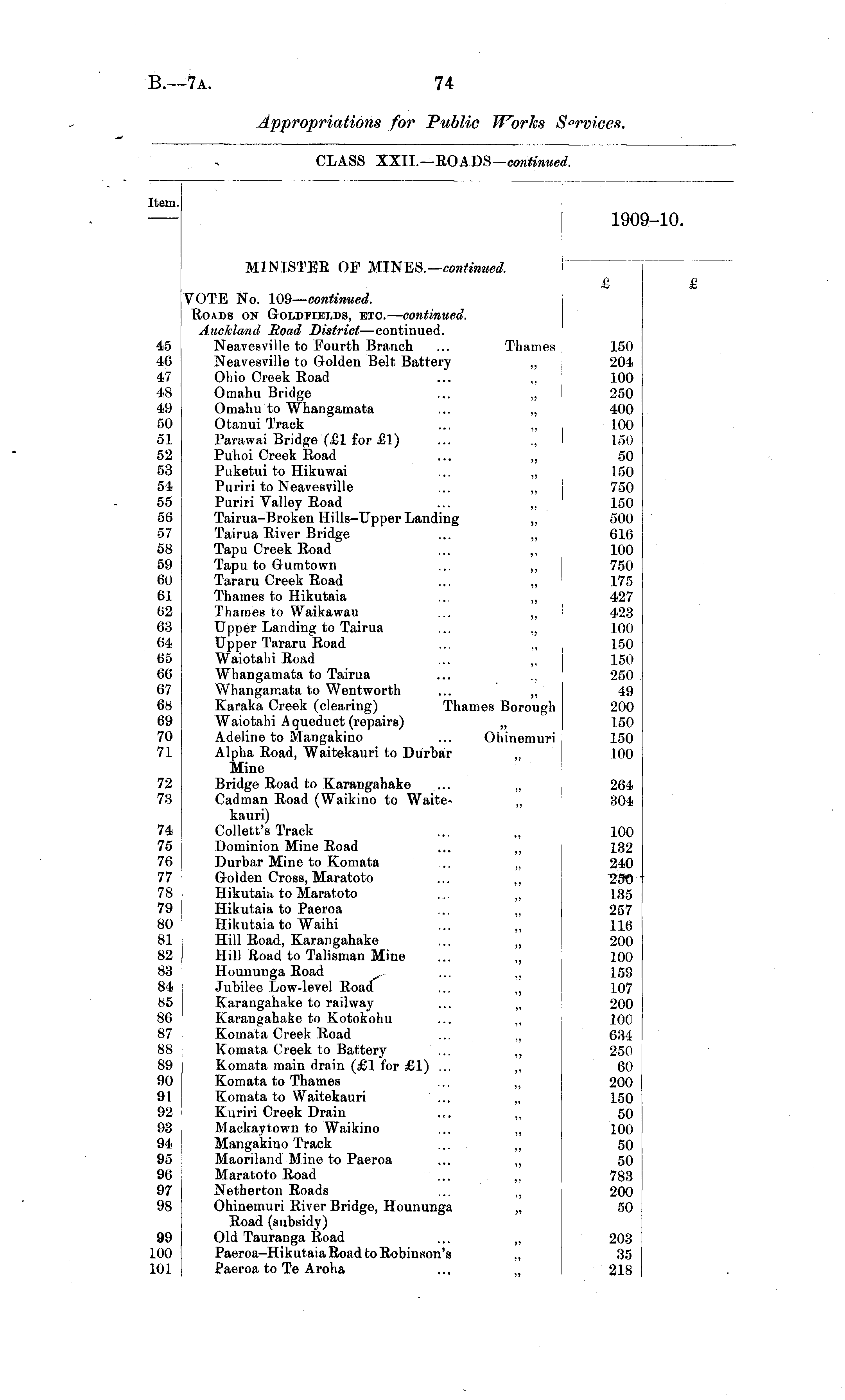 item. 190' 1-10. MINISTER OF MINES.— continued. VOTE No. 109— continued. Roads on Goldfields, etc. — continued. Auckland Road District —continued. Neavesville to Fourth Branch ... Thames Neavesville to Golden Belt Battery ,, Ohio Creek Road ... ,, Omahu Bridge ... ,, Omahu to Whangamata ... ,, Otanui Track ... „ Parawai Bridge (£1 for £1) ... ., Puhoi Creek Road ... „ Puketui to Hikuwai ... „ Puriri to Neavesville ... ,, Puriri Valley Road ... ,, Tairua-Broken Hills-Upper Landing „ Tairua River Bridge ... „ Tapu Creek Road ... ,, Tapu to Gumtown ... ,, Tararu Creek Road ... „ Thames to Hikutaia ... ,, Thames to Waikawau ... ,, Upper Landing to Tairua ... ,, Upper Tararu Road ... ., Waiotahi Road ... „ Whangamata to Tairua ... ., Whangamata to Wentworth ... ,, Karaka Creek (clearing) Thames Borough Waiotahi A queduct (repairs) „ Adeline to Mangakino ... Ohinemuri Alpha Road, Waitekauri to Durbar ,, Mine Bridge Road to Karangahake ... „ Cadman Road (Waikino to Waite- „ kauri) Collett's Track Dominion Mine Road ... „ Durbar Mine to Komata ... Golden Cross, Maratoto ... ,, Hikutaia to Maratoto ... „ Hikutaia to Paeroa ,'., n Hikutaia to Waihi ... „ Hill Road, Karangahake ... „ Hill Road to Talisman Mine ... „ Hoununga Road ... ,, Jubilee Low-level Road ... ,, Karangahake to railway ... „ Karangahake to Kotokohu ... ,, Komata Creek Road ... „ Komata Creek to Battery ... ,, Komata main drain (£1 for £1) ... ,, Komata to Thames ... ,, Komata to Waitekauri ... „ Kuriri Creek Drain ... ,, Mackaytown to Waikino ... „ Mangakino Track ... Maoriland Mine to Paeroa ... ,, Maratoto Road ... „ Netherton Roads ... ,, Ohinemuri River Bridge, Hoununga „ Road (subsidy) Old Tauranga Road ... „ Paeroa-HikutaiaRoad to Robinson's ,, Paeroa to Te Aroha ... „ £ 45 46 47 48 49 50 51 52 53 54 55 56 57 58 59 60 61 62 63 64 65 66 67 68 69 70 71 150 204 100 250 400 100 150 50 150 750 150 500 616 100 750 175 427 423 100 150 150 250 49 200 150 150 100 72 73 264 304 74 75 76 77 78 79 80 81 82 83 84 85 86 87 88 89 90 91 92 93 94 95 96 97 98 100 132 240 250 135 257 116 200 100 159 107 200 100 634 250 60 200 150 50 100 50 50 783 200 50 99 100 101 203 35 218