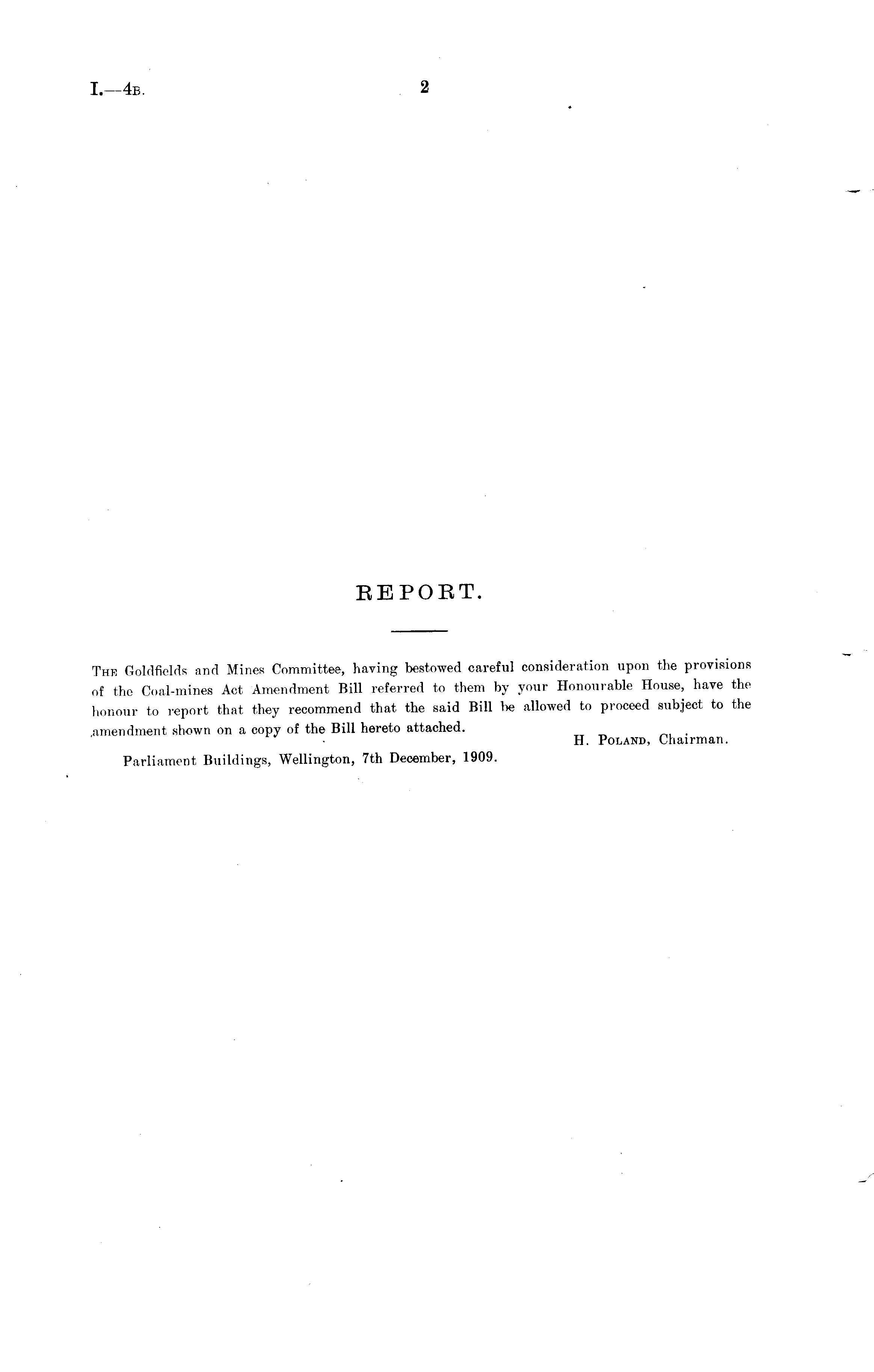 The Goldfields and Mines Committee, having bestowed careful consideration upon the provisions of the Coal-mines Act Amendment Bill referred to them by your Honourable House, have the honour to report that they recommend that the said Bill lie allowed to proceed subject to the amendment shown on a copy of the Bill hereto attached. H. Poland, Chairman. Parliament Buildings, Wellington, 7th December, 1909.