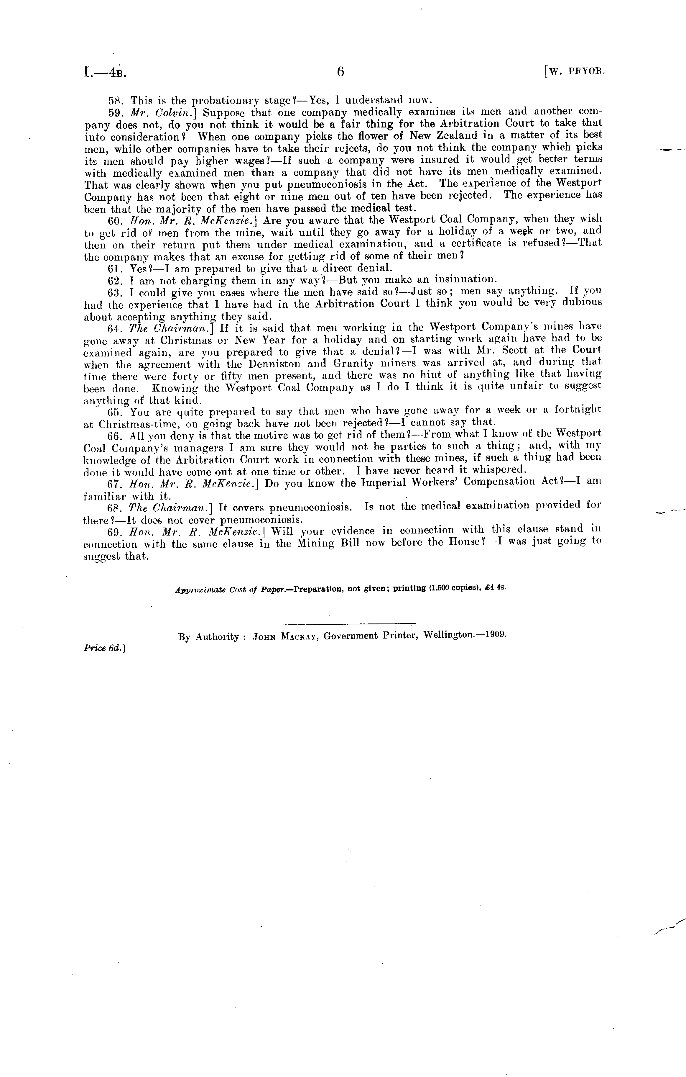 58. This is the probationary stage?— Yes, 1 understand now. 59. Mr. Colvin.] Suppose that one company medically examines its men and another company does not, do you not think it would be a fair thing for the Arbitration Court to take that into consideration? When one company picks the flower of New Zealand in a matter of its best men, while other companies have to take their rejects, do you not think the company which picks its men should pay higher wages?—lf such a company were insured it would get better terms with medically examined men than a company that did not have its men medically examined. That was clearly shown when you put pneumoconiosis in the Act. The experience of the Westport Company has not been that eight or nine men out of ten have been rejected. The experience has been that the majority of the men have passed the medical test. 60. Hon. Mr. E. McKenzie.] Are you aware that the Westport Coal Company, when they wish to get rid of men from the mine, wait until they go away for a holiday of a week or two, and then on their return put them under medical examination, and a certificate is refused? — That the company makes that an excuse for getting rid of some of their men ? 61. Yes?—l am prepared to give that a direct denial. 62. I am not charging them in any way?— But you make an insinuation. 63. I could give you cases where the men have said so?— Just so; men say anything. If you had the experience that I have had in the Arbitration Court I think you would be very dubious about accepting anything they said. 64. The Chairman.] If it is said that men working in the Westport Company's mines have gone away at Christmas or New Year for a holiday and on starting work again have had to be examined again, are you prepared to give that a denial? —I was with Mr. Scott at the Court when the agreement with the Denniston and Granity miners was arrived at, and during that time there were forty or fifty men present, and there was no hint of anything like that having been done. Knowing the Westport Coal Company as I do I think it is quite unfair to suggest anything of that kind. 65. You are quite prepared to say that men who have gone away for a week or a fortnight at Christmas-time, on going back have not been rejected?—l cannot say that. 66. All you deny is that the motive was to get rid of them?— From what I know of the Westport Coal Company's managers I am sure they would not be parties to such a thing; and, with my knowledge of "the Arbitration Court work in connection with these mines, if such a thing had been done it would have come out at one time or other. I have never heard it whispered. 67. Hon. Mr. E. McKenzie.] Do you know the Imperial Workers' Compensation Act?—l am familiar with it. 68. The Chairman.] It covers pneumoconiosis. Is not the medical examination provided for there? —It doss not cover pneumoconiosis. 69. Hon. Mr. E. McKenzie.] Will your evidence in connection with this clause stand in connection with the same clause in the Mining Bill now before the House?—l was just going to suggest that.