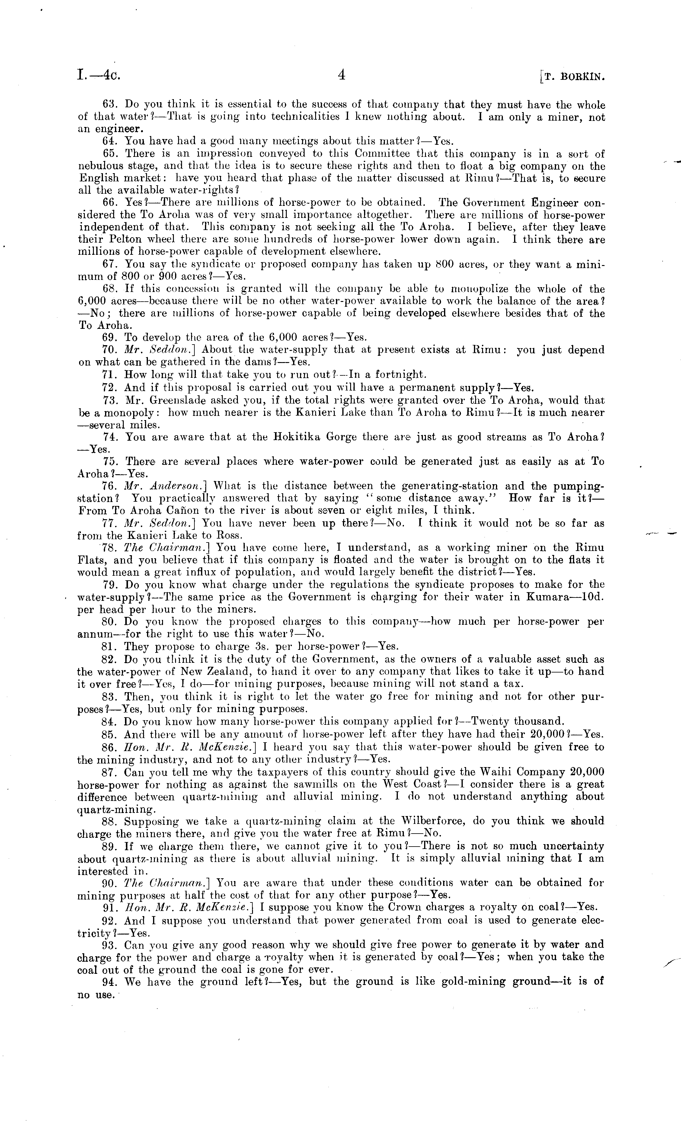 63. Do you think it is essential to the success of that company that they must have the whole of that water? —That is going into technicalities I knew nothing about. lam only a miner, not an engineer. 64. You have had a good many meetings about this matter?— Yes. 65. There is an impression conveyed to this Committee that this company is in a sort of nebulous stage, and that the idea is to secure these rights and then to float a big company on the English market: have you heard that phase of the matter discussed at Rimu?—That is, to secure all the available water-rights? 66. Yes?— There are millions of horse-power to be obtained. The Government Engineer considered the To Aroha was of very small importance altogether. There are millions of horse-power independent of that. This company is not seeking all the To Aroha. I believe, after they leave their Pelton wheel there are some hundreds of horse-power lower down again. I think there are millions of horse-power capable of development elsewhere. 67. You say the syndicate or proposed company has taken up 800 acres, or they want a minimum of 800 or 900 acres?— Yes. 68. If this concession is granted will the company be able to monopolize the whole of the 6,000 acres—because there will be no other water-power available to work the balance of the area? —No; there are millions of horse-power capable of being developed elsewhere besides that of the To Aroha. 69. To develop the area of the 6,000 acres?— Yes. 70. Mr. Seddon.] About the water-supply that at present exists at Rimu: you just depend on what can be gathered in the dams?— Yes. 71. How long will that take you to run out?—-In a fortnight. 72. And if this proposal is carried out you will have a permanent supply?— Yes. 73. Mr. Greenslade asked you, if the total rights were granted over the To Aroha, would that be a monopoly: how much nearer is the Kanieri Lake than To Aroha to Rimu? —It is much nearer —several miles. 74. You are aware that at the Hokitika Gorge there are just as good streams as To Aroha? —Yes. 75. There are several places where water-power could be generated just as easily as at To Aroha? —Yes. 76. Mr. Anderson.] What is the distance between the generating-station and the pumpingstation? You practically answered that by saying " some distance away." How far is it? — From To Aroha Canon to the river is about seven or eight miles, I think. 77. Mr. Seddon.] You have never been up there?— No. I think it would not be so far as from the Kanieri Lake to Ross. 78. The Chairman.] You have come here, I understand, as a working miner on the Rimu Flats, and you believe that if this company is floated and the water is brought on to the flats it would mean a great influx of population, and would largely benefit the district?— Yes. 79. Do you know what charge under the regulations the syndicate proposes to make for the water-supply? —The same price as the Government is charging for their water in Kumara—lOd. per head per hour to the miners. 80. Do you know the proposed charges to this company -how much per horse-power per annum —for the right to use this water?— No. 81. They propose to charge 3s. per horse-power?— Yes. 82. Do you think it is the duty of the Government, as the owners of a valuable asset such as the water-power of New Zealand, to hand it over to any company that likes to take it up—to hand it over free?— Yes, I do—for mining purposes, because mining will not stand a tax. 83. Then, you think it is right to let the water go free for mining and not for other purposes?— Yes, but only for mining purposes. 84. Do you know how many horse-power this company applied for? —Twenty thousand. 85. And there will be any amount of horse-power left after they have had their 20,000? —Yes. 86. lion. Mr. 11. McKenzie.] 1 heard you say that this water-power should be given free to the mining industry, and not to any other industry?— Yes. 87. Can you tell me why the taxpayers of this country should give the Waihi Company 20,000 horse-power for nothing as against the sawmills on the West Coast?—l consider there is a great difference between quartz-mining and alluvial mining. I do not understand anything about quartz-mining. 88. Supposing we take a quartz-mining claim at the Wilberforce, do you think we should charge the miners there, and give you the water free at Rimu?—No. 89. If we charge them there, we cannot give it to you?— There is not so much uncertainty about quartz-mining as there is about alluvial mining. It is simply alluvial mining that I am interested in. 90. The Chairman.] You are aware that under these conditions water can be obtained for mining purposes at half the cost of that for any other purpose?— Yes. 91. Hon. Mr. It. McKenzie.] I suppose you know the Crown charges a royalty on coal? —Yes. 92. And I suppose you understand that power generated from coal is used to generate electricity?— Yes. 93. Can you give any good reason why we should give free power to generate it by water and charge for the power and charge a royalty when it is generated by coal?— Yes; when you take the coal out of the ground the coal is gone for ever. 94. We have the ground left? —Yes, but the ground is like gold-mining ground—it is of no use.