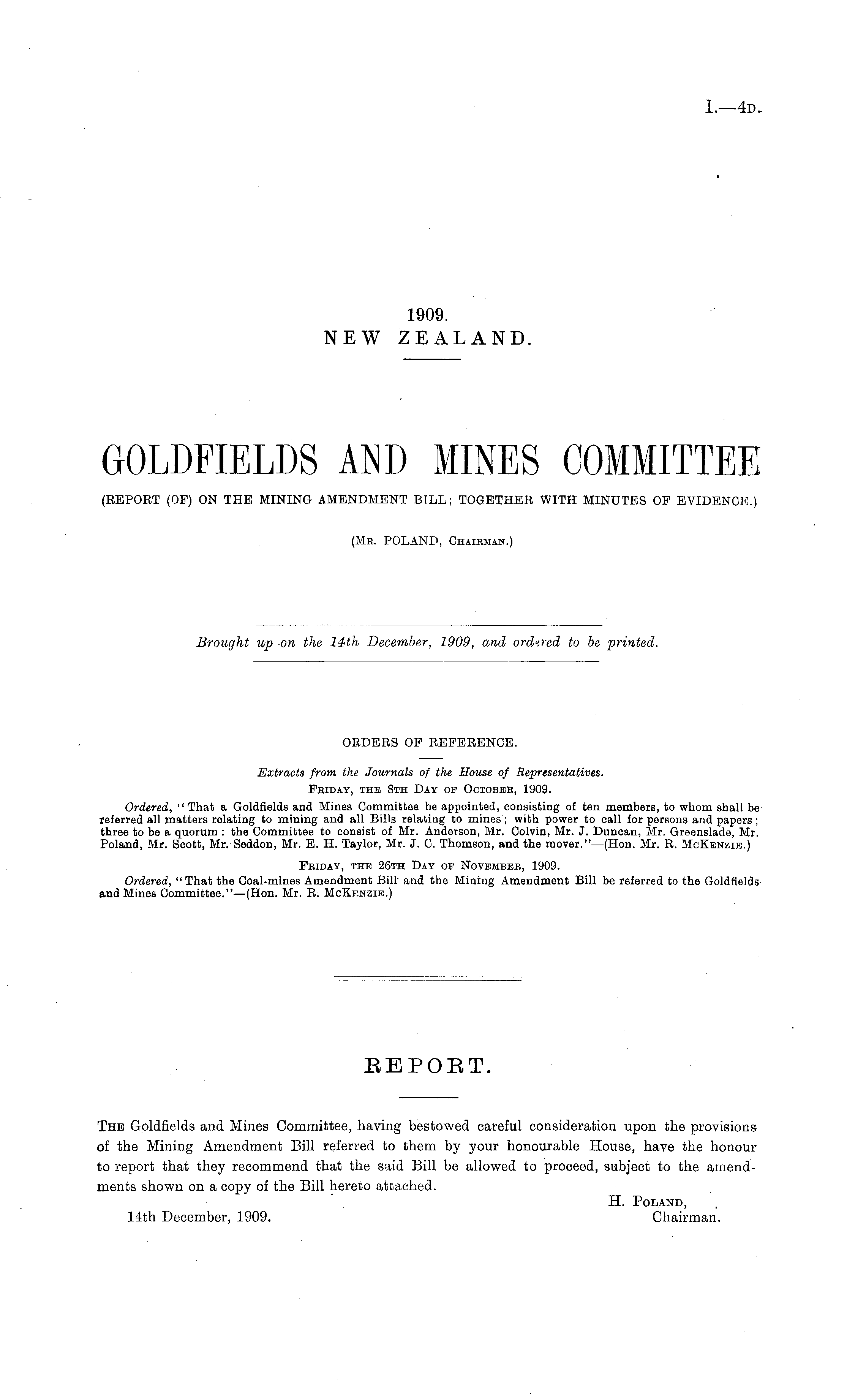 ORDERS OP REFERENCE. Extracts from the Journals of the House of Representatives. Fbiday, the Bth Day of Octobee, 1909. Ordered, "That a Goiafieias and Mines Committee be appointed, consisting of ten members, to whom shall be referred all matters relating to mining and all Bills relating to mines ; with power to call for persons and papers ; three to be a quorum : the Committee to consist of Mr. Anderson, Mr. Colvin, Mr. J. Duncan, Mr. Greenslade, Mr. Poland, Mr. Scott, Mr. Seddon, Mr. E. H. Taylor, Mr. J. C. Thomson, and the mover."—(Hon. Mr. R. McKenzie.) Peiday, the 26th Day op Novembee, 1909. Ordered, "That the Coal-mines Amendment Bill ana the Mining Amenament Bill be referred to the Goiafieias ana Mines Committee."—(Hon. Mr. R. McKenzib.)