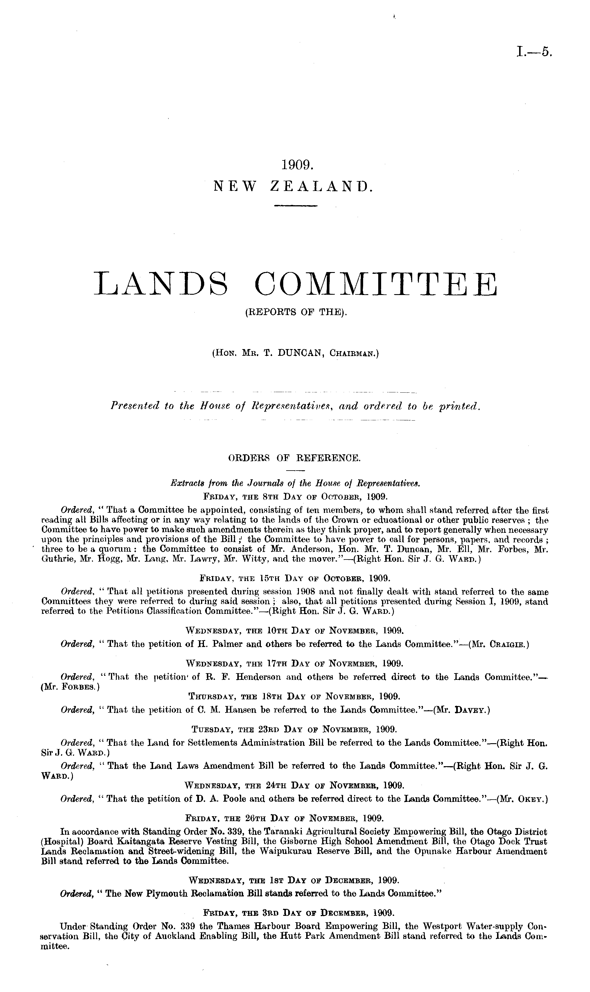 ORDERS OF REFERENCE. Extracts from the Journals of the House of Representatives. Friday, the Bth Day of October, 1909. Ordered, " That a Committee be appointed, consisting of ten members, to whom shall stand referred after the first reading all Bills affecting or in any way relating to the lands of the Crown or educational or other public reserves ; the Committee to have power to make such amendments therein as they think proper, and to report generally when necessary upon the principles and provisions of the Bill;' the Committee to have power to call for persons, papers, and records ; three to be a quorum : the Committee to consist of Mr. Anderson, Hon. Mr. T. Duncan, Mr. Ell, Mr. Forbes, Mr. Guthrie, Mr. Hogg, Mr. Lang, Mr. La wry, Mr. Witty, and the mover."—(Right Hon. Sir J. G. Ward.) Friday, the 15th Day of October, 1909. Ordered, " That all petitions presented during session 1908 and not finally dealt with stand referred to the same Committees they were referred to during said session ; also, that all petitions presented during Session I, 1909, stand referred to the Petitions Classification Committee."—(Right Hon. Sir J. G. Ward.) Wednesday, the 10th Day of November, 1909. Ordered, " That the petition of H. Palmer and others be referred to the Lands Committee."—(Mr. Craiqie.) Wednesday, the 17th Day of November, 1909. Ordered, " That the petition' of R. F. Henderson and others be referred direct to the Lands Committee."— (Mr. Forbes.) Thursday, the 18th Day of November, 1909. Ordered, " That the petition of C. M. Hansen be referred to the Lands Committee."—(Mr. Davey.) Tuesday, the 23rd Day of November, 1909. Ordered, " That the Land for Settlements Administration Bill be referred to the Lands Committee.".—(Right Hon. Sir J. G. Ward.) Ordered, " That the Land Laws Amendment Bill be referred to the Lands Committee."—(Right Hon. Sir J. G. Ward.) Wednesday, the 24th Day op November, 1909. Ordered, " That the petition of D. A. Poole and others be referred direct to the Lands Committee."—(Mr. Okey.) Friday, the 26th Day of November, 1909. In accordance with Standing Order No. 339, the Taranaki Agricultural Society Empoweiing Bill, the Otago Distriot (Hospital) Board Kaitangata Reserve Vesting Bill, the Gisborne High School Amendment Bill, the Otago Dock Trust Lands Reclamation and Street-widening Bill, the Waipukurau Reserve Bill, and the Opunake Harbour Amendment Bill stand referred to the Lands Committee. Wednesday, the Ist Day of December, 1909. Ordered, " The New Plymouth Reclamation Bill stands referred to the Lands Committee." Friday, the 3rd Day of December, 1909. Under Standing Order No. 339 the Thames Harbour Board Empowering Bill, the Westport Water-supply Conservation Bill, the City of Auckland Enabling Bill, the Hutt Park Amendment Bill stand referred to the Lands Committee.
