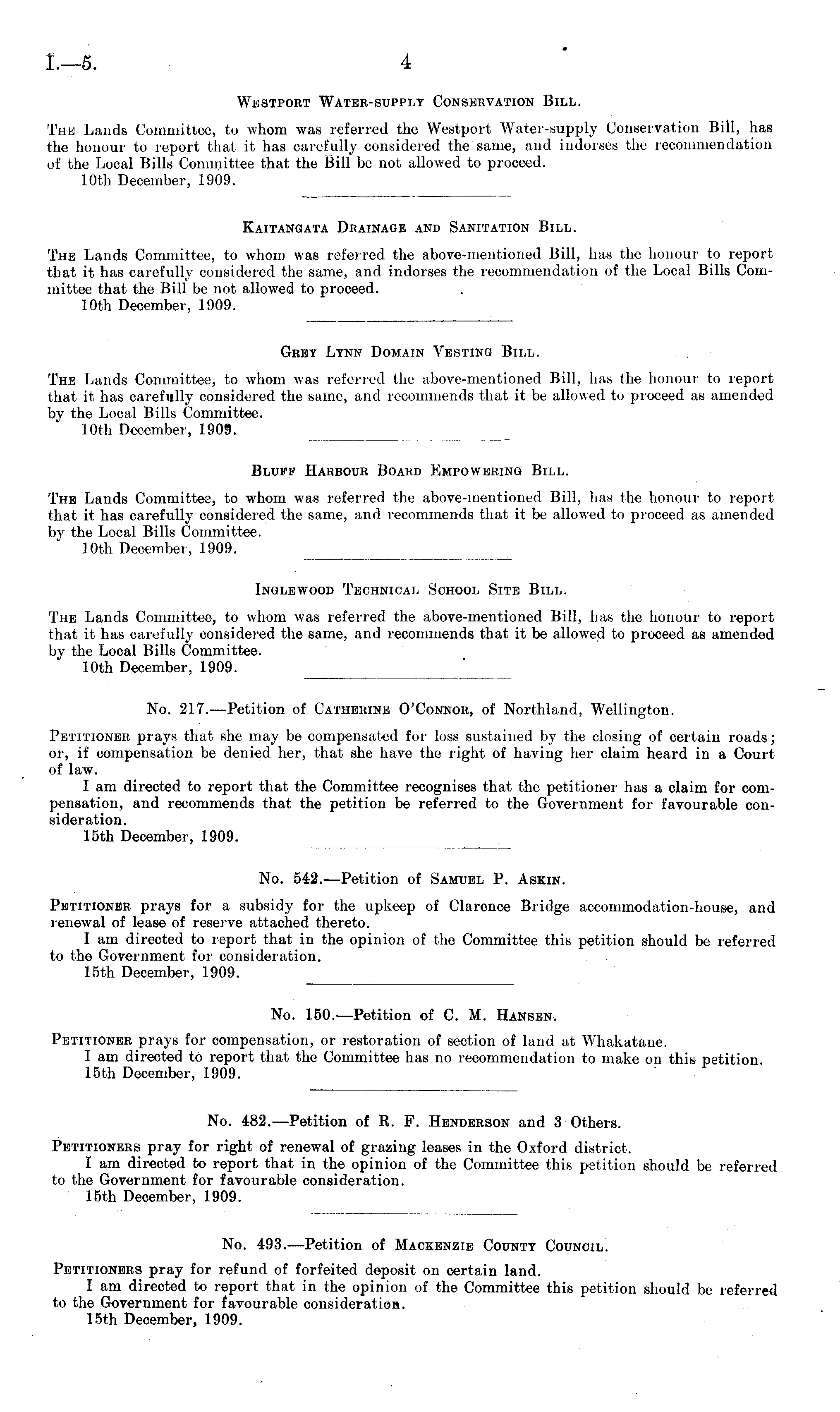 Kaitangata Drainage and Sanitation Bill. The Lands Committee, to whom was referred the above-mentioned Bill, has the honour to report that it has carefully considered the same, and indorses the recommendation of the Local Bills Committee that the Bill be not allowed to proceed. 10th December, 1909. Grey Lynn Domain Vesting Bill. The Lands Committee, to whom was referred the above-mentioned Bill, has the honour to report that it has carefully considered the same, and recommends that it be allowed to proceed as amended by the Local Bills Committee. 10th December, 1909. Bluff Harbour Board Empowering Bill. The Lands Committee, to whom was referred the above-mentioned Bill, has the honour to report that it has carefully considered the same, and recommends that it be allowed to proceed as amended by the Local Bills Committee. 10th December, 1909. Ingle wood Technical School Site Bill. The Lands Committee, to whom was referred the above-mentioned Bill, has the honour to report that it has carefully considered the same, and recommends that it be allowed to proceed as amended by the Local Bills Committee. 10th December, 1909. No. 217.—Petition of Catherine O'Connor, of Northland, Wellington. Petitioner prays that she may be compensated for loss sustained b}' the closing of certain roads; or, if compensation be denied her, that she have the right of having her claim heard in a Court of law. I am directed to report that the Committee recognises that the petitioner has a claim for compensation, and recommends that the petition be referred to the Government for favourable consideration. 15th December, 1909. No. 542.—Petition of Samuel P. Askin. Petitioner prays for a subsidy for the upkeep of Clarence Bridge accommodation-house, and renewal of lease of reserve attached thereto. I am directed to report that in the opinion of the Committee this petition should be referred to the Government for consideration. 15th December, 1909. No. 150.—Petition of C. M. Hansen. Petitioner prays for compensation, or restoration of section of land at Whakataue. I am directed to report that the Committee has no recommendation to make on this petition 15th December, 1909. No. 482.—Petition of R. F. Henderson and 3 Others. Petitioners pray for right of renewal of grazing leases in the Oxford district. I am directed to report that in the opinion of the Committee this petition should be referred to the Government for favourable consideration. 15th December, 1909. No. 493.—Petition of Mackenzie County Council Petitioners pray for refund of forfeited deposit on certain land. I am directed to report that in the opinion of the Committee this petition should be referred to the Government for favourable consideration. 15th December, 1909.