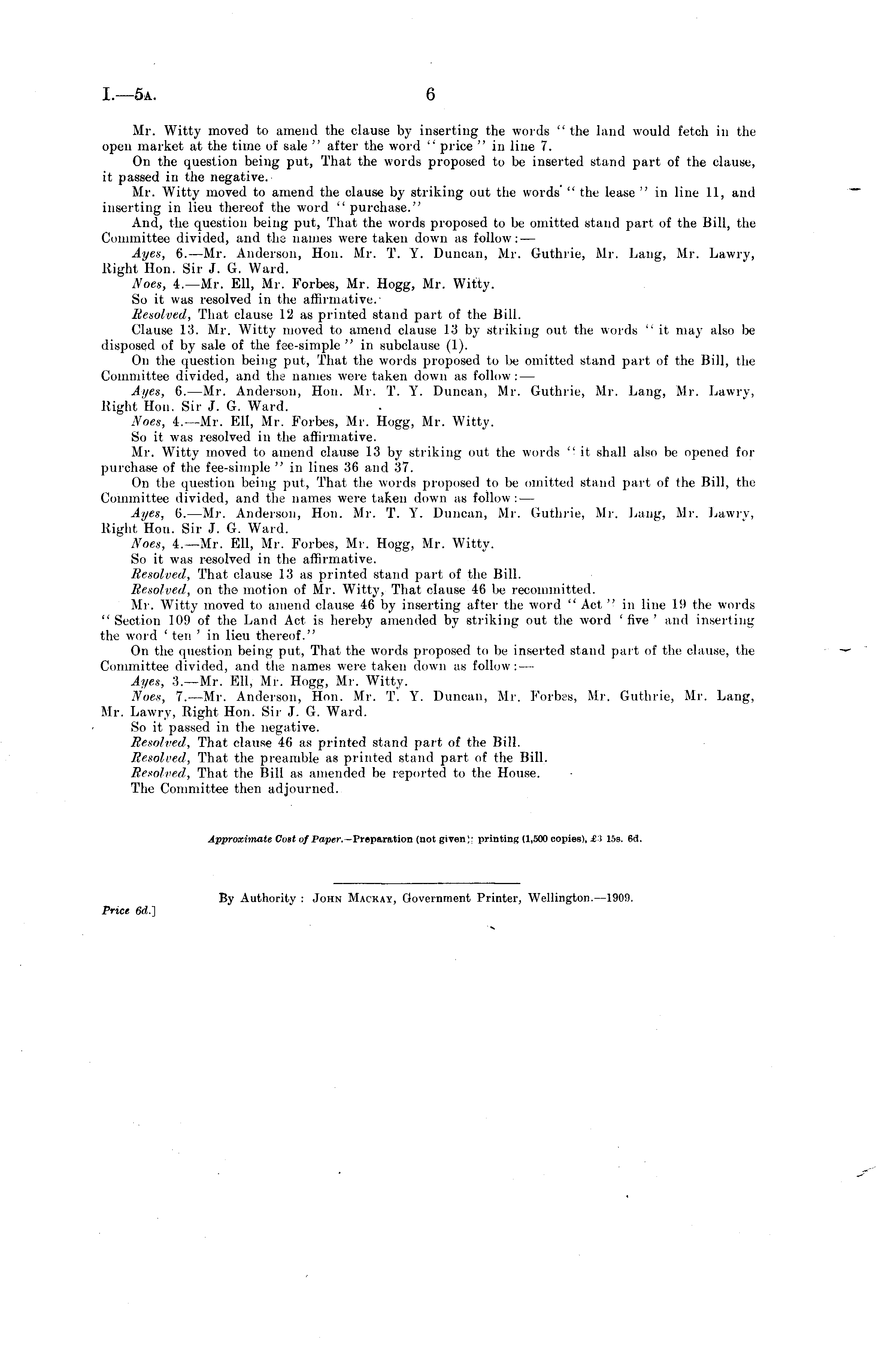 Mr. Witty moved to amend the clause by inserting the words " the land would fetch in the open market at the time of sale " after the word " price " in line 7. On the question being put, That the words proposed to be inserted stand part of the clause, it passed in the negative. Mr. Witty moved to amend the clause by striking out the words' " the lease " in line 11, and inserting in lieu thereof the word " purchase." And, the question being put, That the words proposed to be omitted stand part of the Bill, the Committee divided, and the names were taken down as follow: — Ayes, 6.—Mr. Anderson, Hon. Mr. T. Y. Duncan, Mr. Guthrie, Mr. Lang, Mr. Lawry, Right Hon. Sir J. G. Ward. Noes, 4.—Mr. Ell, Mr. Forbes, Mr. Hogg, Mr. Witty. So it was resolved in the affirmative. Resolved, That clause 12 as printed stand part of the Bill. Clause 13. Mr. Witty moved to amend clause 13 by striking out the words " it may also be disposed of by sale of the fee-simple " in subclause (1). On the question being put, That the words proposed to be omitted stand part of the Bill, the Committee divided, and the names were taken down as follow: — Ayes, 6.—Mr. Anderson, Hon. Mr. T. Y. Duncan, Mr. Guthrie, .Mr. Lang, Mr. Lawry, Right Hon. Sir J. G. Ward. Noes, 4.—Mr. Ell, Mr. Forbes, Mr. Hogg, Mr. Witty. So it was resolved in the affirmative. Mr. Witty moved to amend clause 13 by striking out the words " it shall also be opened for purchase of the fee-simple " in lines 36 and 37. On the question being put, That the words proposed to be omitted stand part of the Bill, the Committee divided, and the names were taken down as follow: — Ayes, 6.—Mr. Anderson, Hon. Mr. T. Y. Duncan, Mr. Guthrie, Mr. Lang, Mr. Lawry, Right Hon. Sir J. G. Ward. Noes, 4.—Mr. Ell, Mr. Forbes, Mr. Hogg, Mr. Witty. So it was resolved in the affirmative. Resolved,, That clause 13 as printed stand part of the Bill. Resolved, on the motion of Mr. Witty, That clause 46 be recommitted. Mr. Witty moved to amend clause 46 by inserting after the word " Act " in line 19 the words "Section 109 of the Land Act is hereby amended by striking out the word 'five' and inserting the word ' ten ' in lieu thereof." On the question being put, That the words proposed to be inserted stand pari of the clause, the Committee divided, and the names were taken down as follow: — Ayes, 3.—Mr. Ell, Mr. Hogg, Mr. Witty. Noes, 7. —Mr. Anderson, Hon. Mr. T. Y. Duncan, Mr. Forbes, Mr. Guthrie, Mr. hang, Mr. Lawry, Right Hon. Sir J. G. Ward. So it passed in the negative. Resolved, That clause 46 as printed stand part of the Bill. Resolved, That the preamble as printed stand part of the Bill. Resolved, That the Bill as amended be reported to the House. The Committee then adjourned.