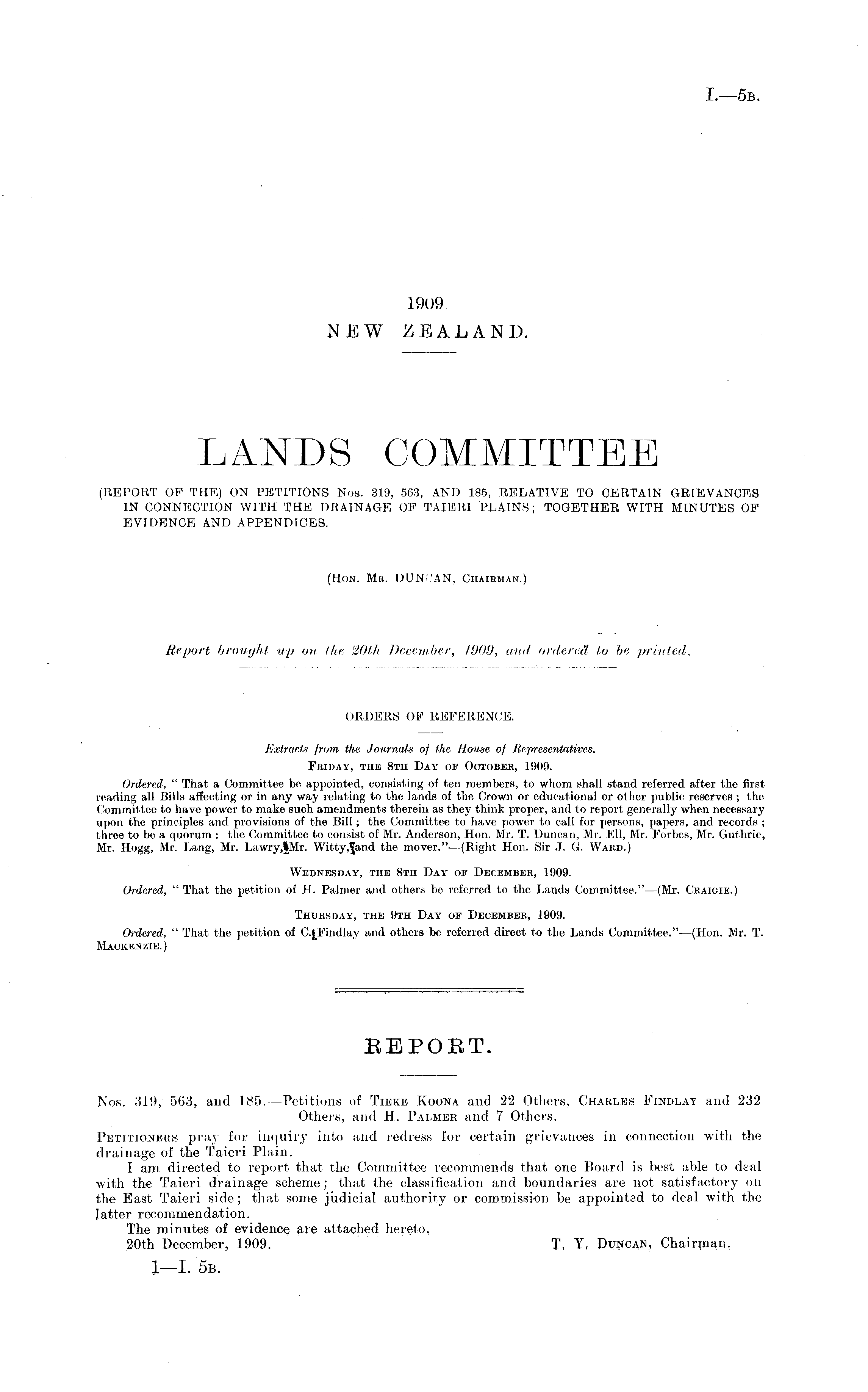 LANDS COMMITTEE (REPORT OF THE) ON PETITIONS Nos. 319, 563, AND 185, RELATIVE TO CERTAIN GRIEVANCES IN CONNECTION WITH THE DRAINAGE OF TAIERI PLAINS; TOGETHER WITH MINUTES OF EVIDENCE AND APPENDICES. (Hon. Mr. DUNCAN, Chairman.)