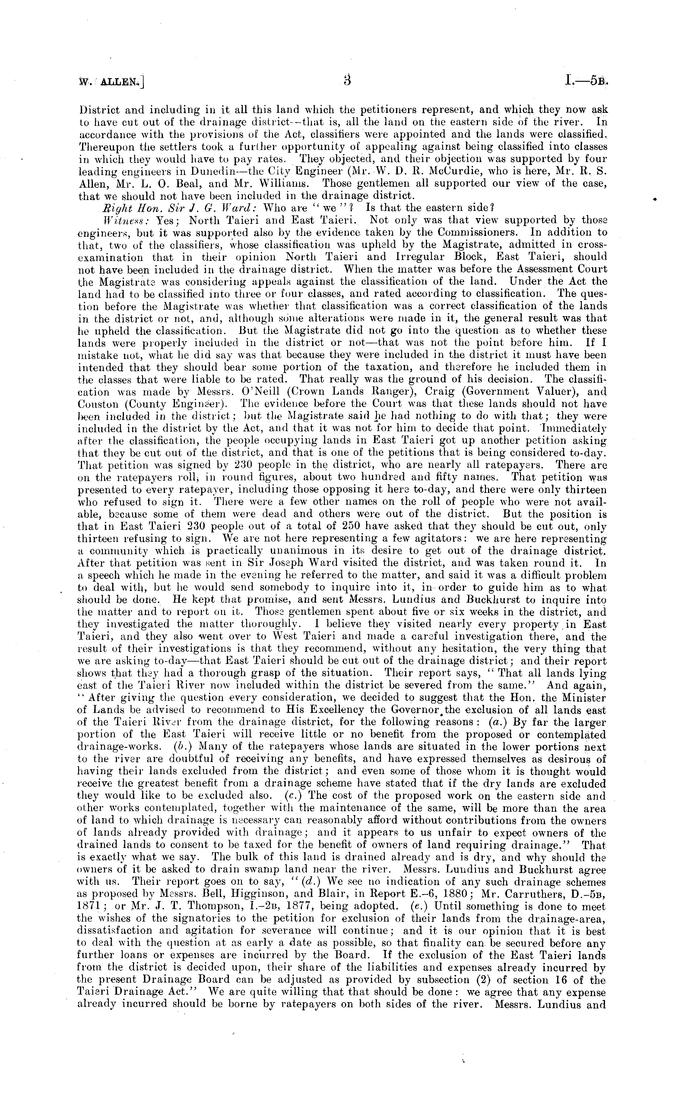 District and including in it all this land which the petitioners represent, and which they now ask to have cut out of the drainage district- that is, all the land on the eastern side of the river. In accordance with the provisions of the Act, classifiers were appointed and the lands were classified. Thereupon the settlers Look a further opportunity of appealing against being classified into classes in which they would have to pay rates. They objected, and their objection was supported by four leading engineers in Dunedin —the City Engineer (Mr. W. J). R. McCurdie, who is here, Mr. R. S. Allen, Mr. L. 0. Beal, and Mr. Williams. Those gentlemen all supported our view of the case, that we should not have been included in the drainage district. Eight Hon. Sir J. (J. Ward: Who are "we "1 Is that the eastern side? Witness: Yes; North Taieri and Kast Taieri. Not only was that view supported by those engineers, but it was supported also by the evidence taken by the Commissioners. In addition to that, two of the classifiers, whose classification was upheld by the Magistrate, admitted in crossexamination that in their opinion North Taieri and Irregular Block, East Taieri, should not have been included in the drainage district. When the matter was before the Assessment Court the Magistrate was considering appeals against the classification of the land. Under the Act the land had to be classified into three or four classes, and rated according to classification. The question before the Magistrate was whether that classification was a correct classification of the lands in the district or not, and, although some alterations were made in it, the general result was that he upheld the classification. But the Magistrate did not go into the question as to whether these lands were properly included in the district or not—that was not the point before him. If I mistake not, what he did say was that because they were included in the district it must have been intended that they should bear some portion of the taxation* and therefore he included them in the classes that were liable to be rated. That really was the ground of his decision. The classification was made by Messrs. O'Neill (Crown Lands Ranger), Craig (Government Valuer), and Couston (County Engineer). The evidence before the Court was that these lands should not have been included in the district ; but the Magistrate said lie had nothing to do with that; they were included in the district by the Act, and that it was not for him to decide that point. Immediately after the classification, the people occupying lands in East Taieri got up another petition asking that they be cut out of the district, and that is one of the petitions that is being considered to-day. That petition was signed by 230 people in the district, who are nearly all ratepayers. There are on the ratepayers roll, in round figures, about two hundred and fifty names. That petition was presented to every ratepayer, including those opposing it here to-day, and there were only thirteen who refused to sign it. There were a few other names on the roll of people who were not available, because some of them were dead and others were out of the district. But the position is that in East Taieri 230 people out of a total of 250 have asked that they should be cut out, only thirteen refusing to sign. We are not here representing a few agitators: we are here representing acm unity which is practically unanimous in its desire to get out of the drainage district. After that petition was sent in Sir Joseph W T ard visited the district, and was taken round it. In a speech which he made in the evening he referred to the matter, and said it was a difficult problem to deal with, but he would send somebody to impure into it, in order to guide him as to what should be done. He kept that promise, and sent Messrs. Lundius and Buckhurst to impure into the matter and to report on it. Those gentlemen spent about five or six weeks in the district, and they investigated the matter thoroughly. I believe they visited nearly every property in East Taieri, and they also went over to West Taieri and made a careful investigation there, and the result id' their investigations is that they recommend, without any hesitation, the very thing that we are asking to-day—that East Taieri should be cut out of the drainage district; and their report shows that they had a thorough grasp of the situation. Their report says, " That all lands lying east of the Taieri River now included within the district be severed from the same." And again, " After giving tin question every consideration, we decided to suggest that the Hon. the Minister of Lands be advised to recommend to His Excellency the exclusion of all lands east of the Taieri lliver from the drainage district, for the following reasons: (a.) By far the larger portion of the East Taieri will receive little or no benefit from the proposed or contemplated drainage-works. (&,) Many of the ratepayers whose lands are situated in the lower portions next to the river are doubtful of receiving any benefits, and have expressed themselves as desirous of having their lands excluded from the district; and even some of those whom it is thought would receive the greatest benefit from a drainage scheme have stated that if the dry lands are excluded they would like to be excluded also, (c.) The cost of the proposed work on the eastern side and oilier works contemplated, together with the maintenance of the same, will be more than the area of land to which drainage is necessary can reasonably afford without contributions from the owners of lands already provided with drainage; and it appears to us unfair to expect owners of the drained lands to consent to be taxed for the benefit of owners of land requiring drainage." That is exactly what we say. The bulk of this land is drained already and is dry, and why should the owners of it be asked to drain swamp land near the river. Messrs. Lundi