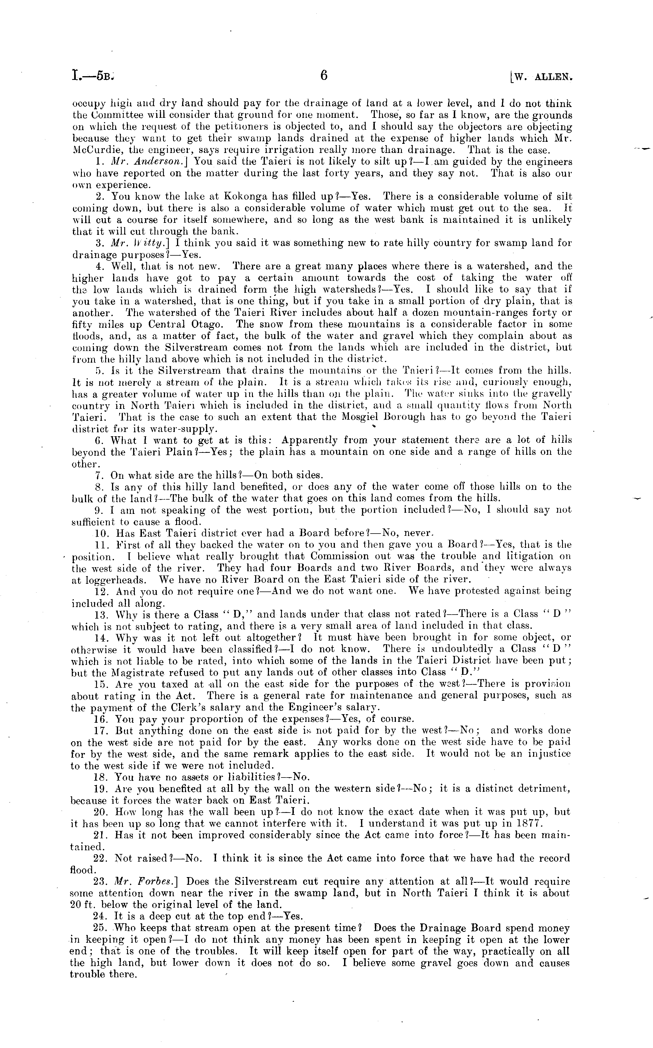 occupy high and dry land should pay for the drainage of land at a lower level, and I do not think the Committee will consider that ground for one moment. Those, so far as I know, are the grounds on which the request of the petitioners is objected to, and 1 should say the objectors are objecting I >ecause they want to get their swamp lands drained at the expense of higher lands which Mr. McCurdie, the engineer, says require irrigation really more than drainage. That is the case. 1. Mr. Anderson. J You said the Taieri is not likely to silt up?—l am guided by the engineers wiio have reported on the matter during the last forty years, and they say not. That is also our own experience. 2. You know the lake at Kokonga has filled up? —Yes. There is a considerable volume of silt coming down, but there is also a considerable volume of water which must get out to the sea. If will cut a course for itself somewhere, and so long as the west bank is maintained it is unlikely that it will cut through the bank. 3. Mr. b itty..] I think you said it was something new to rate hilly country for swamp land for drainage purposes?— Yes. 4. Well, that is not new. There are a great many places where there is a watershed, and the higher lands have got to pay a certain amount towards the cost of taking the water off the low lands which is drained form the high watersheds? —Yes. I should like to say that if you take in a watershed, that is one thing, but if you take in a small portion of dry plain, that is another. The watershed of the Taieri River includes about half a dozen mountain-ranges forty or fifty miles up Central Otago. The snow from these mountains is a considerable factor in some Hoods, and, as a matter of fact, the bulk of the water and gravel which they complain about as coming down the Silverstream comes not from the lands which are included in the district, but from the hilly land above which is not included in the district. 5. Is it the Silverstream that drains the mountains or the Taieri I —lt comes from the hills. It is not merely a stream of the plain. It is a stream which takes its rise and, curiously enough, has a greater volume of water up in the hills than on tin- plain. The water sinks into the gravelly country in North Taieri which is included in the district, and a small quantity Hows from North Taieri. That is the case to such an extent that the Mosgiel Borough has to go beyond the Taieri district for its water-supply. 6. What 1 want to get at is this: Apparently from your statement there are a lot of hills beyond the Taieri Plain? —Yes; the plain has a mountain on one side and a range of hills on the other. 7. On what side are the hills?—On both sides. 8. Is any of this hilly land benefited, or does any of the water come off those hills on to the bulk of the land? —The bulk of the water that goes on this land comes from the hills. 9. I am not speaking of the west portion, but the portion included? —No, I should say not sufficient to cause a flood. 10. Has East Taieri district ever had a Board before?—No, never. 11. First of all they backed the water on to you and then gave you a Board?— Yes, that is the position. I believe what really brought that Commission out was the trouble and litigation on the west side of the river. They had four Boards and two River Boards, and they were always at loggerheads. We have no River Board on the East Taieri side of the river. 12. And you do not require one? —And we do not want one. We have protested against beingincluded all along. 13. Why is there a Class " D," and lands under that class not rated?— There is a Class "D " which is not subject to rating, and there is a very small area of land included in that class. 14. Why was it not left out altogether? It must have been brought in for some object, or otherwise it would have been classified? —1 do not know. There is undoubtedly a Class "D" which is not liable to be rated, into which some of the lands in the Taieri District have been put ; but the Magistrate refused to put any lands out of other classes into Class " D." 15. Are you taxed at nil on the east side for the purposes of the west?— There is provision about rating in the Act. There is a general rate for maintenance and genera] purposes, such as the payment of the Clerk's salary and the Engineer's salary. 16. You pay your proportion of the expenses? —Yes, of course. 17. But anything done on the east side is not paid for by the west ?—No; and works done on the west side are not paid for by the east. Any works done on the west side have to be paid for by the west side, and the same remark applies to the east side. It would not be an injustice to the west side if we were not included. 18. You have no assets or liabilities? —No. 19. Are you benefited at all by the wall on the western side? —No; it is a distinct detriment, because it forces the water back on East Taieri. 20. HOW long has the wall been up?—l do not know the exact date when it was put up, but it has been up so long that we cannot interfere with it. I understand it was put up in 1877. 21. Has it not been improved considerably- since the Act came into force? —It has been maintained. 22. Not raised?— No. I think it is since the Act came into force that we have had the record flood. 23. Mr. Forbes.] Does the Silverstream cut require any attention at all? —It would require some attention down near the river in the swamp land, but in North Taieri I think it is about 20 ft. below the original level of the land. 24. It is a deep cut at the top end?— Yes. 25. Who keeps that stream open at the present time? Does the Drainage Board spend money in keeping it open?—l do not think any money has been spent in keeping it open at the lower end; that is one of the troubles. It will keep itself open for part of the way, practically on all the high land, but lower down it does not do so. I believe some gravel goes down and causes trouble there.