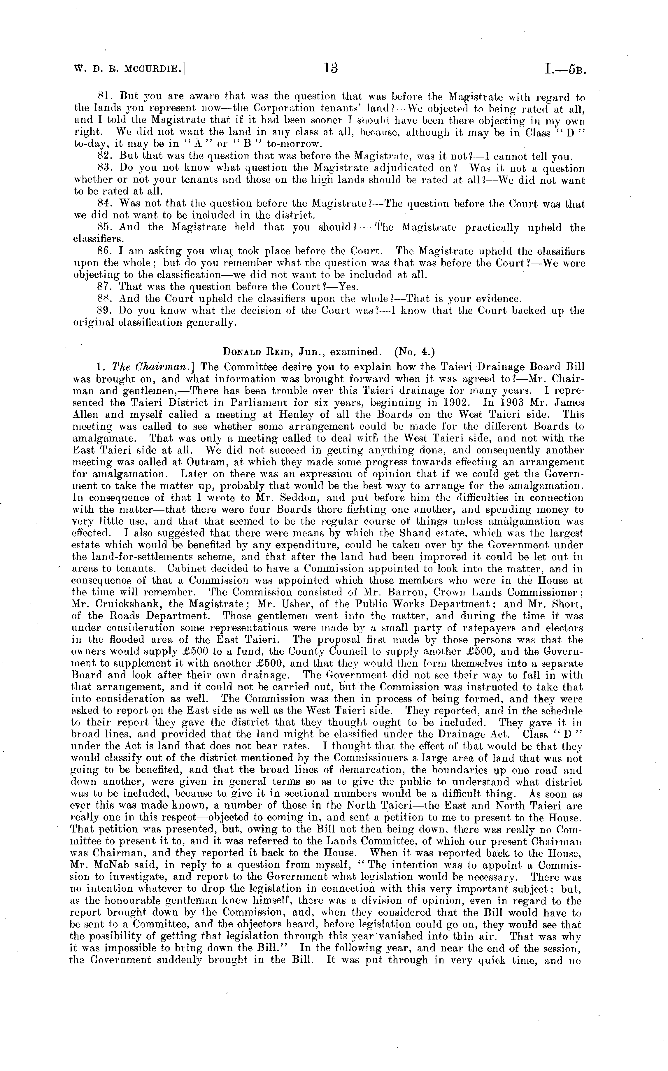 81. But you are aware that was the question that was before the Magistrate with regard to the lands you represent now-the Corporation tenants' land? —We objected to being rated at all, and I told the Magistrate that if it had been sooner 1 should have been there objecting in my own right. We did not want the land in any class at all, because, although it may be in Class "D " to-day, it may be in " A " or " B " to-morrow. 82. But that was the question that was before the Magistrate, was it not?—l cannot tell you. 83. Do you not know what question the Magistrate adjudicated on? Was it not a question whether or not your tenants and those on the high lands should be rated at till?—We did not want to be rated at ail. 84. Was not that the question before the Magistrate?— The question before the Court was that we did not want to be included in the district. 85. And the Magistrate held that you should? — The Magistrate practically upheld the classifiers. 86. lam asking you what took place before the Court. The Magistrate upheld the classifiers upon the whole; but do you remember what the question was that was before the Court?—We were objecting to the classification—we did not want to be included at all. 87. That was the question before the Court? —Yes. 88. And the Court upheld the classifiers upon the whole? —That is your evidence. 89. Do you know what the decision of the Court was?—l know that the Court backed up the original classification generally. . Donald Reid, Jun., examined. (No. 4.) 1. The Chairman.] The Committee desire you to explain how the Taieri Drainage Board Bill was brought on, and what information was brought forward when it was agreed to?— Mr. Chairman and gentlemen,—There has been trouble over this Taieri drainage for many years. I represented the Taieri District in Parliament for six years, beginning in 1902. In 1903 Mr. James Allen and nryself called a meeting at Henley of all the Boards on the West Taieri side. This meeting was called to see whether some arrangement could be made for the different Boards to amalgamate. That was only a meeting called to deal with the West Taieri side, and not with the East Taieri side at all. We did not succeed in getting anything done, and consequently another meeting was called at Outram, at which they made some progress towards effecting an arrangement for amalgamation. Later on there was an expression of opinion that if we could get the Government to take the matter up, probably that would be the best way to arrange for the amalgamation. In consequence of that I wrote to Mr. Seddon, and put before him the difficulties in connection with the matter —that there were four Boards there fighting one another, and spending money to very little use, and that that seemed to be the regular course of things unless amalgamation was effected. I also suggested that there were means by which the Shand estate, which was the largest estate which would be benefited by any expenditure, could be taken over by the Government under the land-for-settlements scheme, and that after the land had been improved it could be let out in areas to tenants. Cabinet decided to have a Commission appointed to look into the matter, and in consequence of that a Commission was appointed which those members who were in the House at the time will remember. The Commission consisted of Mr. Barron, Crown Lands Commissioner; Mr. Cruickshank, the Magistrate; Mr. Usher, of the Public Works Department; and Mr. Short, of the Roads Department. Those gentlemen went into the matter, and during the time it was tinder consideration some representations were made by a small party of ratepayers and electors in the flooded area of the East Taieri. The proposal first made by those persons was that the owners would supply £500 to a fund, the County Council to supply another £500, and the Government to supplement it with another £500, and that they would then form themselves into a separate Board and look after their own drainage. The Government did not see their way to fall in with that arrangement, and it could not be carried out, but the Commission was instructed to take that into consideration as well. The Commission was then in process of being formed, and they were asked to report on the East side as well as the West Taieri side. They reported, and in the schedule to their report they gave the district that they thought ought to be included. They gave it in broad lines, and provided that the land might be classified under the Drainage Act. Class "D " tinder the Act is land that does not bear rates. I thought that the effect of that would be that they would classify out of the district mentioned by the Commissioners a large area of land that was not going to be benefited, and that the broad lines of demarcation, the boundaries up one road and down another, were given in general terms so as to give the public to understand what district was to be included, because to give it in sectional numbers would be a difficult thing. As soon as ever this was made known, a number of those in the North Taieri—the East and North Taieri are really one in this respect —objected to coming in, and sent a petition to me to present to the House. That petition was presented, but, owing to the Bill not then being down, there was really no Committee to present it to, and it was referred to the Lands Committee, of which our present Chairman was Chairman, and they reported it back to the House. When it was reported back, to the House, Mr. McNab said, in reply to a question from myself, " The intention was to appoint a Commission to investigate, and report to the Government what legislation would be necessary. There was no intention whatever to drop the legislation in connection with this very important subject; but, as the honourable gentleman knew himself, there was a division of opinion, even in regard to the report brought down by the Commission, and, when they considered that the
