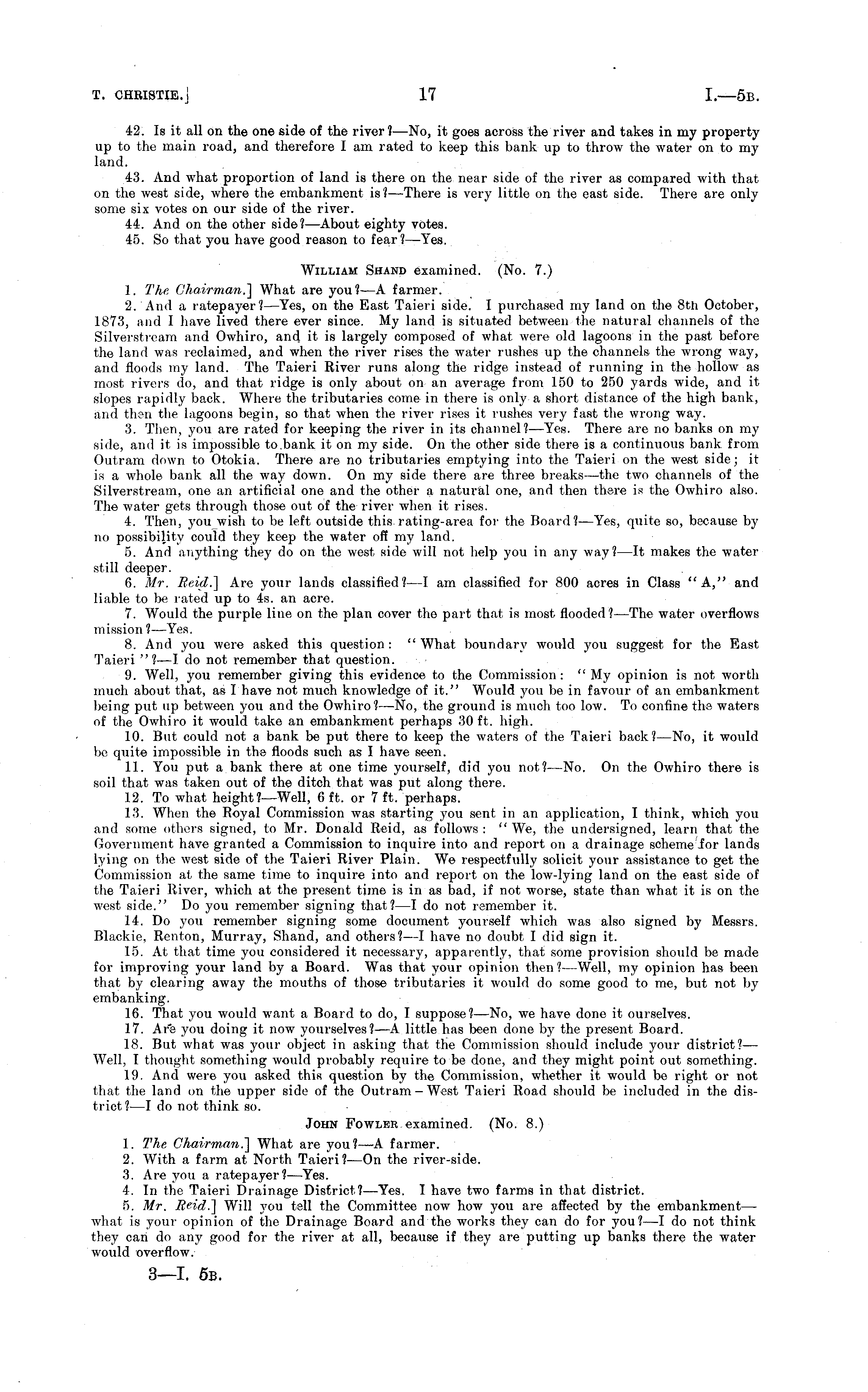 42. Is it all on the one side of the river? —No, it goes across the river and takes in my property up to the main road, and therefore I am rated to keep this bank up to throw the water on to my land. 43. And what proportion of land is there on the near side of the river as compared with that on the west side, where the embankment is?— There is very little on the east side. There are only some six votes on our side of the river. 44. And on the other side? —About eighty votes. 45. So that you have good reason to fear? —Yes. William Shand examined. (No. 7.) 1. The Chairman.] What are you? —A farmer. 2. And a ratepayer?— Yes, on the East Taieri side. I purchased my land on the Btli October, 1873, and I have lived there ever since. My land is situated between the natural channels of the Silverstream and Owhiro, and it is largely composed of what, were old lagoons in the past before the land was reclaimed, and when the river rises the water rushes up the channels the wrong way, and floods my land. The Taieri River runs along the ridge instead of running in the hollow as most rivers do, and that ridge is only about on an average from 150 to 250 yards wide, and it slopes rapidly back. Where the tributaries come in there is only a short distance of the high bank, and then the lagoons begin, so that when the river rises it rushes very fast the wrong way. 3. Then, you are rated for keeping the river in its channel? —Yes. There are no banks on my side, and it is impossible to .bank it on my side. On the other side there is a continuous bank from Outram down to Otokia. There are no tributaries emptying into the Taieri on the west side; it is a whole bank all the way down. On my side there are three breaks—the two channels of the Silverstream, one an artificial one and the other a natural one, and then there is the Owhiro also. The water gets through those out of the river when it rises. 4. Then, you wish to be left outside this rating-area for the Board?— Yes, quite so, because by no possibility could they keep the water off my land. 5. And anything they do on the west side will not help you in any way? —It makes the water still deeper. 6. Mr. Reid.] Are your lands classified? —I am classified for 800 acres in Class "A," and liable to be rated up to 4s. an acre. 7. Would the purple line on the plan cover the part that is most flooded? —The water overflows mission ?—Yes. 8. And you were asked this question: "What boundary would you suggest for the East Taieri "?—I do not remember that question. 9. Well, you remember giving this evidence to the Commission : " My opinion is not worth much about that, as I have not much knowledge of it." Would you be in favour of an embankment lieing put up between you and the Owhiro?—No, the ground is much too low. To confine the waters of the Owhiro it would take an embankment perhaps 30 ft. high. 10. But could not a bank be put there to keep the waters of the Taieri back? —No, it would be quite impossible in the floods such as I have seen. 11. You put a bank there at one time yourself, did you not? —No. On the Owhiro there is soil that was taken out of the ditch that was put along there. 12. To what height ?—Well, 6 ft. or 7 ft. perhaps. 13. When the Royal Commission was starting you sent in an application, I think, which you and some others signed, to Mr. Donald Reid, as follows : " We, the undersigned, learn that the Government have granted a Commission to inquire into and report on a drainage scheme for lands lying on the west side of the Taieri River Plain. We respectfully solicit your assistance to get the Commission at the same time to inquire into and report on the low-lying land on the east side of the Taieri River, which at the present time is in as bad, if not worse, state than what it is on the west side." Do you remember signing that?—l do not remember it. 14. Do you remember signing some document yourself which was also signed by Messrs. Blackie, Renton, Murray, Shand, and others?—l have no doubt I did sign it. 15. At that time you considered it necessary, apparently, that some provision should be made for improving your land by a Board. Was that your opinion then?— Well, my opinion has been that by clearing away the mouths of those tributaries it would do some good to me, but not by embanking. 16. That you would want a Board to do, I suppose?—No, we have done it ourselves. 17. Are you doing it now yourselves?—A little has been done by the present Board. 18. But what was your object in asking that the Commission should include your district?— Well, I thought something would probably require to be done, and they might point out something. 19. And were you asked this question by the Commission, whether it would be right or not that the land on the upper side of the Outram - West Taieri Road should be included in the district? —I do not think so. John Fowler examined. (No. 8.) 1. The Chairman.] What are you?—A farmer. 2. With a farm at North Taieri?—On the river-side. 3. Are you a ratepayer?— Yes. 4. In the Taieri Drainage District?— Yes. I have two farms in that district. 5. Mr. Reid.] Will you tell the Committee now how you are affected by the embankment— what is your opinion of the Drainage Board and the works they can do for you?—l do not think they can do any good for the river at all, because if they are putting up banks there the water would overflow.