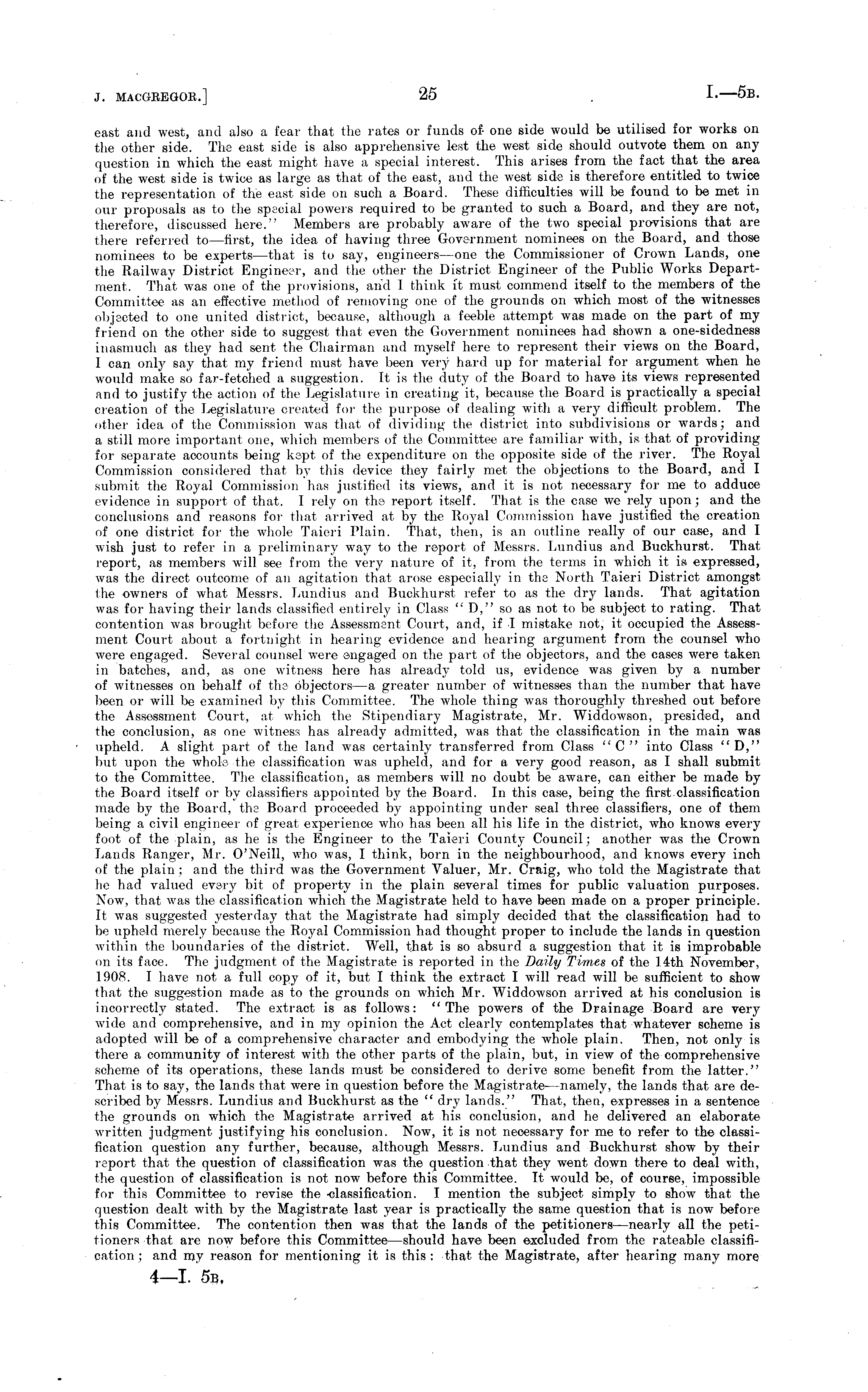 east and west, and also a fear that the rates or funds of one side would be utilised for works on the other side. The east side is also apprehensive lest the west side should outvote them on any question in which the east might have a special interest. This arises from the fact that the area of the west side is twice as large as that of the east, and the west side is therefore entitled to twice the representation of the east side on such a Board. These difficulties will be found to be met in our proposals as to the special powers required to be granted to such a Board, and they are not, therefore, discussed here." Members are probably aware of the two special provisions that are there referred to —first, the idea of having three Government nominees on the Board, and those nominees to be experts —that is to say, engineers—one the Commissioner of Crown Lands, one the Railway District Engineer, and the other the District Engineer of the Public Works Department. That was one of the provisions, and I think ft must commend itself to the members of the Committee as an effective method of removing one of the grounds on which most of the witnesses objected to one united district, because, although a feeble attempt was made on the part of my friend on the other side to suggest that even the Government nominees had shown a one-sidedness inasmuch as they had sent the Chairman and myself here to represent their views on the Board, I can only say that my friend must have been very hard up for material for argument when he would make so far-fetched a suggestion. It is the duty of the Board to have its views represented and to justify the action of the Legislature in creating it, because the Board is practically a special creation of the Legislature created for the purpose of dealing with a very difficult problem. The other idea of the Commission was that of dividing the district into subdivisions or wards; and a still more important one, which members of the Committee are familiar with, is that, of providing for separate accounts being kept of the expenditure on the opposite side of the river. The Royal Commission considered that by this device they fairly met the objections to the Board, and I submit the Royal Commission has justified its views, and it is not necessary for me to adduce evidence in support of that. I rely on the report itself. That is the case we rely upon; and the conclusions and reasons for that arrived at by the Royal Commission have justified the creation of one district for the whole Taieri Plain. That, then, is an outline really of our case, and I wish just to refer in a preliminary way to the report of Messrs. Lundius and Buckhurst. That report, as members will see from the very nature of it, from the terms in which it is expressed, was the direct outcome of an agitation that arose especially in the North Taieri District amongst the owners of what Messrs. Lundius and Buckhurst refer to as the dry lands. That agitation was for having their lands classified entirely in Class " D," so as not to be subject to rating. That contention was brought before the Assessment Court, and, if I mistake not, it occupied the Assessment Court about a fortnight in hearing evidence and hearing argument from the counsel who were engaged. Several counsel were engaged on the part of the objectors, and the cases were taken in batches, and, as one witness here has already told us, evidence was given by a number of witnesses on behalf of the objectors—a greater number of witnesses than the number that have been or will be examined by this Committee. The whole thing was thoroughly threshed out before the Assessment Court, at which the Stipendiary Magistrate, Mr. Widdowson, presided, and the conclusion, as one witness has already admitted, was that the classification in the main was upheld. A slight part of the land was certainly transferred from Class "C" into Class " D," but upon the whole the classification was upheld, and for a very good reason, as I shall submit to the Committee. The classification, as members will no doubt be aware, can either be made by the Board itself or by classifiers appointed by the Board. In this case, being the first classification made by the Board, the Board proceeded by appointing under seal three classifiers, one of them being a civil engineer of great experience who has been all his life in the district, who knows every foot of the plain, as he is the Engineer to the Taieri County Council; another was the Crown Lands Ranger, Mr. O'Neill, who was, I think, born in the neighbourhood, and knows every inch of the plain; and the third was the Government Valuer, Mr. Craig, who told the Magistrate that he had valued every bit of property in the plain several times for public valuation purposes. Now, that was the classification which the Magistrate held to have been made on a proper principle. It was suggested yesterday that the Magistrate had simply decided that the classification had to be upheld merely because the Royal Commission had thought proper to include the lands in question within the boundaries of the district. Well, that is so absurd a suggestion that it is improbable on its face. The judgment of the Magistrate is reported in the Daily Times of the 14th November, 1908. I have not a full copy of it, but I think the extract I will read will be sufficient to show that the suggestion made as to the grounds on which Mr. Widdowson arrived at his conclusion is incorrectly stated. The extract is as follows: "The powers of the Drainage Board are very wide and comprehensive, and in my opinion the Act clearly contemplates that whatever scheme is adopted will be of a comprehensive character and embodying the whole plain. Then, not only is there a community of interest with the other parts of the plain, but, in view of the comprehensive scheme of its operations, these lands must be considered to derive some benefit from the latter." That is to say, the lands that were in 