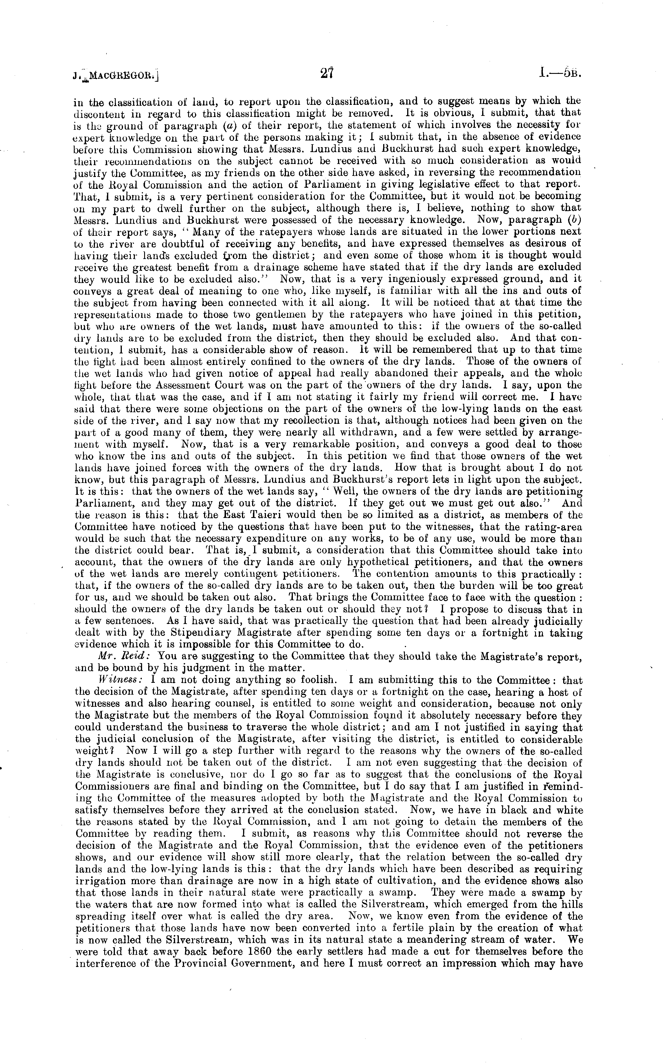 in the classification of laud, to report upon the classification, and to suggest means by which the discontent in regard to this classification might be removed. It is obvious, I submit, that that is the ground of paragraph (a) of their report, the statement of which involves the necessity for expert knowledge on the. part of the persons making it; i submit that, in the absence of evidence before this Commission showing that Messrs. Lundius and Buckhurst had such expert knowledge, their recommendations on the subject cannot be received with so much consideration as would justify the Committee, as my friends on the other side have asked, in reversing the recommendation of the Royal Commission and the action of Parliament in giving legislative effect to that report. That, I submit, is a very pertinent consideration for the Committee, but it would not be becoming on my part to dwell further on the subject, although there is, 1 believe, nothing to show that Messrs. Lundius and Buckhurst were possessed of the necessary knowledge. Now, paragraph (b) of their report says, '' Many of the ratepayers whose lands are situated in the lower portions next to the river are doubtful of receiving any benefits, and have expressed themselves as desirous of having their lands excluded fcrom the district; and even some of those whom it is thought would receive the greatest benefit from a drainage scheme have stated that if the dry lands are excluded they would like to be excluded also." Now, that is a very ingeniously expressed ground, and it conveys a great deal of meaning to one who, like myself, is familiar with all the ins and outs of the subject from having been connected with it all along. It will be noticed that at that time the representations made to those two gentlemen by the ratepayers who have joined in this petition, but who are owners of the wet lands, must have amounted to this: if the owners of the so-called dry lands are to be excluded from the district, then they should be excluded also. And that contention, 1 submit, has a considerable show of reason. It will be remembered that up to that time the fight had been almost entirely confined to the owners of the dry lands. Those of the owners of tire wet lands who had given notice of appeal had really abandoned their appeals, and the whole light before the Assessment Court was on the part of the owners of the dry lauds. 1 say, upon the whole, that that was the case, and if lam not stating it fairly my friend will correct me. I have said that there were some objections on the part of the owners of the low-lying lands on the east side of the river, and 1 say now that my recollection is that, although notices had been given on the part of a good many of them, they were nearly all withdrawn, and a few were settled by arrangement with myself. Now, that is a very remarkable position, and conveys a good deal to those who know the ins and outs of the subject. In this petition we find that those owners of the wet lands have joined forces with the owners of the dry lands. How that is brought about I do not know, but this paragraph of Messrs. Lundius and Buckhurst's report lets in light upon the subject. It is this: that the owners of the wet lands say, " Well, the owners of the dry lands are petitioning Parliament, and they may get out of the district. If they get out we must get out also." And the reason is this: that the East Taieri would then be so limited as a district, as members of the Committee have noticed by the questions that have been put to the witnesses, that the rating-area would be such that the necessary expenditure on any works, to be of any use, would be more than the district could bear. That is, 1 submit, a consideration that this Committee should take into account, that the owners of the dry lands are only hypothetical petitioners, and that the owners of the wet lands are merely contingent petitioners. The contention amounts to this practically : that, if the owners of the so-called dry lands are to be taken out, then the burden will be too great for us, and we should be taken out also. That brings the Committee face to face with the question : should the owners of the dry lands be taken out or should they not ? I propose to discuss that in a few sentences. As I have said, that was practically the question that had been already judicially dealt with by the Stipendiary Magistrate after spending some ten days or a fortnight in taking evidence which it is impossible for this Committee to do. Mr. Beid: You are suggesting to the Committee that they should take the Magistrate's report, and be bound by his judgment in the matter. Witness: I am not doing anything so foolish. I am submitting this to the Committee: that the decision of the Magistrate, after spending ten days or a fortnight on the case, hearing a host of witnesses and also hearing counsel, is entitled to some weight and consideration, because not only the Magistrate but the members of the Royal Commission found it absolutely necessary before they could understand the business to traverse the whole district; and am I not justified in saying that the judicial conclusion of the Magistrate, after visiting the district, is entitled to considerable weight? Now I will go a step further with regard to the reasons why the owners of the so-called dry lands should not be taken out of the district. lam not even suggesting that the decision of the Magistrate is conclusive, nor do I go so far as to suggest that the conclusions of the Royal Commissioners are final and binding on the Committee, but I do say that I am justified in Reminding the Committee of the measures adopted by both the Magistrate and the Royal Commission to satisfy themselves before they arrived at the conclusion stated. Now, we have in black and white the reasons stated by the Royal Commission, and 1 am not going to detain the members of the Committee by reading them. I submit, as reasons why this Committee should not reve