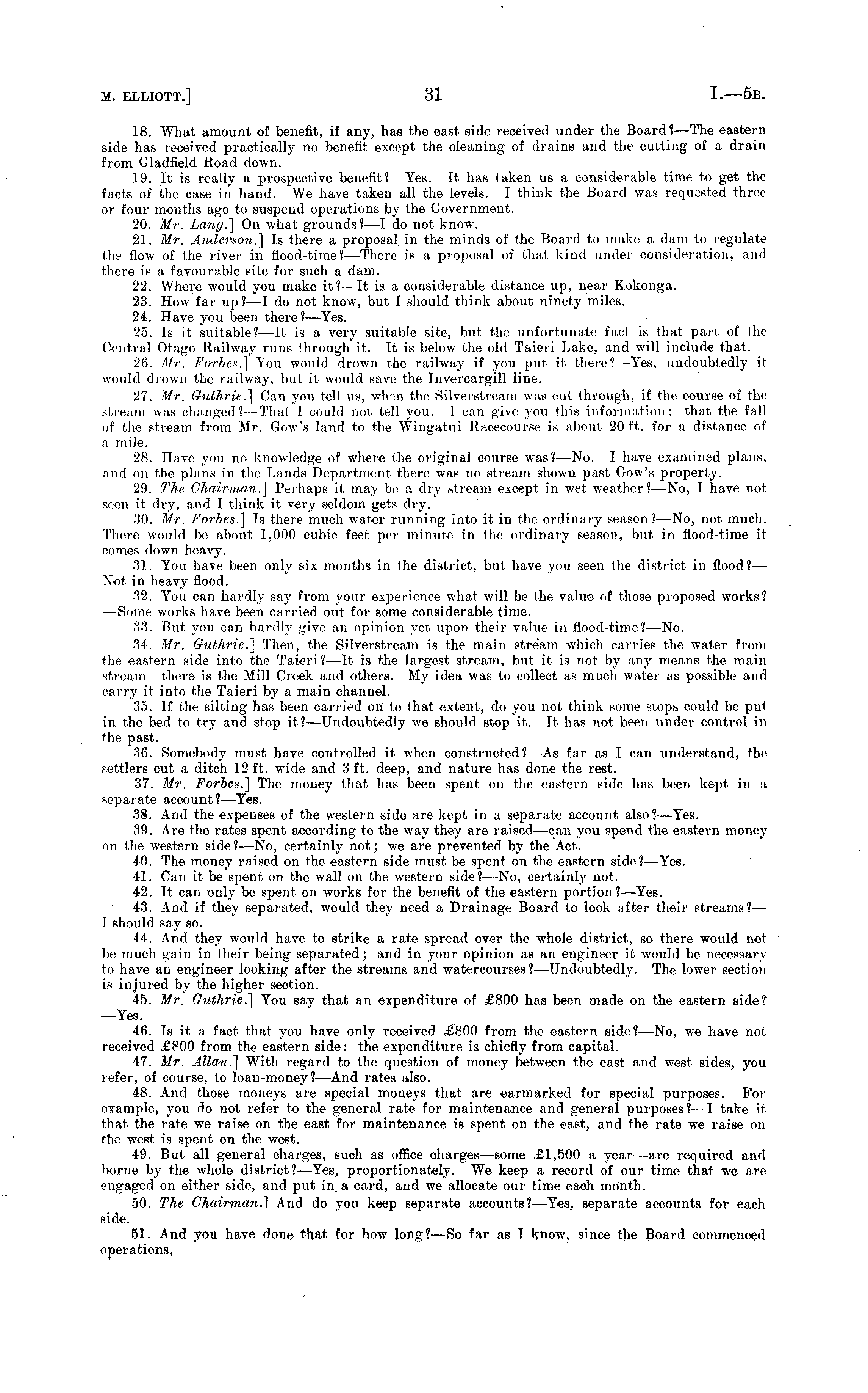 18. What amount of benefit, if any, has the east side received under the Board? —The eastern side has received practically no benefit except the cleaning of drains and the cutting of a drain from Gladfield Road down. 19. It is really a prospective benefit? —Yes. It has taken us a considerable time to get the facts of the case in hand. We have taken all the levels. I think the Board was requested three or four months ago to suspend operations by the Government. 20. Mr. On what grounds? —I do not know. 21. Mr. Anderson.] Is there a proposal in the minds of the Board to make a dam to regulate the flow of the river in flood-time? —There is a proposal of that kind under consideration, and there is a favourable site for such a dam. 22. Where would you make it? —It is a considerable distance up, near Kokonga. 23. How far up?—l do not know, but I should think about ninety miles. 24. Have you been there? —Yes. 25. Is it suitable?—lt is a very suitable site, but the unfortunate fact is that part of the Central Otago Railway runs through it. It is below the old Taieri Lake, and will include that. 26. Mr. Forbes.] You would drown the railway if you put it there?--Yes, undoubtedly it would drown the railway, but it would save the Invercargill line. 27. Mr. Guthrie.] Can you tell us, when the Silverstream was cut through, if the course of the stream was changed?— That I could not tell you. 1 can give you this information: that the fall of the stream from Mr. Gow's land to the Wingatui Racecourse is about 20 ft, for a distance of a mile. 28. Have you no knowledge of where the original course was?— No. I have examined plans, and on the plans in the Lands Department there was no stream shown past Gow's property. 29. The Chairman.] Perhaps it may be a dry stream except in wet weather?—No, I have not seen it dry, and I think it very seldom gets dry. 30. Mr. Forbes.] Is there much water running into it in the ordinary season? —No, not much. There would be about 1,000 cubic feet per minute in the ordinary season, but in flood-time it comes down heavy. 31. You have been only six months in the district, but have you seen the district in flood?— Not in heavy flood. 32. You can hardly say from your experience what will be the value of those proposed works? —Some works have been carried out for some considerable time. 33. But you can hardly give an opinion yet upon their value in flood-time?— No. 34. Mr. Guthrie.] Then, the Silverstream is the main stream which carries the water from the eastern side into the Taieri?—lt is the largest stream, but it is not by any means the main stream —there is the Mill Creek and others. My idea was to collect as much water as possible and carry it into the Taieri by a main channel. 35. If the silting has been carried on to that extent, do you not think some stops could be put in the bed to try and stop it? —Undoubtedly we should stop it. It has not been under control in the past. 36. Somebody must have controlled it when constructed?—As far as I can understand, the settlers cut a ditch 12 ft. wide and 3 ft. deep, and nature has done the rest. 37. Mr. Forbes.] The money that has been spent on the eastern side has been kept in a separate account? —Yes. 38. And the expenses of the western side are kept in a separate account also? —Yes. 39. Are the rates spent according to the way they are raised—can you spend the eastern money on the western side?—No, certainly not; we are prevented by the Act, 40. The money raised on the eastern side must be spent on the eastern side?— Yes. 41. Can it be spent on the wall on the western side?—No, certainly not. 42. It can only be spent on works for the benefit of the eastern portion? —Yes. 43. And if they separated, would they need a Drainage Board to look after their streams? — I should say so. 44. And they would have to strike a rate spread over the whole district, so there would not be much gain in their being separated; and in your opinion as an engineer it would be necessary to have an engineer looking after the streams and watercourses? —Undoubtedly. The lower section is injured by the higher section. 45. Mr. Guthrie.] You say that an expenditure of £800 has been made on the eastern side? —Yes. 46. Is it a fact that you have only received £800 from the eastern side? —No, we have not received £800 from the eastern side: the expenditure is chiefly from capital. 47. Mr. Allan.] With regard to the question of money between the east and west sides, you refer, of course, to loan-money?— And rates also. 48. And those moneys are special moneys that are earmarked for special purposes. For example, you do not refer to the general rate for maintenance and general purposes?—l take it that the rate we raise on the east for maintenance is spent on the east, and the rate we raise on the west is spent on the west. 49. But all general charges, such as office charges—some £1,500 a year—are required and borne by the whole district? —Yes, proportionately. We keep a record of our time that we are engaged on either side, and put in a card, and we allocate our time each month. 50. The Chairman.] And do you keep separate accounts?— Yes, separate accounts for each side. 51. And you have done that for how long?—So far as I know, since the Board commenced operations.