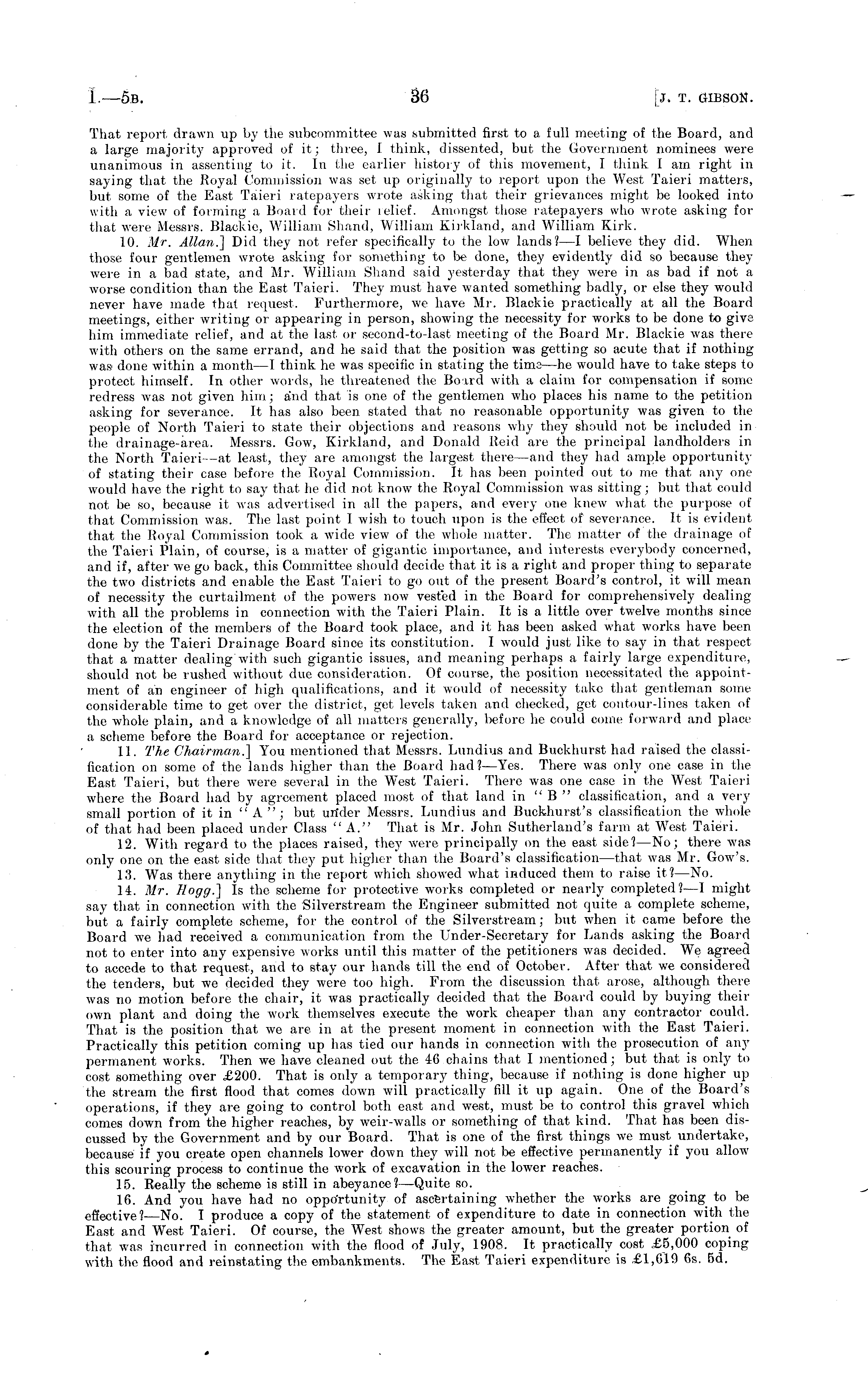 That report drawn up by the subcommittee was submitted first to a full meeting of the Board, and a large majority approved of it; three, I think, dissented, but the Government nominees were unanimous in assenting to it. In Hie earlier history of this movement, I think I am right in saying that the Royal Commission was sel up originally to report upon the West Taieri matters, but some of the East Taieri ratepayers wrote asking that their grievances might be looked into with a view of forming a Board for their relief. Amongst those ratepayers who wrote asking for that were Messrs. Blackie, William Shand, William Kirkland, and William Kirk. 10. Mr. Allan.] Did they not refer specifically to the low lands? —I believe they did. When those four gentlemen wrote asking for something to Ire done, they evidently did so because they were in a bad state, and Mr. William Shand said yesterday that they were in as bad if not a worse condition than the East Taieri. They must have wanted something badly, or else they would never have made that request. Furthermore, we have Mr. Blackie practically at all the Board meetings, either writing or appearing in person, showing the necessity for works to be done to give him immediate relief, and at the last or second-to-last meeting of the Board Mr. Blackie was there with others on the same errand, and he said that the position was getting so acute that if nothing was- done within a month—l think he was specific in stating the time—he would have to take steps to protect himself. In other words,' he threatened the Board with a claim for compensation if some redress was not given him; arid that is one of the gentlemen who places his name to the petition asking for severance. It has also been stated that no reasonable opportunity was given to the people of North Taieri to state their objections and reasons why they should not be included in the drainage-area. Messrs. Gow, Kirkland, and Donald Reid are the principal landholders in the North Taieri—at least, they are amongst the largest there —and they had ample opportunity of stilting their case before the Royal Commission. It has been pointed out to me that any one would have the right to say that he did not, know the Royal Commission was sitting; but that could not be so, because it was advertised in all the papers, and every one knew what the purpose of that Commission was. The last point I wish to touch upon is the effect of severance. It is evident that the Royal Commission took a wide view of the whole matter. The matter of the drainage of the Taieri Plain, of course, is a matter of gigantic importance, and interests everybody concerned, and if, after we go back, this Committee, should decide that it is a right and proper thing to separate the two districts and enable the East Taieri to go out of the present Board's control, it will mean of necessity the curtailment of the powers now vested in the Board for comprehensively dealing with all the problems in connection with the Taieri Plain. It is a little over twelve months since the election of the members of the Board took place, and it has been asked what works have been done by the Taieri Drainage Board since its constitution. I would just like to say in that respect that a matter dealing with such gigantic issues, and meaning perhaps a fairly large expenditure, should not be rushed without due consideration. Of course, the position necessitated the appointment of an engineer of high qualifications, and it would of necessity take that gentleman some considerable time to get over the district, get levels taken and checked, get contour-lines taken of the whole plain, and a knowledge of all matters generally, before he could come forward and place a scheme before the Board for acceptance or rejection. 11. The Chairman.] You mentioned that Messrs. Lundius and Buckhurst had raised the classification on some of the lands higher than the Board had? —Yes. There was only one case in lieEast Taieri, but there were several in the West Taieri. There was one case in the West Taieri where the Board had by agreement placed most of that land in " B " classification, and a very small portion of it in " A "; but urider Messrs. Lundius and Buckhurst's classification the whole of that had been placed under Class "A." That is Mr. John Sutherland's farm at West Taieri. 12. With regard to the places raised, they were principally on the east side?—No; there was only one on the cast side that they put higher than the Board's classification—that was Mr. Gow's. 13. Was there anything in the report which showed what induced them to raise it?— No. 14. Mr. Hogg.] Is the scheme for protective works completed or nearly completed? —I might say that in connection with the Silverstream the Engineer submitted not quite a complete scheme, but a fairly complete scheme, for the control of the Silverstream; but when it came before the Board we had received a communication from the Under-Secretary for Lands asking the Board not to enter into any expensive works until this matter of the petitioners was decided. We agreed to accede to that request, and to stay our hands till the end of October. After that we considered the tenders, but we decided they were too high. From the discussion that arose, although there was no motion before the chair, it was practically decided that the Board could by buying their own plant and doing the work themselves execute the work cheaper than any contractor could. That is the position that we are. in at the present moment in connection with the East Taieri. Practically this petition coming up has tied our hands in connection with the prosecution of any permanent works. Then we have cleaned out the 46 chains that I mentioned; but that is only to cost something over £200. That is only a temporary thing, because if nothing is done higher up the stream the first flood that comes down will practically fill it up again. One of the Board's operations, if 