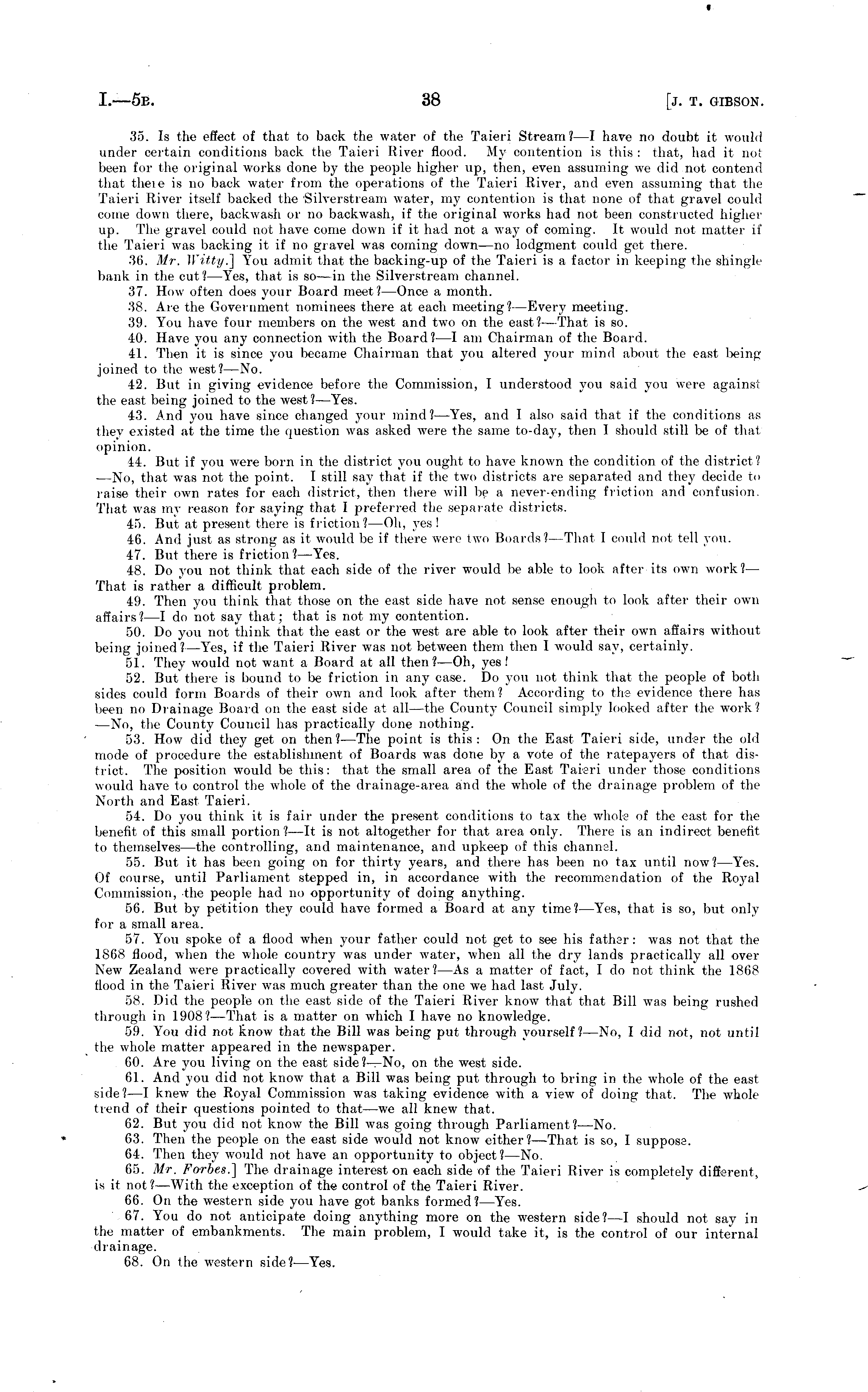35. Is the effect of that to back the water of the Taieri Stream?—l have no doubt it would under certain conditions back the Taieri River flood. My contention is this : that, had it nol been for the original works done by the people higher up, then, even assuming we did not contend that theie is no back water from the operations of the Taieri River, and even assuming that the Taieri River itself backed the Silverstream water, my contention is that none of that gravel could come down there, backwash or no backwash, if the original works had not been constructed higher up. The gravel could not have come down if it had not a way of coming. It would not matter if the Taieri was backing it if no gravel was coming down —no lodgment could get there. 36. Mr. Witty.] You admit that the backing-up of the Taieri is a factor in keeping the shingle bank in the cut? —Yes, that is so —in the Silverstream channel. 37. How often does your Board meet?— Once a month. 38. Are the Government nominees there at each meeting?— Every meeting. 39. You have four members on the west and two on the east? —That is so. 40. Have you any connection with the Board? —I am Chairman of the Board. 41. Then it is since you became Chairman that you altered your mind about the east beingjoined to the west?— No. 42. But in giving evidence before the Commission, I understood you said you were against the east, being joined to the west?— Yes. 43. And you have since changed your mind? —Yes, and I also said that if the conditions as they existed at the time the question was asked were the same to-day, then I should still be of thai opinion. 44. But if you were born in the district you ought to have known the condition of the district? — No, that was not the point. I still say that if the two districts are separated and they decide to raise their own rates for each district, then there will be a never-ending friction and confusion. That was my reason for saying that I preferred the separate districts. 45. But at present there is friction? —Oh, yes! 46. And just as strong as it would be if there were two Boards? —That I could not tell you. 47. But there is friction?— Yes. 48. Do you not think that each side of the river would be able to look after its own work?— That is rather a difficult problem. 4!l. Then you think that those on the east side have not sense enough to look after their own affairs?—l do not say that; that is not my contention. 50. Do you not think that the east or the west are able to look after their own affairs without being joined?— Yes, if the Taieri River was not between them then I would say, certainly. 51. They would not want a Board at all then?—Oh, yes! 52. But there is bound to be friction in any case. Do you not think that the people of both sides could form Boards of their own and look after them? According to the evidence there has been no Drainage Board on the east side tit all—the County Council simply looked after the work? —No, the County Council has practically done nothing. 53. How did they get on then?— The point is this: On the East Taieri side, under the old mode of procedure the establishment of Boards was done by a vote of the ratepayers of that district. The position would be this: that the small area of the East Taieri under those conditions would have to control the whole of the drainage-area and the whole of the drainage problem of the North and East Taieri. 54. Do you think it is fair under the present conditions to tax the whole of the east for the benefit of this small portion ?—lt is not altogether for that area only. There is an indirect benefit to themselves —the controlling, and maintenance, and upkeep of this channel. 55. But it has been going on for thirty, years, and there has been no tax until now? —Yes. Of course, until Parliament stepped in, in accordance with the recommendation of the Royal Commission, the people had no opportunity of doing anything. 56. But by petition they could have formed a Board at any time? —Yes, that is so, but only for a small area, 57. You spoke of a flood when your father could not get to see his father: was not that the 1868 flood, when the whole country was under water, when all the dry lands practically all over New Zealand were practically covered with water?—As a matter of fact, I do not think the 1868 flood in the Taieri River was much greater than the one we had last July. 58. Did the people on the east side of the Taieri River know that that Bill was being rushed through in 1908?— That is a matter on which I have no knowledge. 59. You did not know that the Bill was being put through yourself? —No, I did not, not until the whole matter appeared in the newspaper. 60. Are you living on the east side?—No, on the west side. 61. And you did not know that a Bill was being put through to bring in the whole of the east side? —I knew the Royal Commission was taking evidence with a view of doing that. The whole trend of their questions pointed to that—we all knew that. 62. But you did not know the Bill was going through Parliament? —No. 63. Then the people on the east side would not know either?— That is so, I suppose. 64. Then they would not have an opportunity to object?— No. 65. Mr. Forbes.] The drainage interest on each side of the Taieri River is completely different, is it not?— With the exception of the control of the Taieri River. 66. On the western side you have got banks formed?— Yes. 67. You do not anticipate doing anything more on the western side?—l should not say in the matter of embankments. The main problem, I would take it, is the control of our internal drainage. 68. On the western side?— Yes.