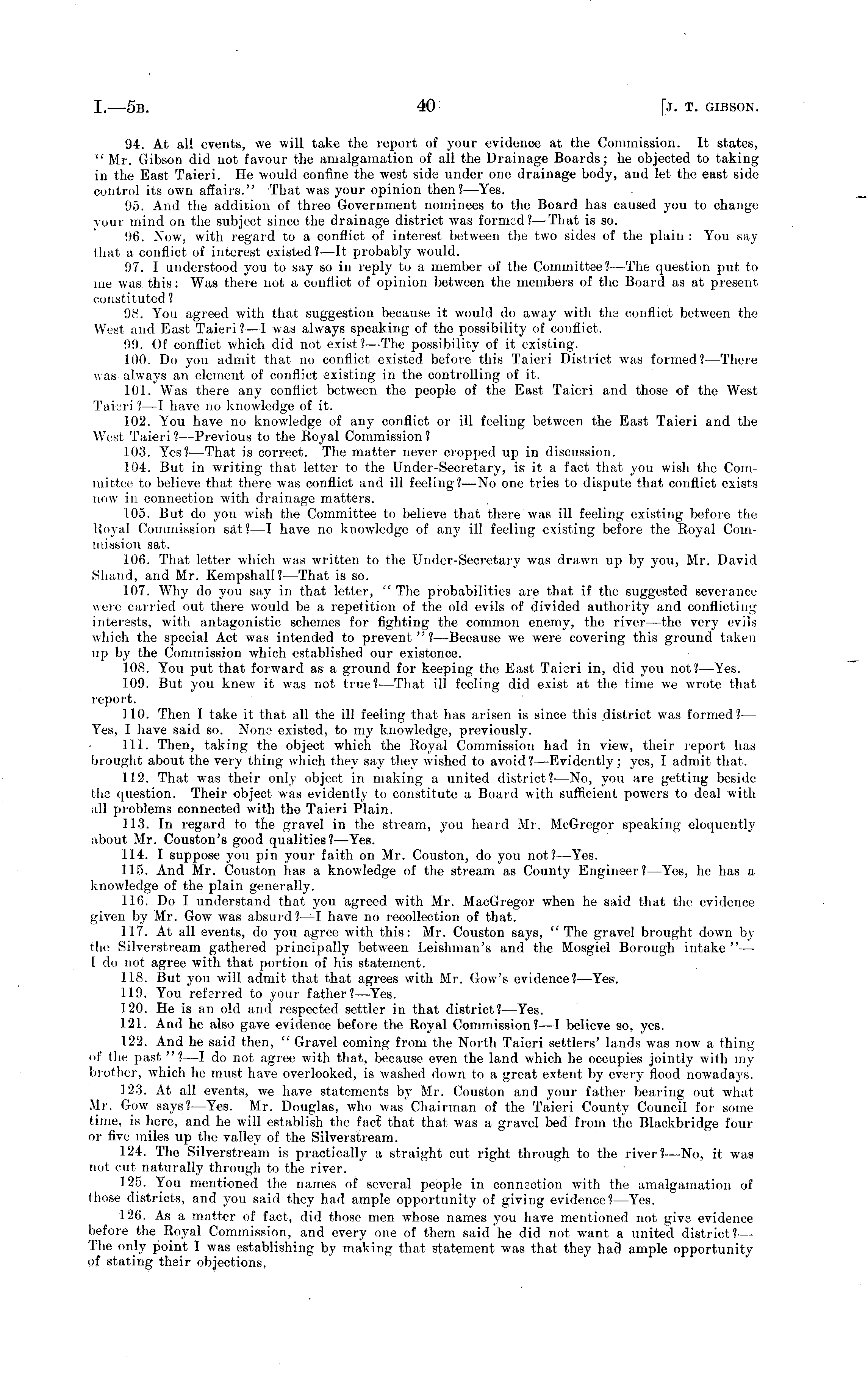 94. At all events, we will take the report of your evidence at the Commission. It states, " Mr. Gibson did not favour the amalgamation of all the Drainage Boards; he objected to taking in the East Taieri. He would confine the west side under one drainage body, and let the east side control its own affairs." That was your opinion then? —Yes. 95. And the addition of three Government nominees to the Board has caused you to change your mind on the subject since the drainage district was formed? —That is so. '.Mi. Now, with regard to a conflict of interest between the two sides of the plain: You say that a conflict of interest existed?—lt probably would. 97. 1 understood you to say so in reply to a member of the Committee?— The question put to me was this: Was there not a conflict of opinion between the members of the Board as at present const itutcd? 98. You agreed with that suggestion because it would do away with the conflict between the West and East Taieri? —I was always speaking of the possibility of conflict. 99. Of conflict which did not exist? —The possibility of it existing. 100. Do you admit that no conflict existed before this Taieri District was formed ?—There was always an element of conflict existing in the controlling of it. 101. Was there any conflict between the people of the East Taieri and those of the West, Taieri? —I have no knowledge of it. 102. You have no knowledge of any conflict or ill feeling between the East Taieri and the Wist Taieri? —Previous to the Royal Commission? 103. Yes?— That is correct. The matter never cropped up in discussion. 104. But in writing that letter to the Under-Secretary, is it a fact that you wish the Committee to believe that there was conflict and ill feeling?—No one tries to dispute that conflict exists now in connection with drainage matters. 105. But do you wish the Committee to believe that there was ill feeling existing before the Royal Commission sat?—l have no knowledge of any ill feeling existing before the Royal Commission sat. 106. That letter which was written to the Under-Secretary was drawn up by you, Mr. David Shand, and Mr. Kempshall?—That is so. 107. Why do you say in that letter, "The probabilities are that if the suggested severance were carried out there would bo a repetition of the old evils of divided authority and conflicting interests, with antagonistic schemes for fighting the common enemy, the river—the very evils which the special Act was intended to prevent"?— Because we were covering this ground taken up by the Commission which established our existence. 108. You put that forward as a ground for keeping the East Taieri in, did you not? —Yes. 109. But you knew it was not true?— That ill feeling did exist at the time we wrote that report. 110. Then I take it that all the ill feeling that has arisen is since this district was formed?— Yes, I have said so. None existed, to my knowledge, previously. 111. Then, taking the object which the Royal Commission had in view, their report has brought about the very thing which they say they wished to avoid?— Evidently; yes, I admit that, 112. That was their only object in making a united district? —No, you are getting beside the question. Their object was evidently to constitute a Board with sufficient powers to deal with all problems connected with the Taieri Plain. 113. In regard to the gravel in the stream, you heard Mr. McGregor speaking eloquently about Mr. Couston's good qualities?— Yes. 114. I suppose you pin your faith on Mr. Couston, do you not?— Yes. 115. And Mr. Couston has a knowledge of the stream as County Engineer?— Yes, he has a knowledge of the plain generally. 116. Do I understand that you agreed with Mr. MacGregor when he said that the evidence given by Mr. Gow was absurd?—l have no recollection of that. ] 17. At all events, do you agree with this: Mr. Couston says, " The gravel brought down by the Silverstream gathered principally between Leishman's and the Mosgiel Borough intake"—■ I do not agree with that portion of his statement. 118. But you will admit that that agrees with Mr. Gow's evidence? —Yes. 119. You referred to your father?— Yes. 120. He is an old and respected settler in that district?— Yes. 121. And he also gave evidence before the Royal Commission?—l believe so, yes. 122. And he said then, " Gravel coming from the North Taieri settlers' lands was now a thing of the past"?—l do not agree with that, because even the land which he occupies jointly with my brother, which he must have overlooked, is washed down to a great extent by every flood nowadays. 123. At all events, we have statements by Mr. Couston and your father bearing out what Mr. Gow says?— Yes. Mr. Douglas, who was Chairman of the Taieri County Council for some time, is here, and he will establish the fad that that was a gravel bed from the Blackbridge four or five miles up the valley of the Silverstream. 124. The Silverstream is practically a straight cut right through to the river?—No, it was not cut naturally through to the river. 125. You mentioned the names of several people in connection with the amalgamation of those districts, and you said they had ample opportunity of giving evidence?— Yes. 126. As a matter of fact, did those men whose names you have mentioned not give evidence before the Royal Commission, and every one of them said he did not want a united district?— 'I he only point I was establishing by making that statement was that they had ample opportunity of stating their objections.