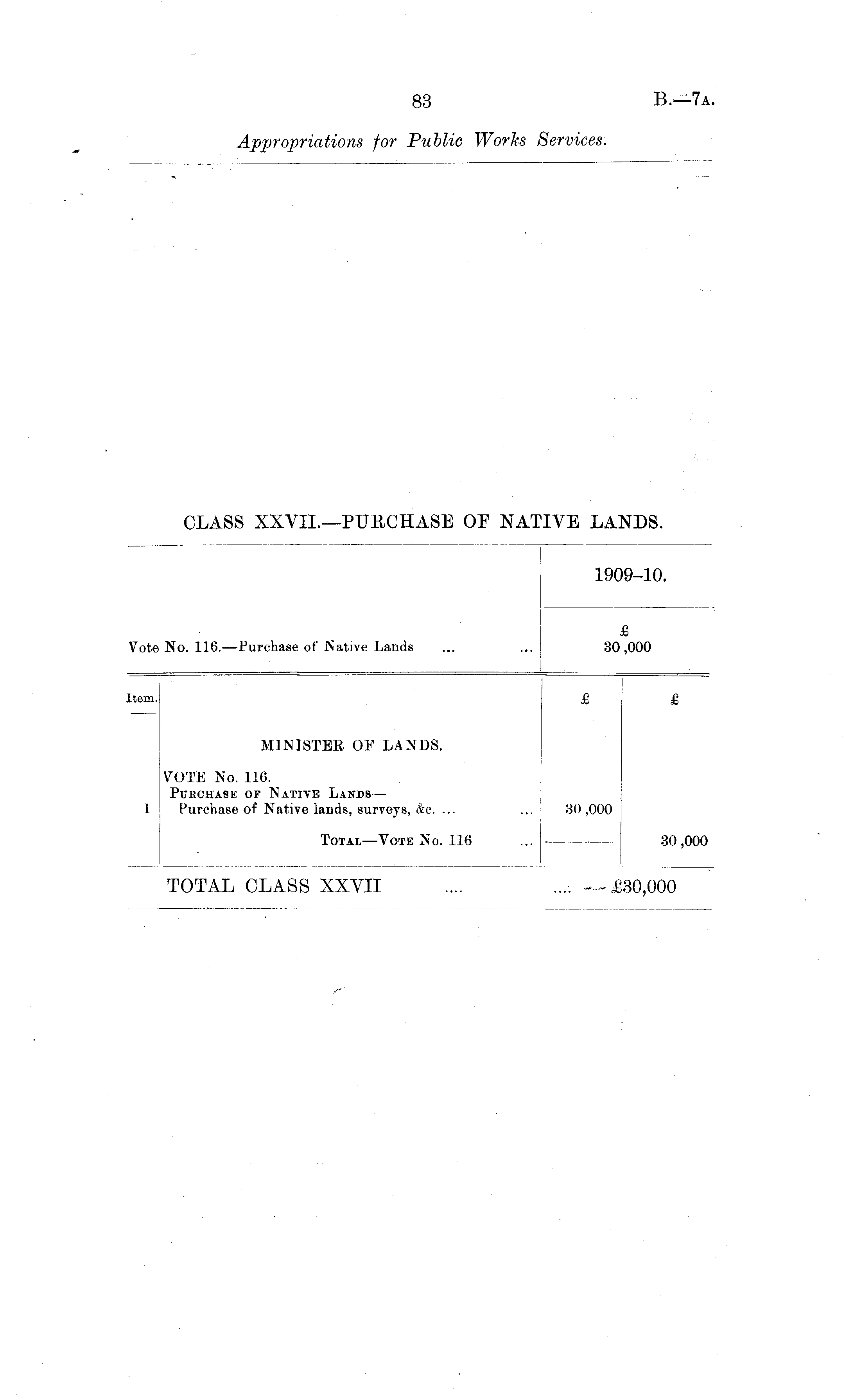 1909-10. Vot. No. 116. —Purchase of Native Lands £ 30 ,000 £ 30 ,000 ttem. £ MINISTER OF LANDS. VOTE No. 116. Purchase of Native Lands— Purchase of Native lands, surveys, &c. ... 30,000 30 ,000 Total—Vote No. 116 TOTAL CLASS XXVII 130,000