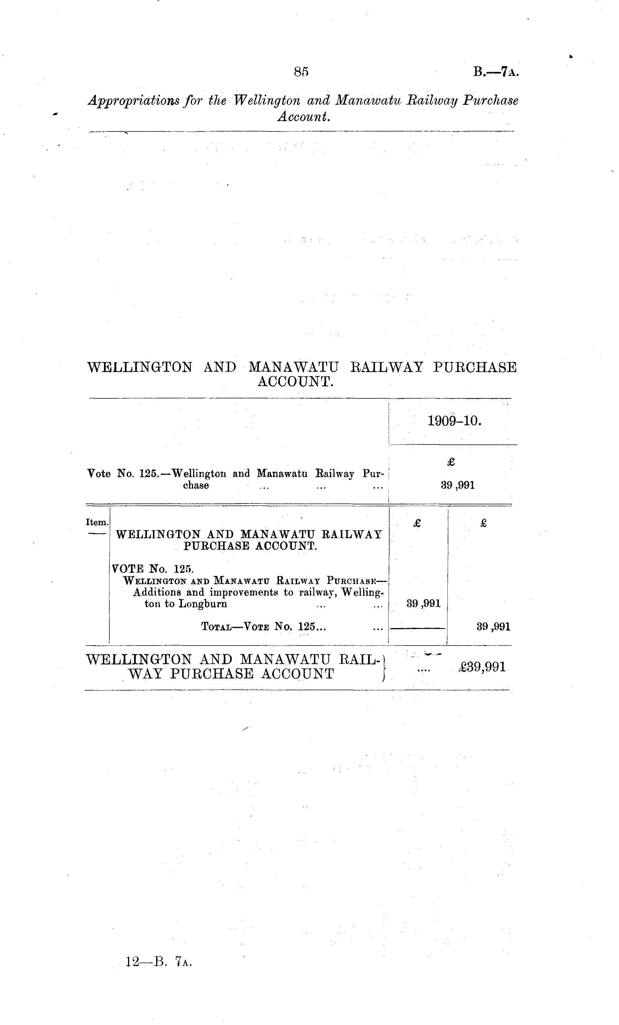 1909-10. Vote No. 125. —Wellington and Manawatu Railway Purchase 3! ,991 Item. £ WELLINGTON AND MANAWATU RAILWAY PURCHASE ACCOUNT. VOTE No. 125. Wellington and Manawatu Railway Purchase— Additions and improvements to railway, Wellington to Longburn 39 ,991 39 ,991 Total—Vote No. 125... ILLINGTON AND MANAWATU BAIL-) WAY PUBCHASE ACCOUNT J £39,991