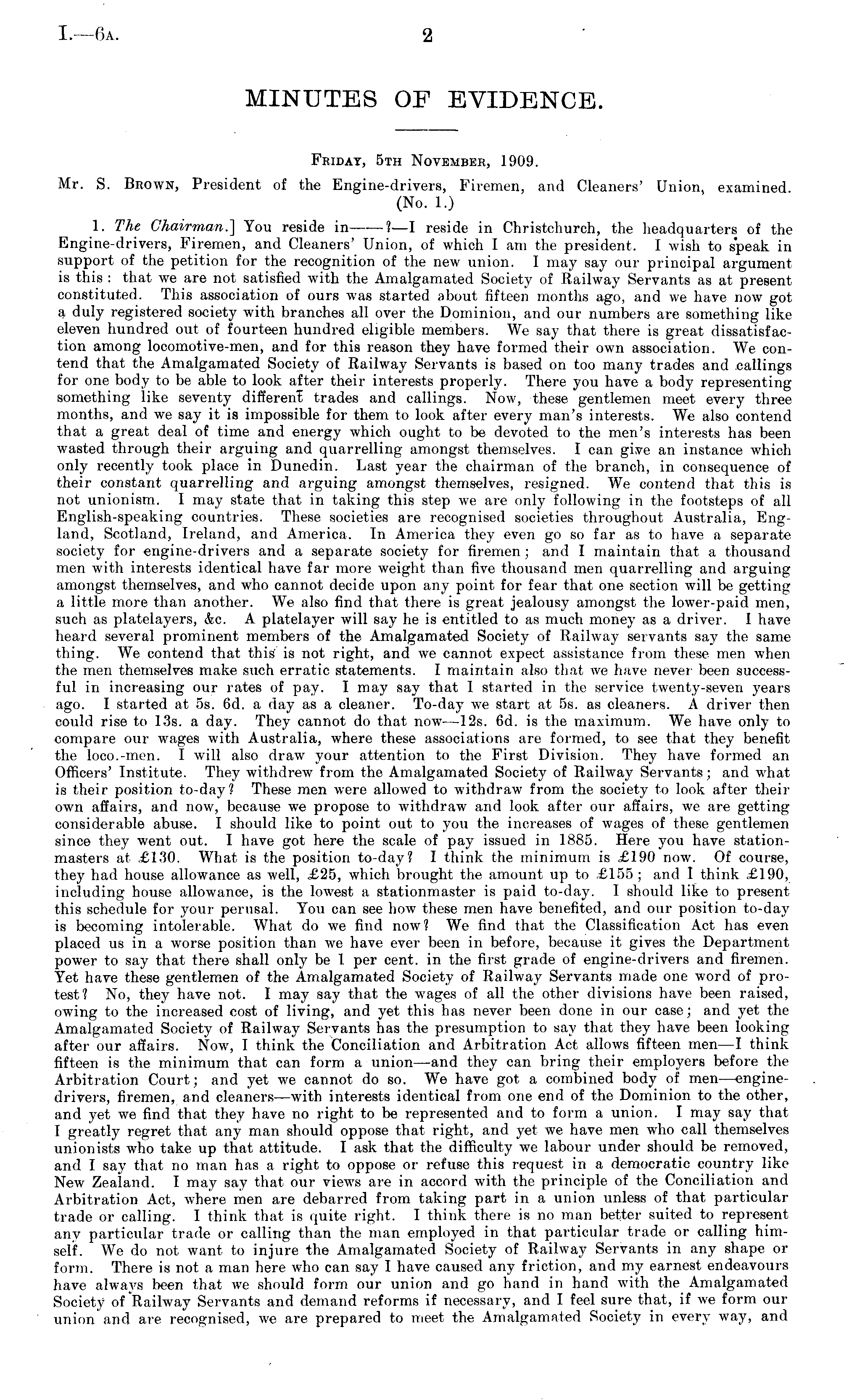 MINUTES OF EVIDENCE. Friday, sth November, 1909. Mr. S. Brown, President of the Engine-drivers, Firemen, and Cleaners' Union, examined (No. 1.) 1. The Chairman.] You reside in ?—I reside in Christchurch, the headquarters of the Engine-drivers, Firemen, and Cleaners' Union, of which lam the president. I wish to speak in support of the petition for the recognition of the new union. I may say our principal argument is this : that we are not satisfied with the Amalgamated Society of Railway Servants as at present constituted. This association of ours was started about fifteen months ago, and we have now got a duly registered society with branches all over the Dominion, and our numbers are something like eleven hundred out of fourteen hundred eligible members. We say that there is great dissatisfaction among locomotive-men, and for this reason they have formed their own association. We contend that the Amalgamated Society of Railway Servants is based on too many trades and callings for one body to be able to look after their interests properly. There you have a body representing something like seventy different: trades and callings. Now, these gentlemen meet every three months, and we say it is impossible for them to look after every man's interests. We also contend that a great deal of time and energy which ought to be devoted to the men's interests has been wasted through their arguing and quarrelling amongst themselves. I can give an instance which only recently took place in Dunedin. Last year the chairman of the branch, in consequence of their constant quarrelling and arguing amongst themselves, resigned. We contend that this is not unionism. I may state that in taking this step we are only following in the footsteps of all English-speaking countries. These societies are recognised societies throughout Australia, England, Scotland, Ireland, and America. In America they even go so far as to have a separate society for engine-drivers and a separate society for firemen; and I maintain that a thousand men with interests identical have far more weight than five thousand men quarrelling and arguing amongst themselves, and who cannot decide upon any point for fear that one section will be getting a little more than another. We also find that there is great jealousy amongst the lower-paid men, such as platelayers, &c. A platelayer will say he is entitled to as much money as a driver. I have heard several prominent members of the Amalgamated Society of Railway servants say the same thing. We contend that this is not right, and we cannot expect assistance from these men when the men themselves make such erratic statements. I maintain also that we have never been successful in increasing our rates of pay. I may say that I started in. the service twenty-seven years ago. I started at ss. 6d. a day as a cleaner. To-day we start at ss. as cleaners. A driver then could rise to 13s. a day. They cannot do that now —12s. 6d. is the maximum. We have only to compare our wages with Australia, where these associations are formed, to see that they benefit the loco.-men. I will also draw your attention to the First Division. They have formed an Officers' Institute. They withdrew from the Amalgamated Society of Railway Servants ; and what is their position to-day ? These men were allowed to withdraw from the society to look after their own affairs, and now, because we propose to withdraw and look after our affairs, we are getting considerable abuse. I should like to point out to you the increases of wages of these gentlemen since they went out. I have got here the scale of pay issued in 1885. Here you have stationmasters at £130. What is the position to-day? I think the minimum is £190 now. Of course, they had house allowance as well, £25, which brought the amount up to £155; and I think £190, including house allowance, is the lowest a stationmaster is paid to-day. I should like to present this schedule for your perusal. You can see how these men have benefited, and our position to-day is becoming intolerable. What do we find now? We find that the Classification Act has even placed us in a worse position than we have ever been in before, because it gives the Department power to say that there shall only be 1 per cent, in the first grade of engine-drivers and firemen. Yet have these gentlemen of the Amalgamated Society of Railway Servants made one word of protest? No, they have not. I may say that the wages of all the other divisions have been raised, owing to the increased cost of living, and yet this has never been done in our case; and yet the Amalgamated Society of Railway Servants has the presumption to say that they have been looking after our affairs. Now, I think the Conciliation and Arbitration Act allows fifteen men —I think fifteen is the minimum that can form a union—and they can bring their employers before the Arbitration Court; and yet we cannot do so. We have got a combined body of men —enginedrivers, firemen, and cleaners —with interests identical from one end of the Dominion to the other, and yet we find that they have no right to be represented and to form a union. I may say that I greatly regret that any man should oppose that right, and yet we have men who call themselves unionists who take up that attitude. I ask that the difficulty we labour under should be removed, and I say that no man has a right to oppose or refuse this request in a democratic country like New Zealand. I may say that our views are in accord with the principle of the Conciliation and Arbitration Act, where men are debarred from taking part in a union unless of that particular trade or calling. I think that is quite right. I think there is no man better suited to represent any particular trade or calling than the man employed in that particular trade or calling himselif. We do not want to injure the Amalgamated Society of Railway Servants in any shape or form. There is not a man here who can say I have cau