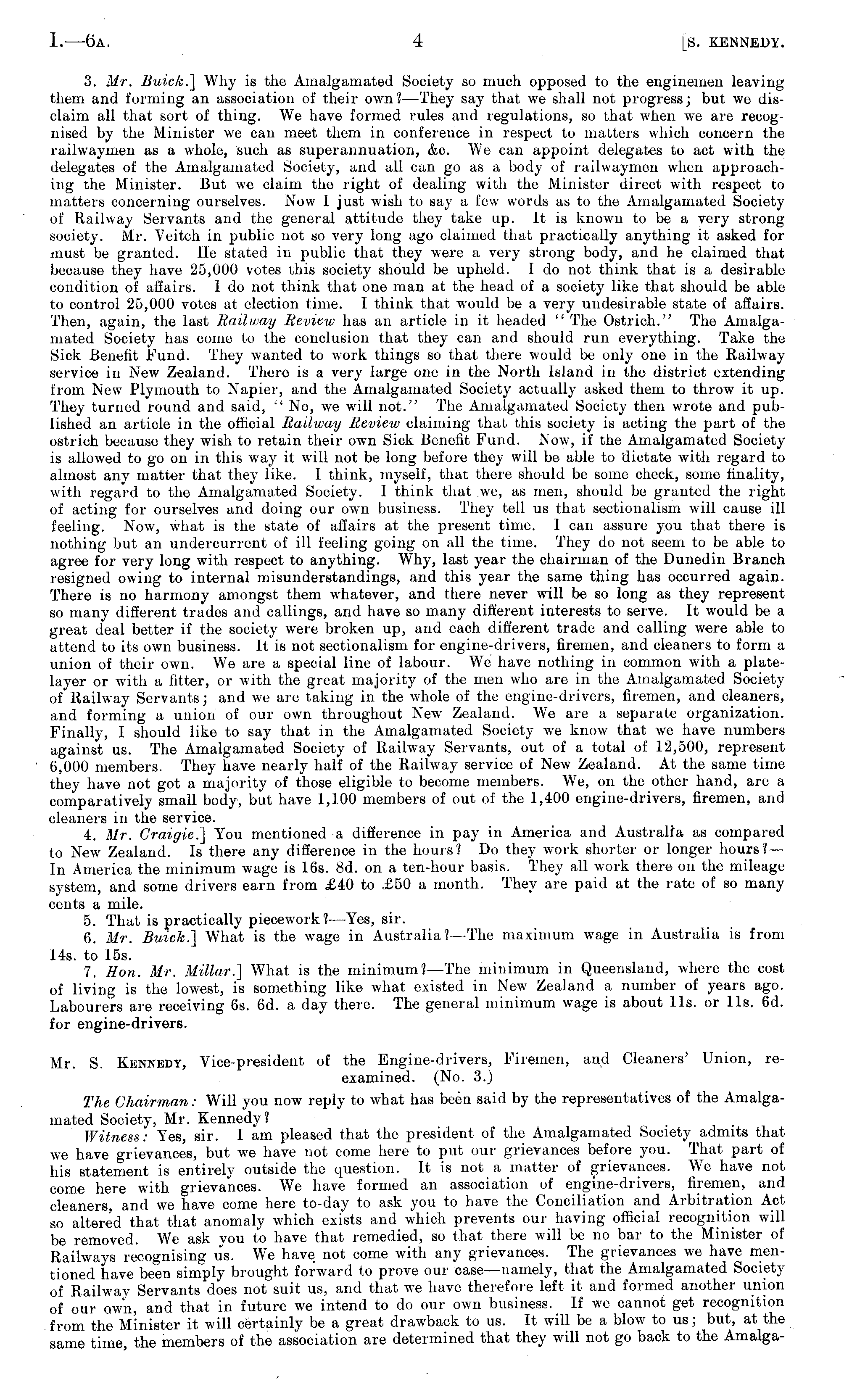 3. Mr. Buick.] Why is the Amalgamated Society so much opposed to the engiuemen leaving them and forming an association of their own?— They say that we shall not progress; but we disclaim all that sort of thing. We have formed rules and regulations, so that when we are recognised by the Minister we can meet them in conference in respect to matters which concern the railwaymen as a whole, such as superannuation, &c. We can appoint delegates to act with the delegates of the Amalgamated Society, and all can go as a body of railwaymen when approaching the Minister. But we claim the right of dealing with the Minister direct with respect to matters concerning ourselves. Now I just wish to say a few words as to the Amalgamated Society of Railway Servants and the general attitude they take up. It is known to be a very strong society. Mr. Veitch in public not so very long ago claimed that practically anything it asked for must be granted. He stated in public that they were a very strong body, and he claimed that because they have 25,000 votes this society should be upheld. I do not think that is a desirable condition of affairs. Ido not think that one man at the head of a society like that should be able to control 25,000 votes at election time. I think that would be a very undesirable state of affairs. Then, again, the last Railway Review has an article in it headed " The Ostrich." The Amalgamated Society has come to the conclusion that they can and should run everything. Take the Sick Benefit Fund. They wanted to work things so that there would be only one in the Railway service in New Zealand. There is a very large one in the North Island in the district extending from New Plymouth to Napier, and the Amalgamated Society actually asked them to throw it up. They turned round and said, " No, we will not." The Amalgamated Society then wrote and published an article in the official Railway Review claiming that this society is acting the part of the ostrich because they wish to retain their own Sick Benefit Fund. Now, if the Amalgamated Society is allowed to go on in this way it will not be long before they will be able to dictate with regard to almost any matter that they like. 1 think, myself, that there should be some check, some finality, with regard to the Amalgamated Society. I think that .we, as men, should be granted the right of acting for ourselves and doing our own business. They tell us that sectionalism will cause ill feeling. Now, what is the state of affairs at the present time. I can assure you that there is nothing but an undercurrent of ill feeling going on all the time. They do not seem to be able to agree for very long with respect to anything. Why, last year the chairman of the Dunedin Branch resigned owing to internal misunderstandings, and this year the same thing has occurred again. There is no harmony amongst them whatever, and there never will be so long as they represent so many different trades and callings, and have so many different interests to serve. It would be a great deal better if the society were broken up, and each different trade and calling were able to attend to its own business. It is not sectionalism for engine-drivers, firemen, and cleaners to form a union of their own. We are a special line of labour. We have nothing in common with a platelayer or with a fitter, or with the great majority of the men who are in the Amalgamated Society of Railway Servants; and we are taking in the whole of the engine-drivers, firemen, and cleaners, and forming a union of our own throughout New Zealand. We are a separate organization. Finally, 1 should like to say that in the Amalgamated Society we know that we have numbers against us. The Amalgamated Society of Railway Servants, out of a total of 12,500, represent 6,000 members. They have nearly half of the Railway service of New Zealand. At the same time they have not got a majority of those eligible to become members. We, on the other hand, are a comparatively small body, but have 1,100 members of out of the 1,400 engine-drivers, firemen, and cleaners in the service. 4. Mr. Graigie.] You mentioned a difference in pay in America and Australia as compared to New Zealand. Is there any difference in the hours? Do they work shorter or longer hours?— In America the minimum wage is 16s. Bd. on a ten-hour basis. They all work there on the mileage system, and some drivers earn from £40 to £50 a month. They are paid at the rate of so many cents a mile. 5. That is practically piecework? —Yes, sir. 6. Mr. Buick.] What is the wage in Australia? —The maximum wage in Australia is from 14s. to 15s. 7. Hon. Mr. Millar.] What is the minimum? —The minimum in Queensland, where the cost of living is the lowest, is something like what existed in New Zealand a number of years ago. Labourers are receiving 6s. 6d. a day there. The general minimum wage is about lis. or lis. 6d. for engine-drivers. Mr. S. Kennedy, Vice-president of the Engine-drivers, Firemen, and Cleaners' Union, reexamined. (No. 3.) The Chairman: Will you now reply to what has been said by the representatives of the Amalgamated Society, Mr. Kennedy? Witness: Yes, sir. lam pleased that the president of the Amalgamated Society admits that we have grievances, but we have not come here to put our grievances before you. That part of his statement is entirely outside the question. It is not a matter of grievances. We have not come here with grievances. We have formed an association of engine-drivers, firemen, and cleaners, and we have come here to-day to ask you to have the Conciliation and Arbitration Act so altered that that anomaly which exists and which prevents our having official recognition will be removed. We ask you to have that remedied, so that there will be no bar to the Minister of Railways recognising us. We have not come with any grievances. The grievances we have mentioned have been simply brought forward to prove our case —uamely, that the Amalgamated Soci