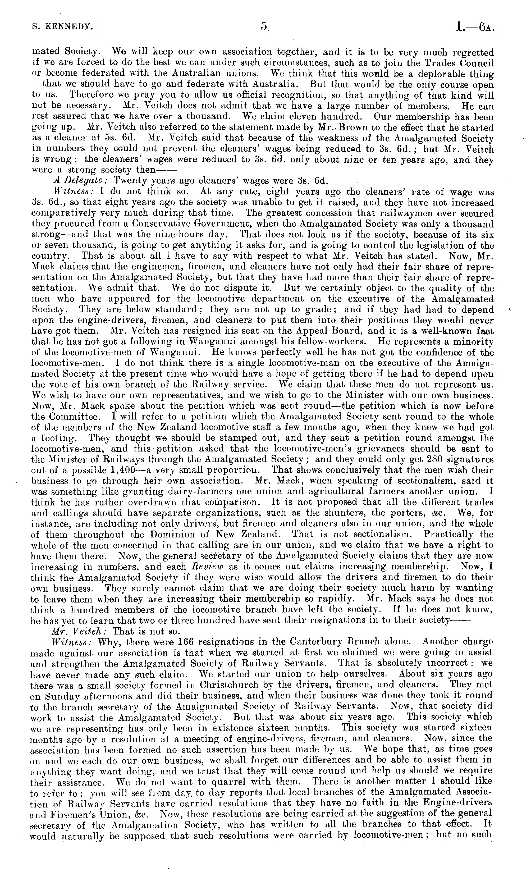 mated Society. We will keep our own association together, and it is to be very much regretted if we are forced to do the best we can under such circumstances, such as to join the Trades Council or become federated with the Australian unions. We think that this would be a deplorable thing —that we should have to go and federate with Australia. But that would be the only course open to us. Therefore we pray you to allow us official recognition, so that anything of that kind will not be necessary. Mr. Veitch does not admit that we have a large number of members. He can rest assured that we have over a thousand. We claim eleven hundred. Our membership has been going up. Mr. Veitch also referred to the statement made by Mr.. Brown to the effect that he started as a cleaner at ss. 6d. Mr. Veitch said that because of the weakness of the Amalgamated Society in numbers they could not prevent the cleaners' wages being reduced to 3s. 6d.; but Mr. Veitch is wrong : the cleaners' wages were reduced to 3s. 6d. only about nine or ten years ago, and they were a strong society then A Delegate: Twenty years ago cleaners' wages were 3s. 6d. Witness: I do not think so. At any rate, eight years ago the cleaners' rate of wage was 3s. 6d., so that eight years ago the society was unable to get it raised, and they have not increased comparatively very much during that time. The greatest concession that railwaymen ever secured they procured from a Conservative Government, when the Amalgamated Society was only a thousand strong —and that was the nine-hours day. That does not look as if the society, because of its six or seven thousand, is going to get anything it asks for, and is going to control the legislation of the country. That is about all 1 have to say with respect to what Mr. Veitch has stated. Now, Mr. Mack claims that the enginemen, firemen, and cleaners have not only had their fair share of representation on the Amalgamated Society, but that they have had more than their fair share of representation. We admit that. We do not dispute it. But we certainly object to the quality of the men who have appeared for the locomotive department on the executive of the Amalgamated Society. They are below standard; they are not up to grade; and if they had had to depend upon the engine-drivers, firemen, and cleaners to put them into their positions they would never have got them. Mr. Veitch has resigned his seat on the Appeal Board, and it is a well-known fact that he has not got a following in Wanganui amongst his fellow-workers. He represents a minority of the locomotive-men of Wanganui. He knows perfectly well he has not got the confidence of the locomotive-men. Ido not think there is a single locomotive-man on the executive of the Amalgamated Society at the present time who would have a hope of getting there if he had to depend upon the vote of his own branch of the Railway service. We claim that these men do not represent us. We wish to have our own representatives, and we wish to go to the Minister with our own business. Now, Mr. Mack spoke about the petition which was sent round—the petition which is now before the Committee. I will refer to a petition which the Amalgamated Society sent round to the whole of the members of the New Zealand locomotive staff a few months ago, when they knew we had got a footing. They thought we should be stamped out, and they sent a petition round amongst the locomotive-men, and this petition asked that the locomotive-men's grievances should be sent to the Minister of Railways through the Amalgamated Society; and they could only get 280 signatures out of a possible 1,400 —a very small proportion. That shows conclusively that the men wish their business to go through heir own association. Mr. Mack, when speaking of sectionalism, said it was something like granting dairy-farmers one union and agricultural farmers another union. 1 think he has rather overdrawn that comparison. It is not proposed that all the different trades and callings should have separate organizations, such as the shunters, the porters, &c. We, for instance, are including not only drivers, but firemen and cleaners also in our union, and the whole of them throughout the Dominion of New Zealand. That is not sectionalism. Practically the whole of the men concerned in that calling are in our union, and we claim that we have a right to have them there. Now, the general secretary of the Amalgamated Society claims that they are now increasing in numbers, and each Review as it comes out claims increasing membership. Now, 1 think the Amalgamated Society if they were wise would allow the drivers and firemen to do their own business. They surely cannot claim that we are doing their society much harm by wanting to leave them when they are increasing their membership so rapidly. Mr. Mack says he does not think a hundred members of the locomotive branch have left the society. If he does not know, he has yet to learn that two or three hundred have sent their resignations in to their society Mr. Veitch: That is not so. Witness: Why, there were 166 resignations in the Canterbury Branch alone. Another charge made against our association is that when we started at first we claimed we were going to assist and strengthen the Amalgamated Society of Railway Servants. That is absolutely incorrect : we have never made any such claim. We started our union to help ourselves. About six years ago there was a small society formed in Christchurch by the drivers, firemen, and cleaners. They met on Sunday afternoons and did their business, and when their business was done they took it round to the branch secretary of the Amalgamated Society of Railway Servants. Now, that society did work to assist the Amalgamated Society. But that was about six years ago. This society which we are representing has only been in existence sixteen months. This society was started sixteen months ago by a resolution at a meeting of engine-drivers, firemen, a