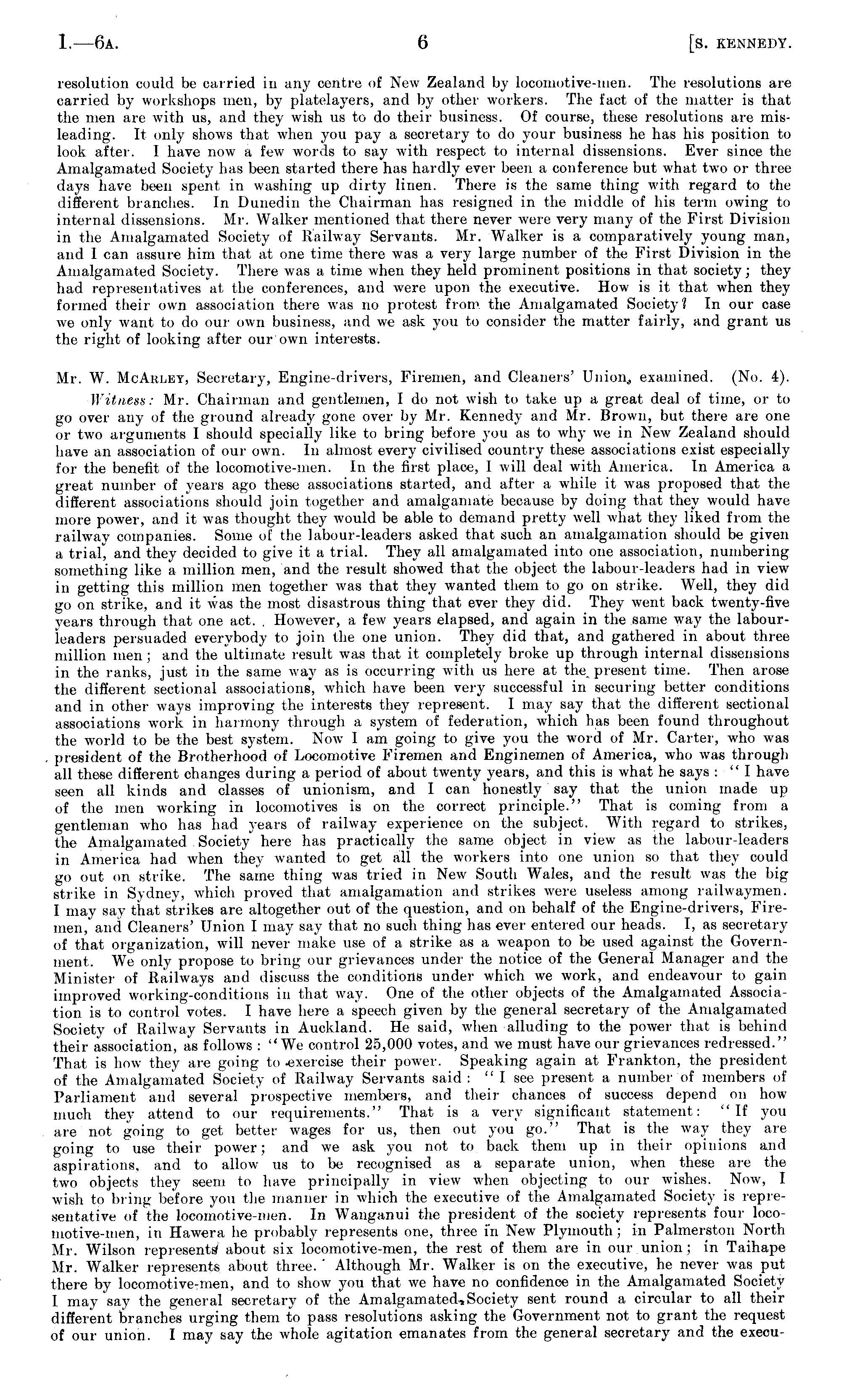 resolution could be carried in any centre of New Zealand by loconiotive-ineii. The resolutions are carried by workshops men, by platelayers, and by other workers. The fact of the matter is that the men are with us, and they wish us to do their business. Of course, these resolutions are misleading. It only shows that when you pay a secretary to do your business he has his position to look after. I have now a few words to say with respect to internal dissensions. Ever since the Amalgamated Society has been started there has hardly ever been a conference but what two or three days have been spent in washing up dirty linen. There is the same thing with regard to the different branches. In Dunedin the Chairman has resigned in the middle of his term owing to internal dissensions. Mr. Walker mentioned that there never were very many of the First Division in the Amalgamated Society of Railway Servants. Mr. Walker is a comparatively young man, and I can assure him that at one time there was a very large number of the First Division in the Amalgamated Society. There was a time when they held prominent positions in that society; they had representatives at the conferences, and were upon the executive. How is it that when they formed their own association there was no protest from the Amalgamated Society? In our case we only want to do our own business, and we ask you to consider the matter fairly, and grant us the right of looking after our own interests. Mr. W. McAhley, Secretary, Engine-drivers, Firemen, and Cleaners' Union, examined. (No. 4). Witness: Mr. Chairman and gentlemen, I do not wish to take up a great deal of time, or to go over any of the ground already gone over by Mr. Kennedy and Mr. Brown, but there are one or two arguments I should specially like to bring before you as to why we in New Zealand should have an association of our own. In almost every civilised country these associations exist especially for the benefit of the locomotive-men. In the first place, I will deal with America. In America a great number of years ago these associations started, and after a while it was proposed that the different associations should join together and amalgamate because by doing that they would have more power, and it was thought they would be able to demand pretty well what they liked from the railway companies. Some of the labour-leaders asked that such an amalgamation should be given a trial, and they decided to give it a trial. They all amalgamated into one association, numbering something like a million men, and the result showed that the object the labour-leaders had in view in getting this million men together was that they wanted them to go on strike. Well, they did go on strike, and it was the most disastrous thing that ever they did. They went back twenty-five years through that one act. , However, a few years elapsed, and again in the same way the labourleaders persuaded everybody to join the one union. They did that, and gathered in about three million men; and the ultimate result was that it completely broke up through internal dissensions in the ranks, just in the same way as is occurring with us here at the. present time. Then arose the different sectional associations, which have been very successful in securing better conditions and in other ways improving the interests they represent. I may say that the different sectional associations work in harmony through a system of federation, which has been found throughout the world to be the best system. Now lam going to give you the word of Mr. Carter, who was president of the Brotherhood of Locomotive Firemen and Enginemen of America, who was through all these different changes during a period of about twenty years, and this is what he says : "I have seen all kinds and classes of unionism, and I can honestly say that the union made up of the men working in locomotives is on the correct principle." That is coming from a gentleman who has had years of railway experience on the subject. With regard to strikes, the Amalgamated Society here has practically the same object in view as the labour-leaders in America had when they wanted to get all the workers into one union so that they could go out on strike. The same thing was tried in New South Wales, and the result was the big strike in Sydney, which proved that amalgamation and strikes were useless among railwaymen. I may say that strikes are altogether out of the question, and on behalf of the Engine-drivers, Firemen, and Cleaners' Union I may say that no such thing has ever entered our heads. I, as secretary of that organization, will never make use of a strike as a weapon to be used against the Government. We only propose to bring our grievances under the notice of the General Manager and the Minister of Railways ami discuss the conditions under which we work, and endeavour to gain improved working-conditions in that way. One of the other objects of the Amalgamated Association is to control votes. I have here a speech given by the general secretary of the Amalgamated Society of Railway Servants in Auckland. He said, when alluding to the power that is behind their association, as follows : "We control 25,000 votes, and we must have our grievances redressed." That is how they are going to -exercise their power. Speaking again at Frankton, the president of the Amalgamated Society of Railway Servants said : " I see present a number of members of Parliament and several prospective members, and their chances of success depend on how much they attend to our requirements." That is a very significant statement: "If you are not going to get better wages for us, then out you go." That is the way they tire going to use their power; and we ask you not to back them up in their opinions and aspirations, and to allow us to be recognised as a separate union, when these are the two objects they seem to have principally in view when objecting to our wishes. Now, I wish to bring before you the manner i