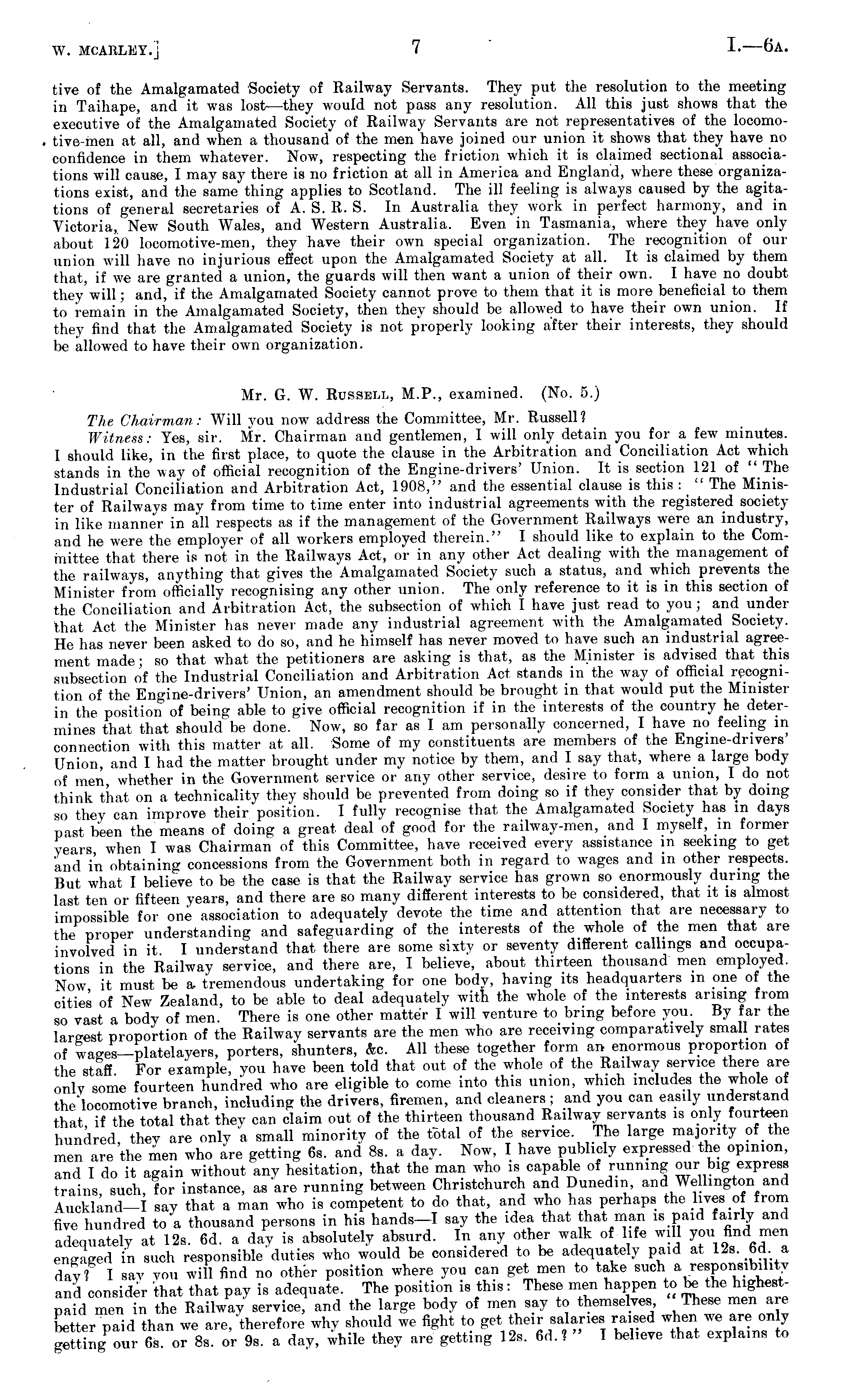 tive of the Amalgamated Society of Railway Servants. They put the resolution to the meeting in Taihape, and it was lost—they would not pass any resolution. All this just shows that the executive of the Amalgamated Society of Railway Servants are not representatives of the locomo-tive-men at all, and when a thousand of the men have joined our union it shows that they have no confidence in them whatever. Now, respecting the friction which it is claimed sectional associations will cause, I may say there is no friction at all in America and England, where these organizations exist, and the same thing applies to Scotland. The ill feeling is always caused by the agitations of general secretaries of A. S. R. S. In Australia they work in perfect harmony, and in Victoria, New South Wales, and Western Australia. Even in Tasmania, where they have only about 120 locomotive-men, they have their own special organization. The recognition of our union will have no injurious effect upon the Amalgamated Society at all. It is claimed by them that, if we are granted a union, the guards will then want a union of their own. I have no doubt they will; and, if the Amalgamated Society cannot prove to them that it is more beneficial to them to remain in the Amalgamated Society, then they should be allowed to have their own union. If they find that the Amalgamated Society is not properly looking after their interests, they should be allowed to have their own organization. Mr. G. W. Russell, M.P., examined. (No. 5.) The Chairman: Will you now address the Committee, Mr. Russell? Witness: Yes, sir. Mr. Chairman and gentlemen, I will only detain you for a few minutes. I should like, in the first place, to quote the clause in the Arbitration and Conciliation Act which stands in the way of official recognition of the Engine-drivers' Union. It is section 121 of "The Industrial Conciliation and Arbitration Act, 1908," and the essential clause is this : " The Minister of Railways may from time to time enter into industrial agreements with the registered society in like manner in all respects as if the management of the Government Railways were an industry, and he were the employer of all workers employed therein." I should like to explain to the Committee that there is not in the Railways Act, or in any other Act dealing with the management of the railways, anything that gives the Amalgamated Society such a status, and which prevents the Minister from officially recognising any other union. The only reference to it is in this section of the Conciliation and Arbitration Act, the subsection of which I have just read to you; and under that Act the Minister has never made any industrial agreement with the Amalgamated Society. He has never been asked to do so, and he himself has never moved to have such an industrial agreement made; so that what the petitioners are asking is that, as the Minister is advised that this subsection of the Industrial Conciliation and Arbitration Act stands in the way of official recognition of the Engine-drivers' Union, an amendment should be brought in that would put the Minister in the position of being able to give official recognition if in the interests of the country he determines that that should be done. Now, so far as lam personally concerned, I have no feeling in connection with this matter at all. Some of my constituents are members of the Engine-drivers' Union, and I had the matter brought under my notice by them, and I say that, where a large body of men whether in the Government service or any other service, desire to form a union, I do not think that on a technicality they should be prevented from doing so if they consider that by doing so they can improve their position. I fully recognise that the Amalgamated Society has in days past been the means of doing a great deal of good for the railway-men, and I myself, in former years when I was Chairman of this Committee, have received every assistance in seeking to get and in obtaining concessions from the Government both in regard to wages and in other respects. But what I believe to be the case is that the Railway service has grown so enormously during the last ten or fifteen years, and there are so many different interests to be considered, that it is almost impossible for one association to adequately devote the time and attention that are necessary to the proper understanding and safeguarding of the interests of the whole of the men that are involved in it I understand that there are some sixty or seventy different callings and occupations in the Railway service, and there are, I believe, about thirteen thousand men employed. Now it must be a tremendous undertaking for one body, having its headquarters in one of the cities of New Zealand, to be able to deal adequately with the whole of the interests arising from so vast a body of men. There is one other matter I will venture to bring before you By tar the lareest proportion of the Railway servants are the men who are receiving comparatively small rates of wages—Platelayers, porters, shunters, &c. All these together form an enormous proportion of the staff For example, you have been told that out of the whole of the Railway service there are only some fourteen hundred who are eligible to come into this union, which includes the whole ot the locomotive branch, including the drivers, firemen, and cleaners; and you can easily understand that if the total that they can claim out of the thirteen thousand Railway servants is only fourteen hundred, they are only a small minority of the total of the service The large majority of the men are the men who are getting 6s. and Bs. a day. Now, I have publicly expressed the opinion, and I do it again without any hesitation, that the man who is capable of running our big express trains such, for instance, as are running between Christchurch and Dunedin and Wellington and Auckland—l say that a man who is competent to do that, and who has perhaps