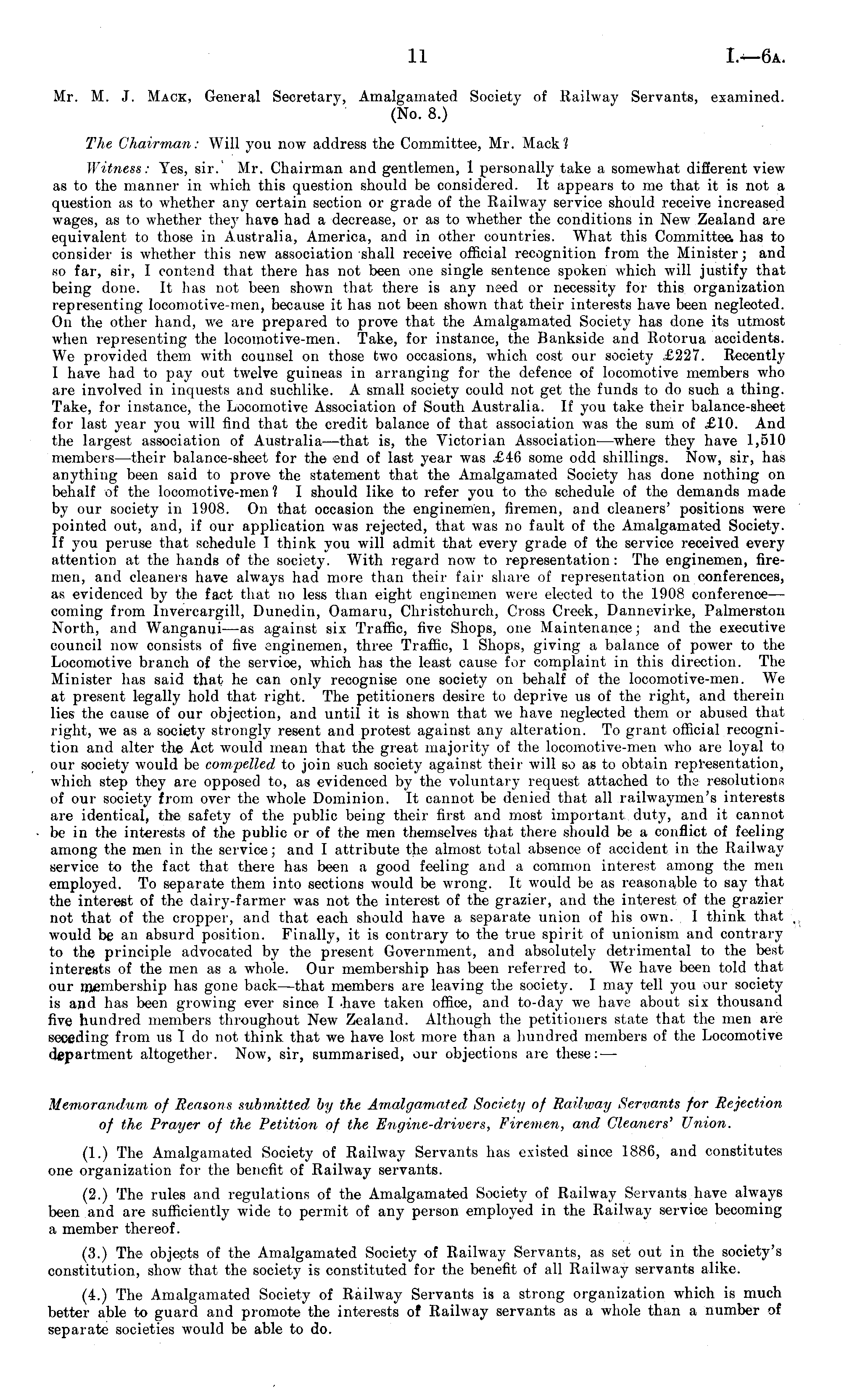 Mr. M. J. Mack, General Secretary, Amalgamated Society of Railway Servants, examined. (No. 8.) The Chairman: Will you now address the Committee, Mr. Mack? Witness: Y 7 es, sir.' Mr. Chairman and gentlemen, 1 personally take a somewhat different view as to the manner in which this question should be considered. It appears to me that it is not a question as to whether any certain section or grade of the Railway service should receive increased wages, as to whether they have had a decrease, or as to whether the conditions in New Zealand are equivalent to those in Australia, America, and in other countries. What this Committee has to consider is whether this new association shall receive official recognition from the Minister; and so far, sir, I contend that there has not been one single sentence spoken which will justify that being done. It has not been shown that there is any need or necessity for this organization representing locomotive-men, because it has not been shown that their interests have been neglected. On the other hand, we are prepared to prove that the Amalgamated Society has done its utmost when representing the locomotive-men. Take, for instance, the Bankside and Rotorua accidents. We provided them with counsel on those two occasions, which cost our society £227. Recently I have had to pay out twelve guineas in arranging for the defence of locomotive members who are involved in inquests and suchlike. A small society could not get the funds to do such a thing. Take, for instance, the Locomotive Association of South Australia. If you take their balance-sheet for last year you will find that the credit balance of that association was the sum of £10. And the largest association of Australia —that is, the Victorian Association —where they have 1,510 members —their balance-sheet for the end of last year was £46 some odd shillings. Now, sir, has anything been said to prove the statement that the Amalgamated Society has done nothing on behalf of the locomotive-men ? I should like to refer you to the schedule of the demands made by our society in 1908. On that occasion the enginemen, firemen, and cleaners' positions were pointed out, and, if our application was rejected, that was no fault of the Amalgamated Society. If you peruse that schedule I think you will admit that every grade of the service received every attention at the hands of the society. With regard now to representation : The enginemen, firemen, and cleaners have always had more than their fair share of representation on conferences, as evidenced by the fact that no less than eight enginemen were elected to the 1908 conference — coming from Invercargill, Dunedin, Oamaru, Christchurch, Cross Creek, Dannevirke, Palmerston North, and Wanganui—as against six Traffic, five Shops, one Maintenance; and the executive council now consists of five enginemen, three Traffic, 1 Shops, giving a balance of power to the Locomotive branch of the service, which has the least cause for complaint in this direction. The Minister has said that he can only recognise one society on behalf of the locomotive-men. We at present legally hold that right. The petitioners desire to deprive us of the right, and therein lies the cause of our objection, and until it is shown that we have neglected them or abused that right, we as a society strongly resent and protest against any alteration. To grant official recognition and alter the Act would mean that the great majority of the locomotive-men who are loyal to our society would be compelled to join such society against their will so as to obtain representation, which step they are opposed to, as evidenced by the voluntary request attached to the resolutions of our society from over the whole Dominion. It cannot be denied that all railwaymen's interests are identical, the safety of the public being their first and most important duty, and it cannot be in the interests of the public or of the men themselves that there should be a conflict of feeling among the men in the service; and I attribute the almost total absence of accident in the Railway service to the fact that there has been a good feeling and a common interest among the men employed. To separate them into sections would be wrong. It would be as reasonable to say that the interest of the dairy-farmer was not the interest of the grazier, and the interest of the grazier not that of the cropper, and that each should have a separate union of his own. I think that would be an absurd position. Finally, it is contrary to the true spirit of unionism and contrary to the principle advocated by the present Government, and absolutely detrimental to the best interests of the men as a whole. Our membership has been referred to. We have been told that our membership has gone back—that members are leaving the society. I may tell you our society is and has been growing ever since I have taken office, and to-day we have about six thousand five hundred members throughout New Zealand. Although the petitioners state that the men are seceding from us 1 do not think that we have lost more than a hundred members of the Locomotive department altogether. Now, sir, summarised, our objections are these: — Memorandum of Reasons submitted, by the Amalgamated Society of Railway Servants for Rejection of the Prayer of the Petition of the Engine-drivers, Firemen, and Cleaners' Union. (1.) The Amalgamated Society of Railway Servants has existed since 1886, and constitutes one organization for the benefit of Railway servants. (2.) The rules and regulations of the Amalgamated Society of Railway Servants have always been and are sufficiently wide to permit of any person employed in the Railway service becoming a member thereof. (3.) The objects of the Amalgamated Society of Railway Servants, as set out in the society's constitution, show that the society is constituted for the benefit of all Railway servants alike. (4.) The Amalgamated Society of Railway Servants 