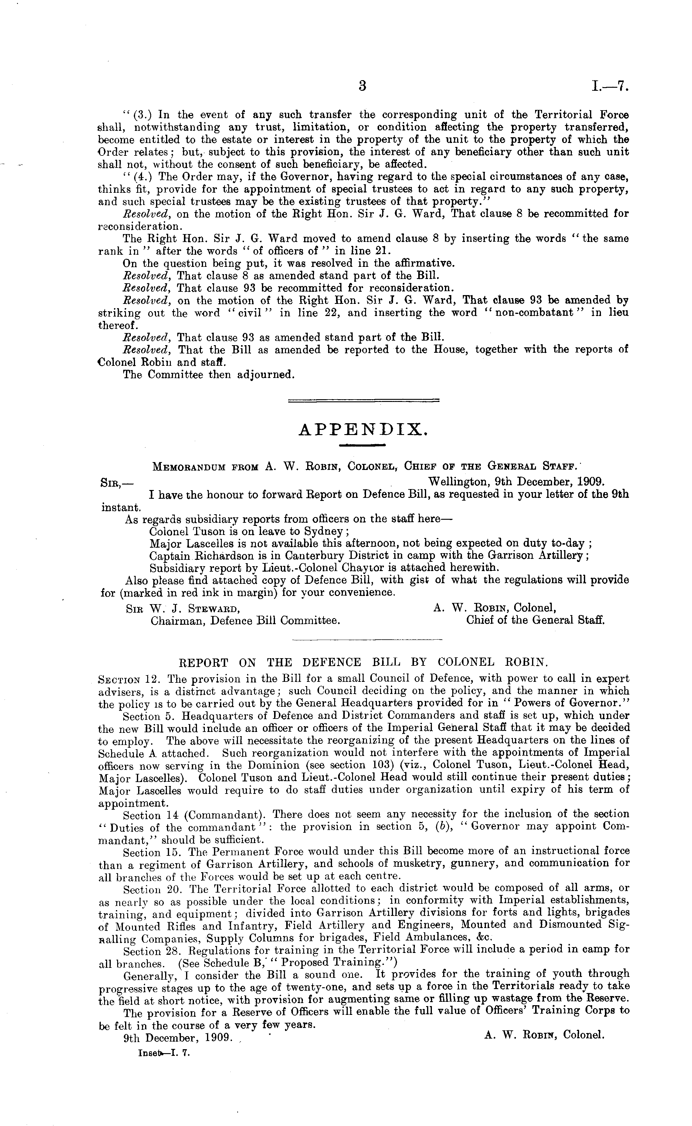 " (3.) In the event of any such transfer the corresponding unit of the Territorial Force shall, notwithstanding any trust, limitation, or condition affecting the property transferred, become entitled to the estate or interest in the property of the unit to the property of which the Order relates; but, subject to this provision, the interest of any beneficiary other than such unit shall not, without the consent of such beneficiary, be affected. " (4.) The Order may, if the Governor, having regard to the special circumstances of any case, thinks ifit, provide for the appointment of special trustees to act in regard to any such property, and such special trustees may be the existing trustees of that property." Resolved, on the motion of the Right Hon. Sir J. G. Ward, That clause 8 be recommitted for reconsideration. The Right Hon. Sir J. G. Ward moved to amend clause 8 by inserting the words " the same rank in " after the words " of officers of " in line 21. On the question being put, it was resolved in the affirmative. Resolved, That clause 8 as amended stand part of the Bill. Resolved, That clause 93 be recommitted for reconsideration. Resolved, on the motion of the Right Hon. Sir J. G. Ward, That clause 93 be amended by striking out the word "civil" in line 22, and inserting the word "non-combatant" in lieu thereof. Resolved, That clause 93 as amended stand part of the Bill. Resolved, That the Bill as amended be reported to the House, together with the reports of Colonel Robin and staff. The Committee then adjourned.